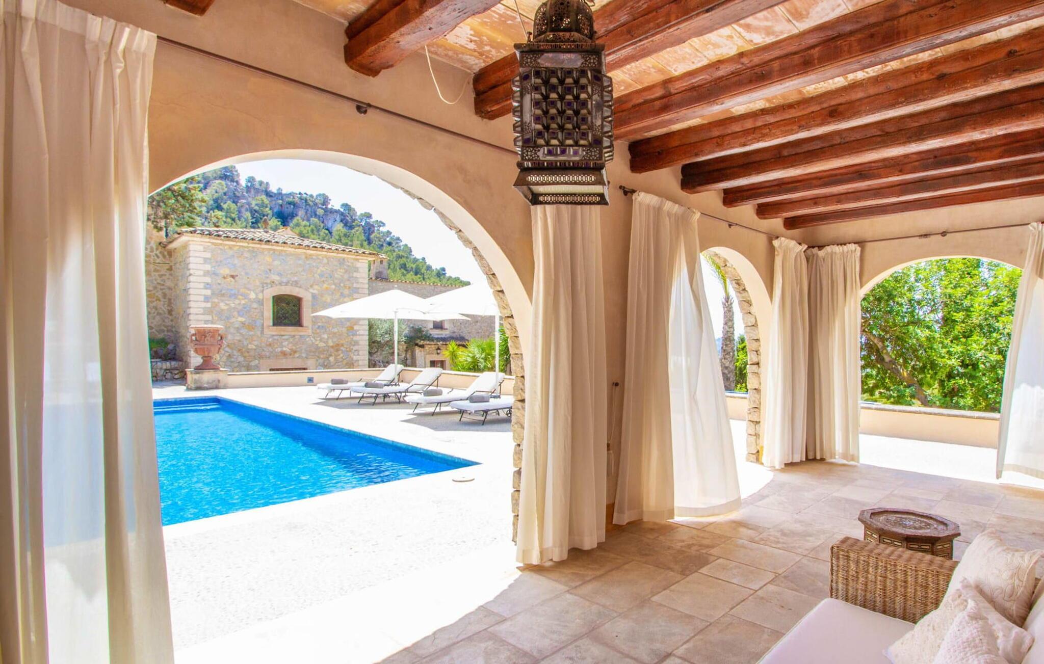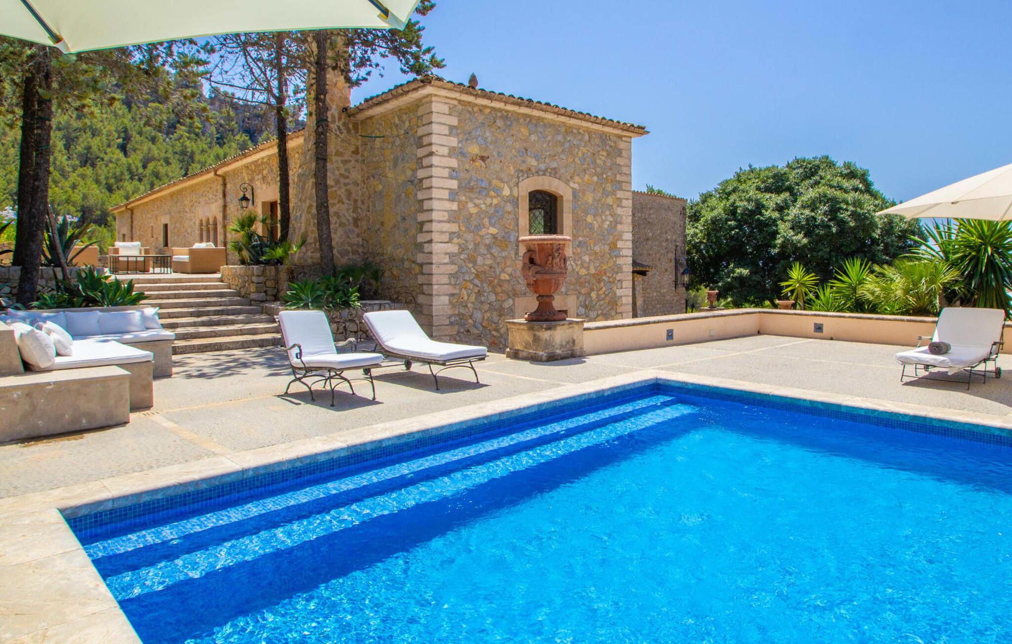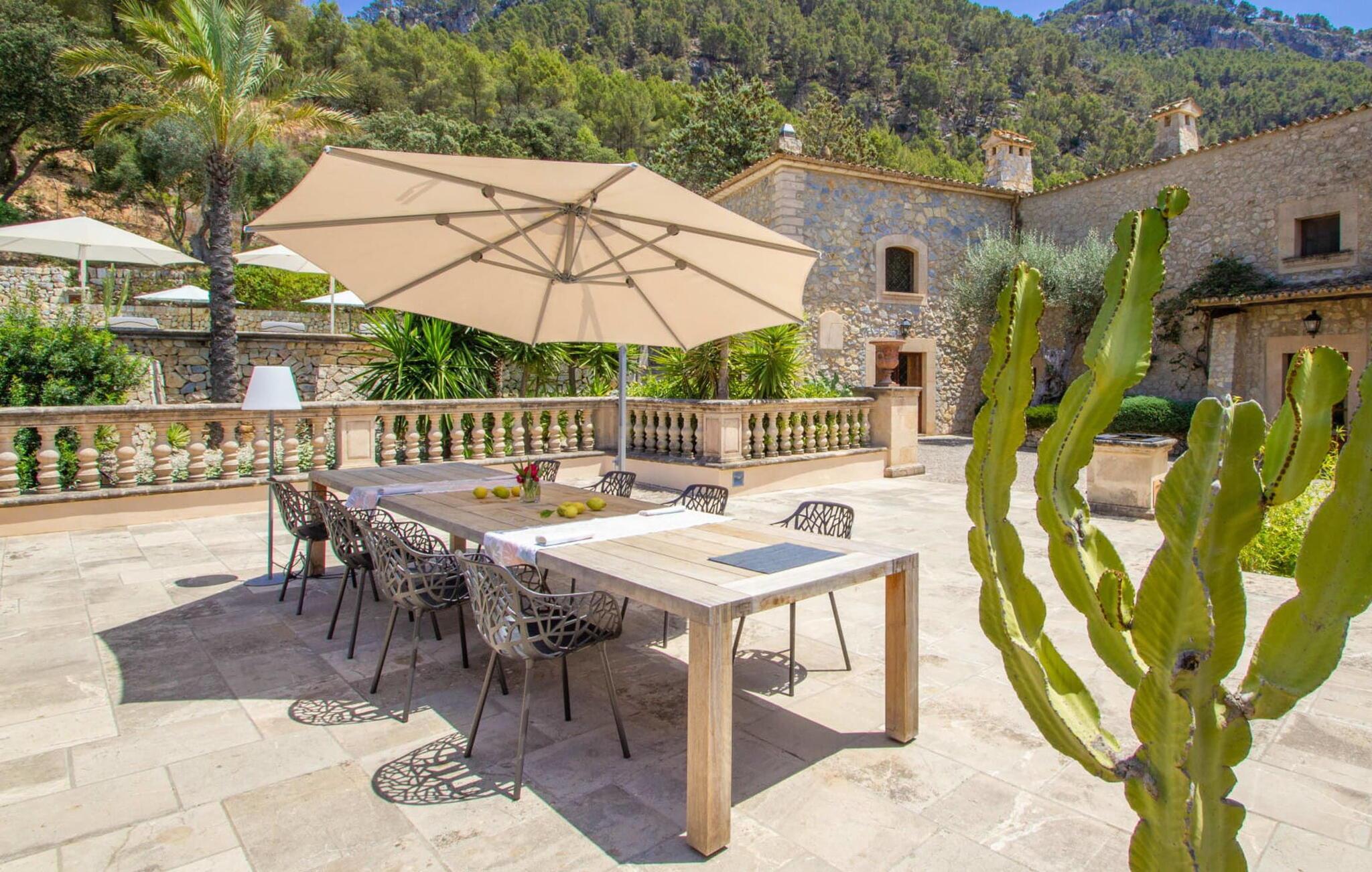 Dieses wunderschöne, luxuriöse Anwesen befindet sich auf einem erhöhten Grundstück in fabelhafter abgelegener Lage oberhalb von Andratx, einem Berggrundstück mit fantastischem Blick auf die umliegende Landschaft bis hin zum Meer. Das perfektionistische Design dieses 60.000 m² großen Grundstücks mit seiner parkähnlichen Gartenanlage ist absolut beeindruckend und bietet den Gästen der Villa „Andratx“ einen idyllischen Rückzugsort für einen erholsamen Urlaub. Im bezaubernden Garten können Sie nach Lust und Laune schlendern und die Ruhe genießen. Es finden sich zahlreiche einladende Rückzugsorte, etwa die Outdoor-Lounge mit den XXL-Sofamöbeln und Blick auf die Wasserspiele im Garten. Der wechselnde Stil des Gebäudekomplexes und seine Vollsteinbauweise verleihen ihm einen gewissen herrschaftlichen Charakter, der durch die kunstvolle Gestaltung mit verschiedenen Torbögen und Säulen unterstrichen wird. Eine weitläufige Terrassenlandschaft über mehrere Ebenen verbindet die Residenzen und bietet viele einladende Sitz- und Liegebereiche, um es sich mit einem guten Buch gemütlich zu machen oder einfach nur die Seele baumeln zu lassen und vor einer malerischen Kulisse zu entspannen. Für gemeinsame Mahlzeiten unter freiem Himmel stehen ein großer Esstisch mit Stühlen und ein Außengrill zur Verfügung. Planen Sie ein Barbecue mit Freunden und genießen Sie einen Feiertagsabend. Der 14 m lange und 4 m breite Pool auf einer der höchsten Terrassen vermittelt ein Gefühl von absolutem Luxus. Neben einem privaten Poolhaus mit Außendusche und separater Toilette erwarten Sie hier äußerst bequeme Sonnenliegen. Entspannen Sie sich und nehmen Sie ein Sonnenbad nach einem erfrischenden Bad. Der Ausblick von dieser eleganten Terrasse ist einfach himmlisch, ein Balsam für die Seele.