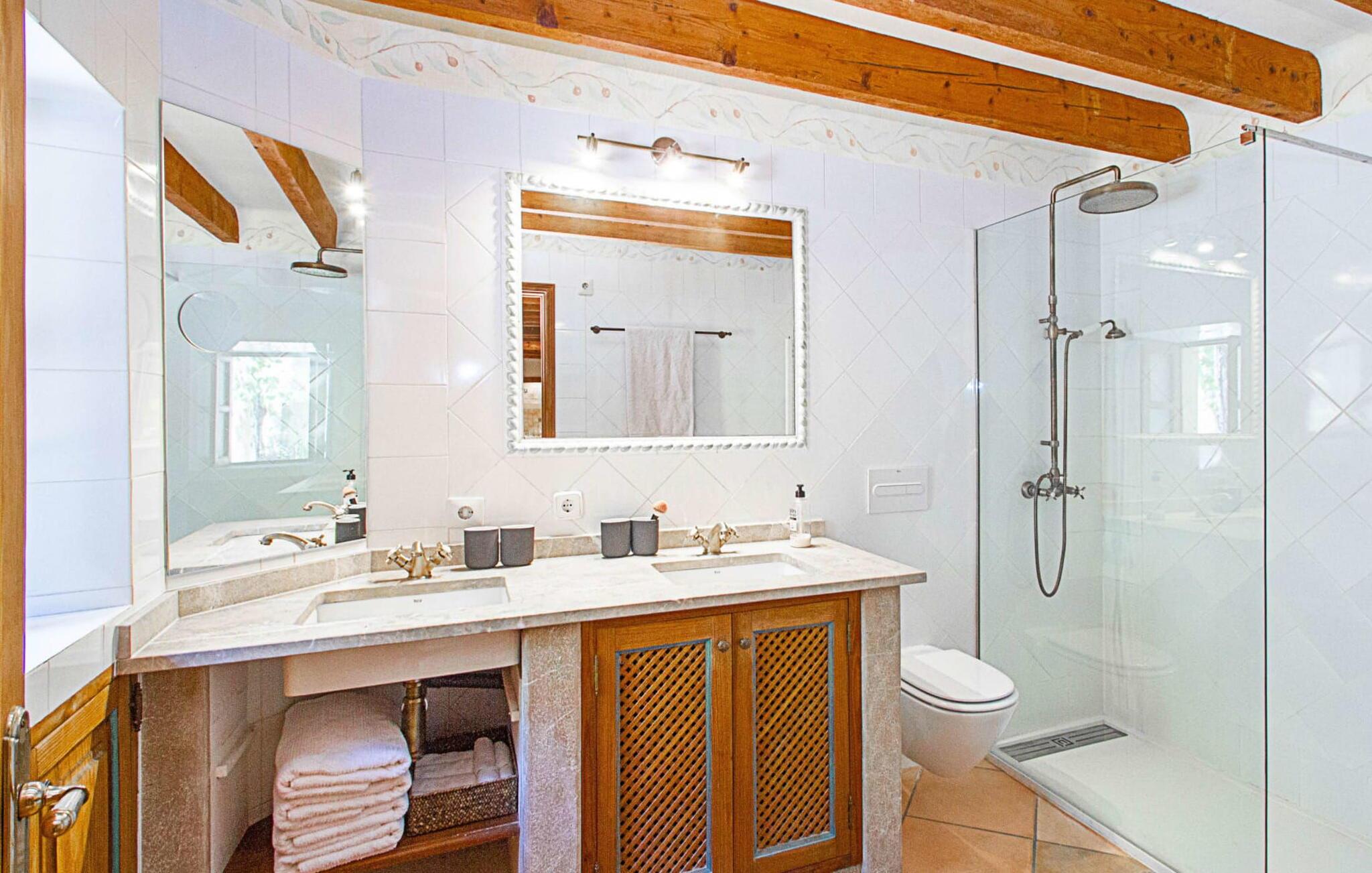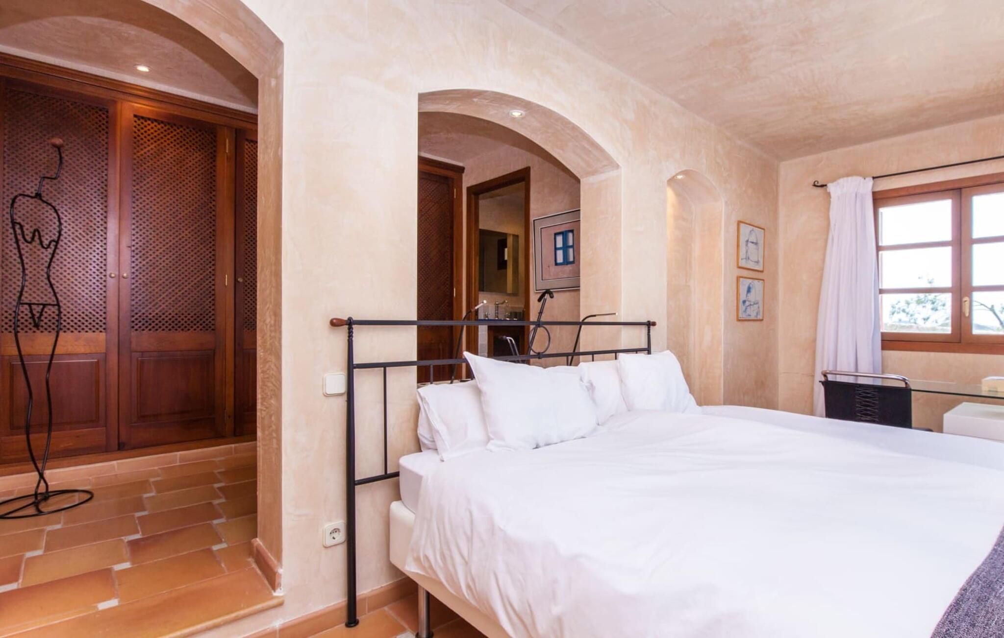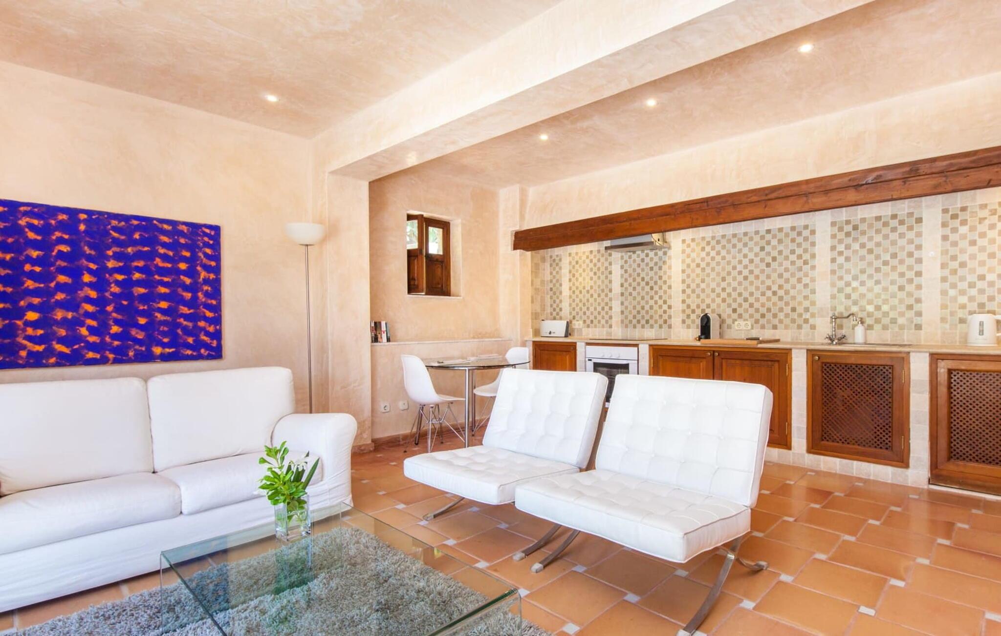 Mit geschmackvoller, gemütlicher Ausstattung punktet die Villa „Andratx“ zudem mit insgesamt 315 m² Wohnfläche verteilt auf drei separate Gebäude. Die Räumlichkeiten wurden 2005 komplett renoviert und verfügen daher über moderne Einrichtungen mit dem typisch mallorquinischen Flair, das diesen Ort so liebenswert macht. Mit nostalgischen Accessoires, Decken mit traditionellen Holzbalken, schöner Beleuchtung und gemütlichen Möbeln verfügen die Ferienhäuser über eine sehr ästhetische Innenatmosphäre. Die beiden größeren Häuser verfügen jeweils über 120 m² Wohnfläche, während die kleinere Villa über 75 m² verfügt. Jedes Gebäude verfügt über eine voll ausgestattete Küche mit integriertem Essbereich und ein eigenes Badezimmer. Lassen Sie Haartrockner und Bügeleisen gerne zu Hause, diese stehen den Gästen ebenfalls zur Verfügung. Charmante Wohnräume mit bequemen Sesseln und Sofas laden zum Entspannen oder gemeinsamen Verweilen ein. Je nach Lust und Laune können Sie auch eine DVD anschauen, ein Spiel spielen oder den Fernseher einschalten, um Ihre Lieblingssendung zu sehen. Die kleinere Villa verfügt über ein Doppelzimmer, während die anderen beiden jeweils über zwei Doppelzimmer (oder ein Dreibettzimmer) verfügen. Die Schlafzimmer sind besonders gemütlich, bieten viel Platz zum ruhigen Entspannen und verfügen jeweils über eine eigene Klimaanlage, sodass die Temperatur im heißen Sommer individuell eingestellt werden kann. Durch die Trennung der drei Wohneinheiten kann jedes Mitglied Ihrer Reisegruppe, ob Familie oder Freunde, die Ruhe und Privatsphäre genießen, die es sich wünscht, und gleichzeitig ausreichend Platz und Möglichkeiten haben, die schönste Zeit des Jahres gemeinsam zu verbringen. Bei Bedarf kann das Ehepaar, dem die Immobilie gehört, Sie gegen eine Gebühr mit allen Mitteln beherbergen, die Ihren Aufenthalt angenehmer machen, z. B. Wäsche holen oder zum Bäcker laufen.