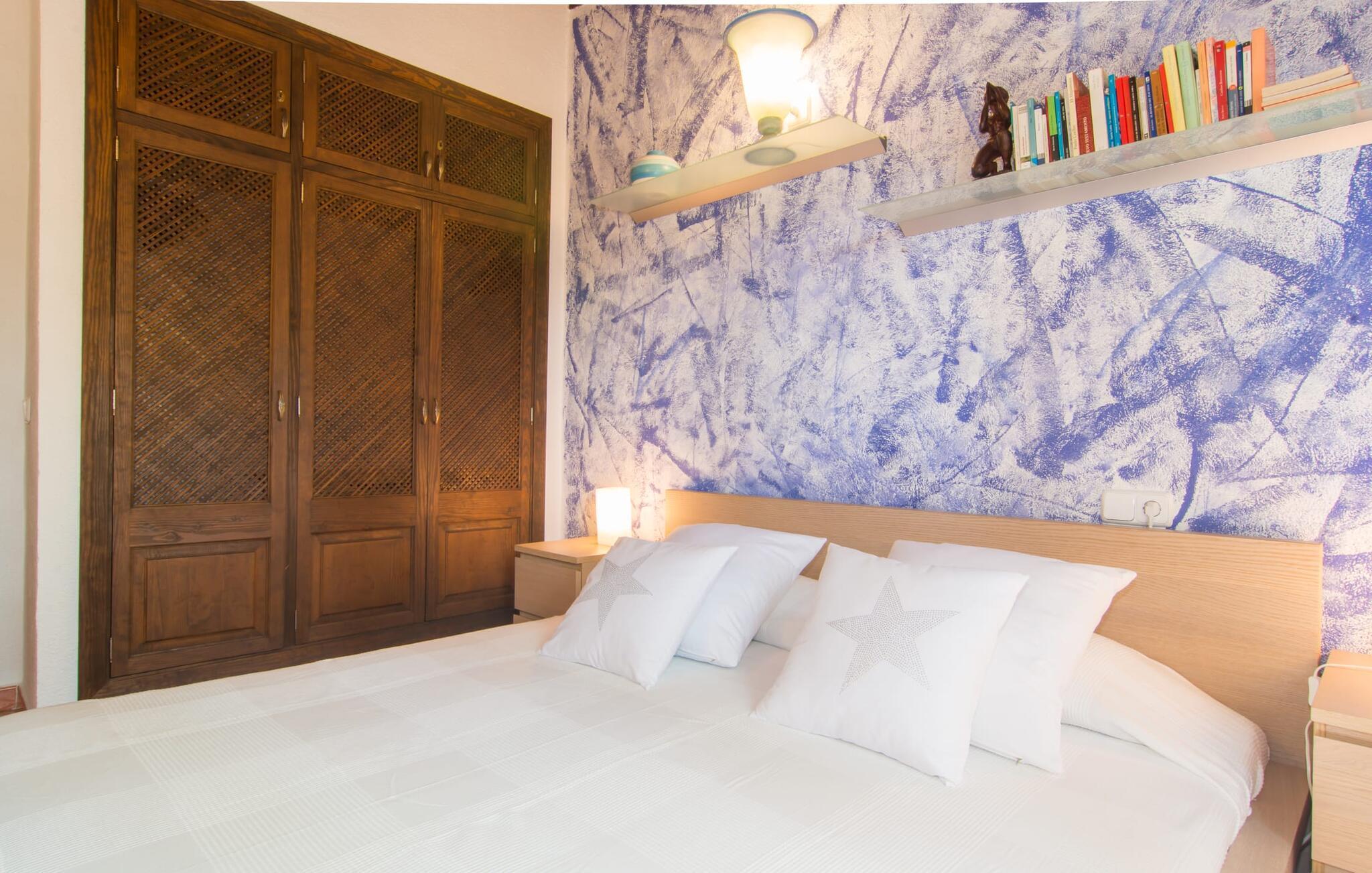 Von hier aus betreten wir nun das Wohnzimmer des Hauses. Dieser offene Raum mit Essbereich und integrierter Küche wird im Innenbereich sicherlich der Hauptort Ihres Aufenthalts sein. Und auch hier gibt es viele Dinge, die man tun kann. Wer möchte, kann auf den bequemen Sofas faulenzen und sich vielleicht mit einem guten Film unterhalten. Sie können auch mit dem kostenlosen Internet im Internet surfen oder Ihren Freunden zu Hause einen Einblick in Ihren Urlaub gewähren. Die typisch mallorquinische Küche ist komplett ausgestattet und bietet Ihnen alle Möglichkeiten zur völlig unabhängigen Selbstversorgung. Vielleicht möchten Sie ein spanisches Gericht ausprobieren und es dann servieren – entweder am riesigen Esstisch drinnen oder draußen? Individuell eingerichtete Schlafzimmer orientieren sich an unterschiedlichen Geschmäckern und bieten mit Sicherheit für jeden das passende Ambiente.