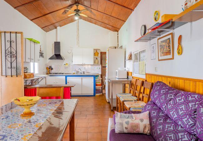Inside, the house has an open-plan kitchen equipped with a gas hob, fridge, freezer, microwave and small appliances such as coffee maker, toaster, kettle and juicer, facilitating the preparation of your meals. The living-dining room, with high rustic ceilings and ceiling fans, creates a fresh and cosy atmosphere to relax and watch television.