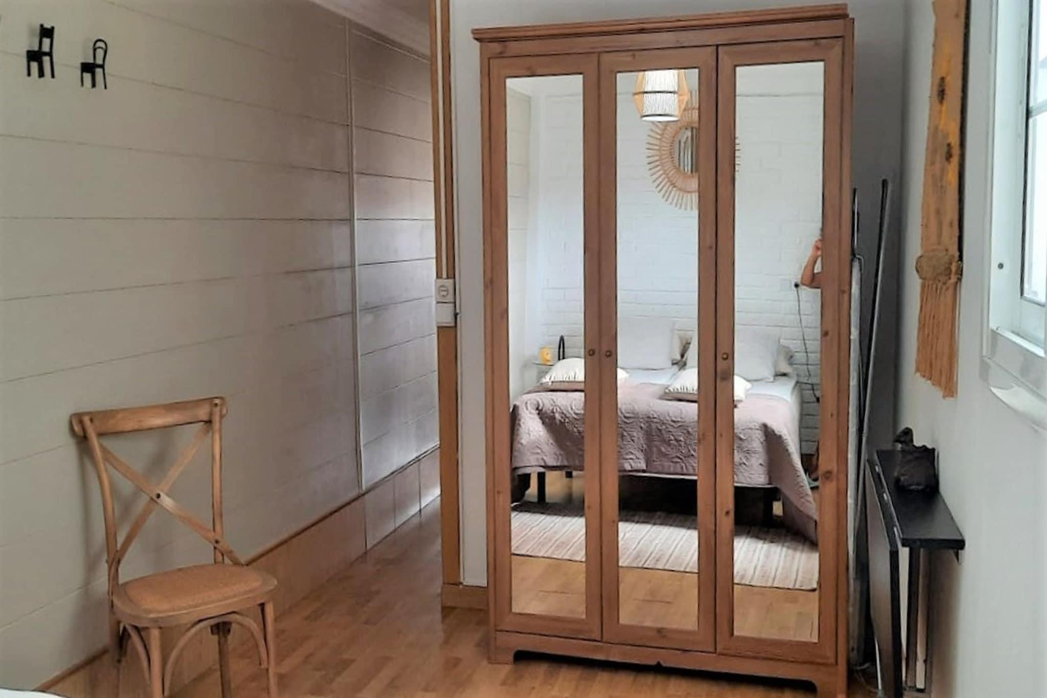 Ground floor: (Entrance, Kitchen(hob(4 ring stoves, gas), toaster, coffee machine, microwave, fridge-freezer), Living/bed room(TV(flatscreen), dining table, seating area), bedroom(double bed), bathroom(shower, washbasin, toilet, hairdryer)) dining table, seating area, cot, washing machine, terrace(private), garden furniture, BBQ(charcoal), parking, high chair, ironing board, iron