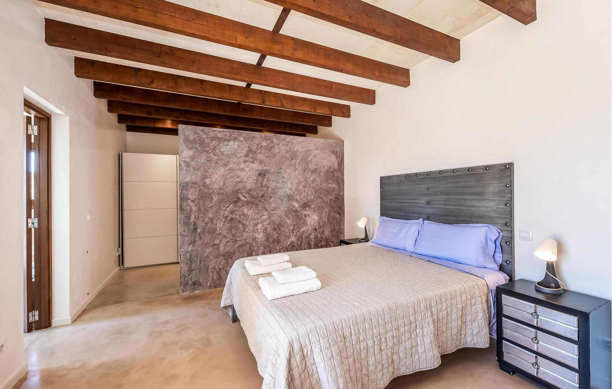 Dank seiner erhöhten Lage kommen Sie in dieser bezaubernden Finca in den Genuss atemberaubender Ausblicke auf die sanfte Hügellandschaft. Lassen Sie sich vom geschmackvoll eingerichteten Interieur und charmanten Details begeistern: Im Eingangsbereich erinnern die dreieckigen Milchglasfenster daran, dass sich in diesem ursprünglichen Bauernhaus einst der Kuhstall befand. Bereiten Sie in der hochwertigen Küche Ihre Mahlzeiten zu und lassen Sie sich für einen Filmabend auf dem bequemen Sofa nieder, wo an kühleren Tagen der Kamin für zusätzliche Behaglichkeit sorgt.