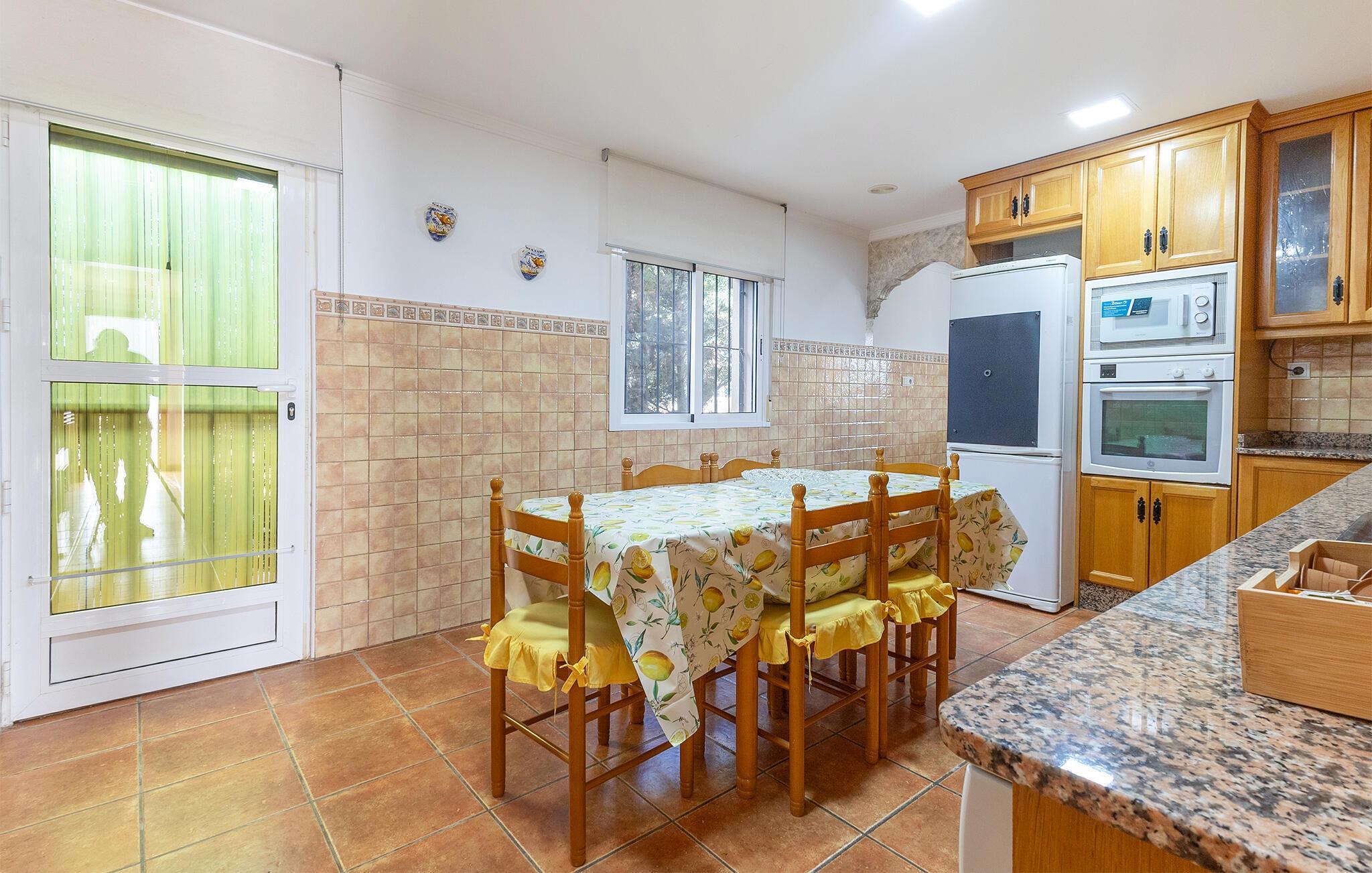 Dieses großzügige Ferienhaus lädt Sie zu einem entspannten Urlaub mit der Familie oder Freunden ein. Es liegt in einer ruhigen Umgebung und bietet ideale Voraussetzungen für sonnige Ferientage abseits des Trubels. Verbringen Sie Ihre Zeit im freundlich gestalteten Wohnbereich mit gemütlichen Sofas, Essplatz und Fernseher. Entspannen Sie drinnen bei einem Film oder genießen Sie ein gemeinsames Frühstück am Esstisch. Der offene Kamin sorgt an kühleren Abenden für behagliche Atmosphäre. Die geräumige Küche bietet mit einem weiteren Esstisch auch Raum für gesellige Mahlzeiten. Kochen Sie gemeinsam, planen Sie Ausflüge oder probieren Sie regionale Spezialitäten aus.