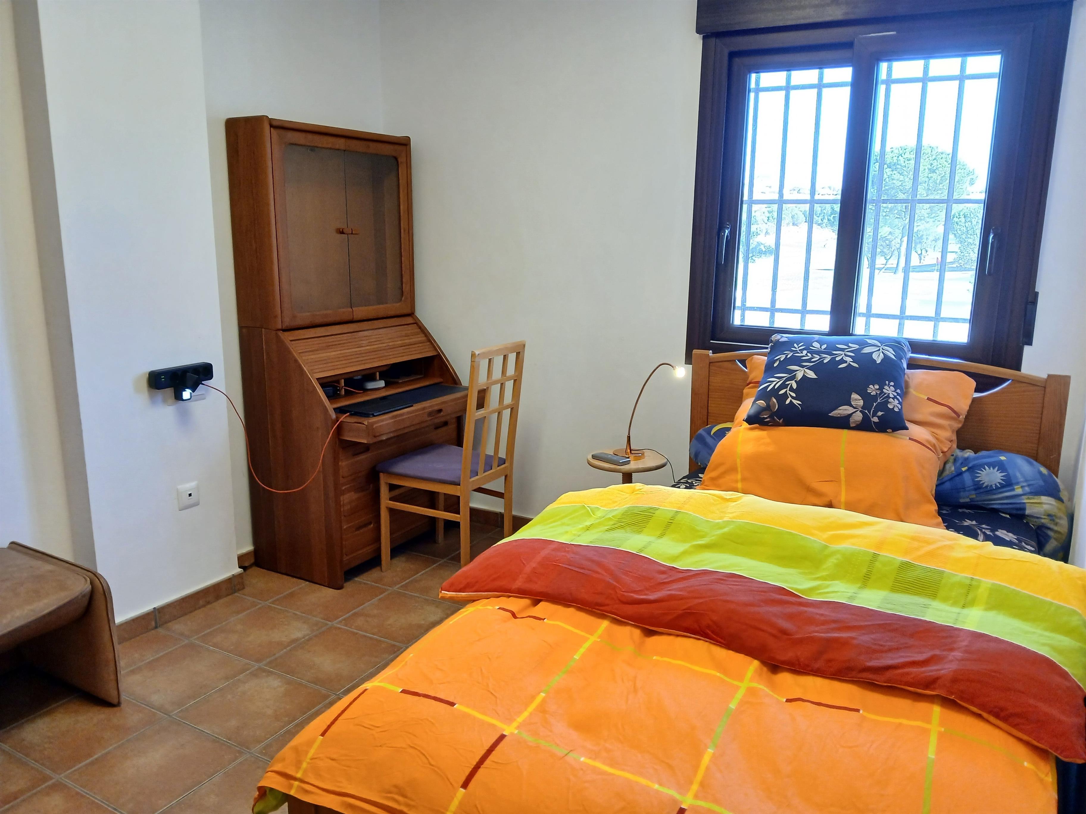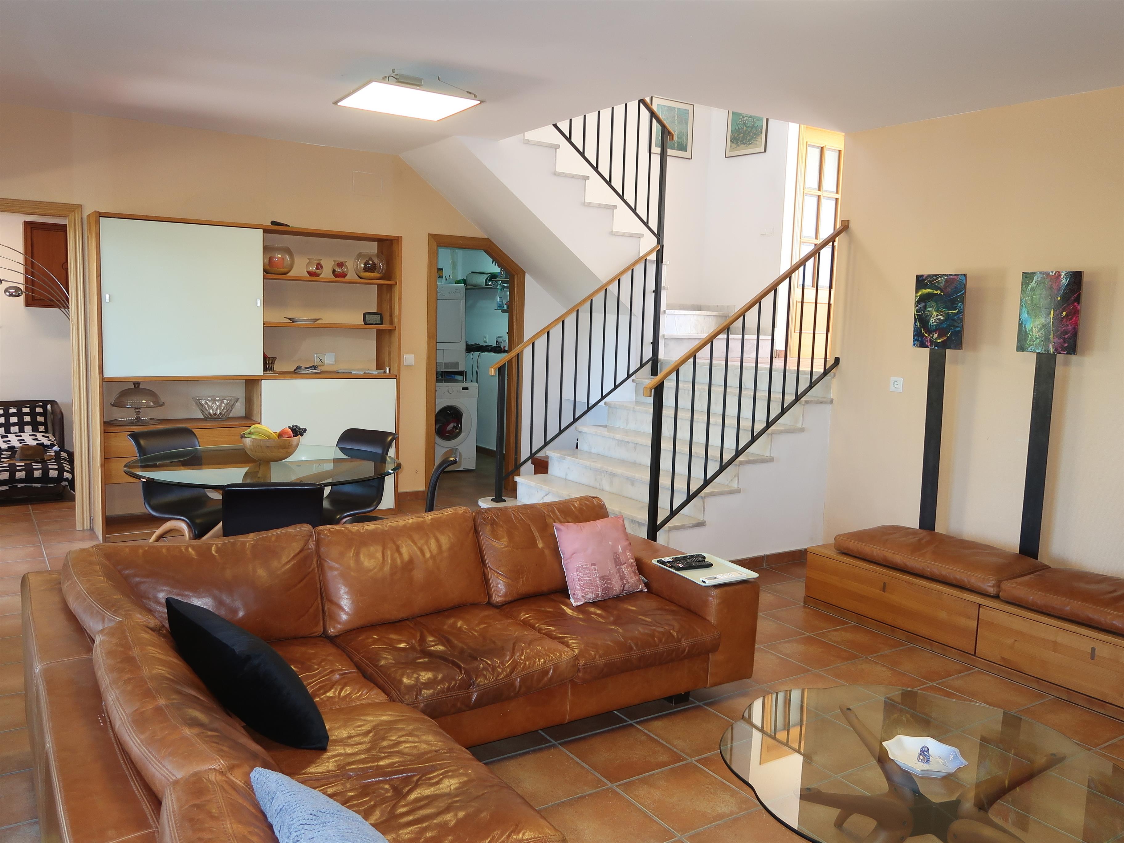 Treppe ins Erdgeschoß: Wohnraum mit Leder-Couchgarnitur, geschlossenem Kamin, großem Flachbild-Kabel-TV (Smart-TV, v.a. spanische und deutsche Kanäle), Essplatz und Terrassenausgang. Schlafzimmer mit Doppelbettcouch, direkter Zugang zu Dusche/WC. Vom Zwischengeschoß Treppe ins Obergeschoß: Diele, Balkonausgang. Schlafzimmer mit franz. Bett. Schlafzimmer mit Einzelbett mit Schreibtisch für Workstation und Internetanschluß. Bad mit ebenerdiger Dusche mit Massagendüsen, Bidet und WC.