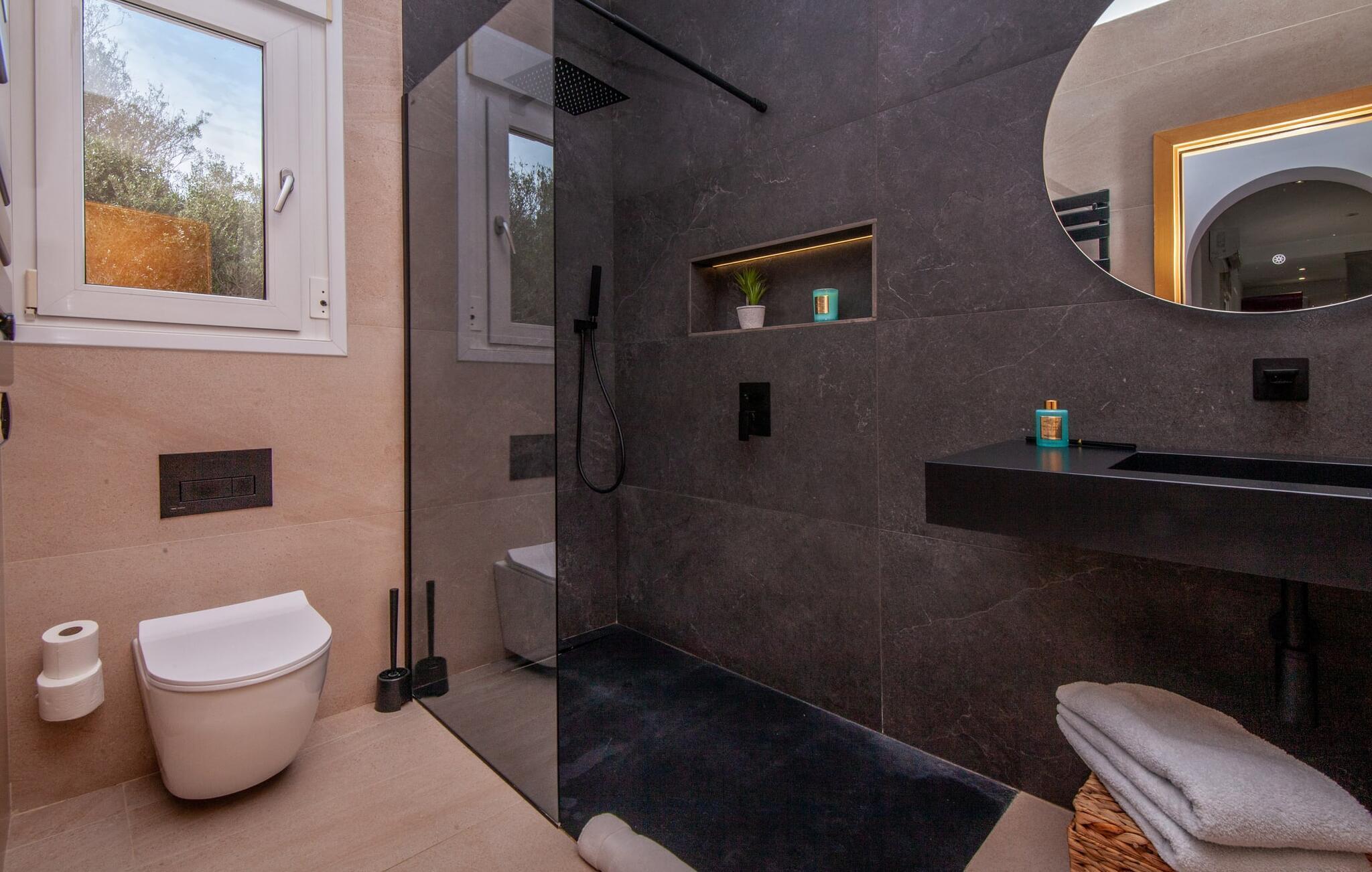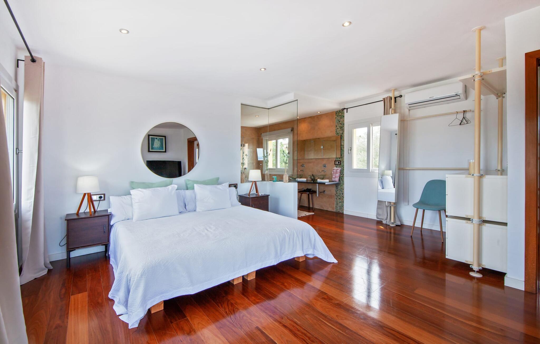 Das Wohnzimmer mit Essbereich und einer gut ausgestatteten amerikanischen Küche bietet einen direkten Zugang zur Poolterrasse. Darüber hinaus befinden sich im Erdgeschoss ein Schlafzimmer mit Doppelbett und ein elegantes Badezimmer mit Dusche. Eine stilvolle Iroko-Treppe führt hinauf in die erste Etage. Auf dieser Ebene gibt es ein weiteres Schlafzimmer und ein geräumiges Hauptschlafzimmer mit eigenem Bad, Hydromassage-Badewanne und einer schönen Terrasse mit Meerblick. Über eine kleine Wendeltreppe erreichen Sie ein weiteres charmantes Schlafzimmer mit Panoramablick, der an den eines Leuchtturms erinnert. Direkt daneben gelangt man auf eine wunderschöne Dachterrasse mit gemütlicher Liege und einem fantastischen Blick über die Bucht von Palma bis hin zum Tramuntana-Gebirge.