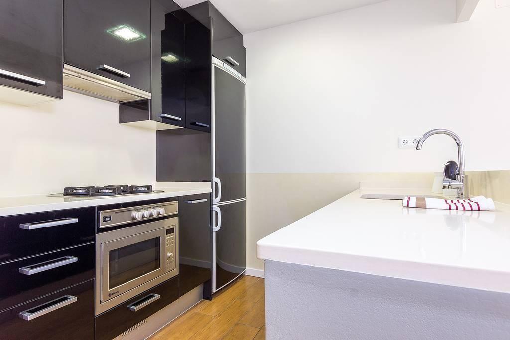 The flat has 2 bedrooms. The master bedroom, with king size bed, facing the street (a very small and quiet street) and the second bedroom with bunk beds is also an interior and quiet bedroom, with two bunk beds. A living room with open plan kitchen, dining room and sitting room overlooking the beautiful garden with private swimming pool (water is not heated).
