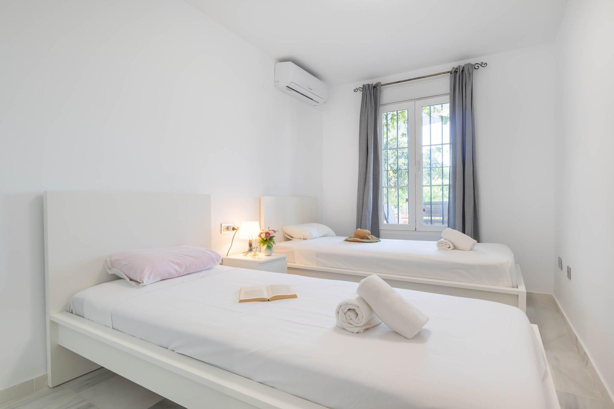 Living room(TV, dining table, seating area, air conditioning), Kitchen(stove, electric kettle, toaster, coffee machine, oven, microwave, fridge-freezer), bedroom(double bed, air conditioning), bedroom(single bed, single bed, air conditioning), bathroom(shower, toilet), Parking, balcony or terrace, swimming pool(shared with other guests, outside), Towels/Sheets (Incl.)