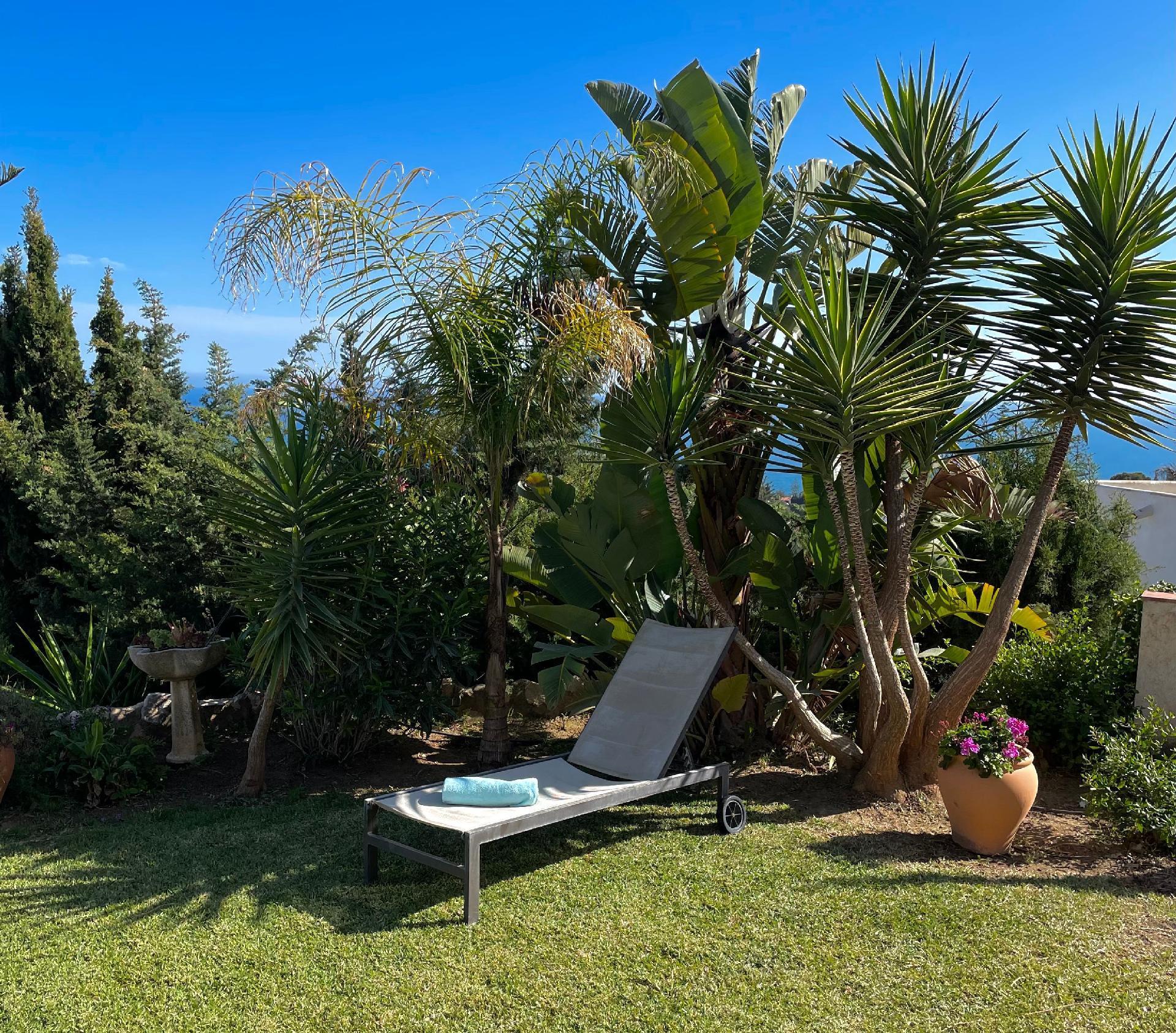 The detached villa also has a private pool (9m x 4m, renovated in 2020 with steps) surrounded by a large terrace with barbecue, a balcony, a large garden terrace, a private garden with palm trees, flowering plants and a lawn and a private car park directly in front of the house. The balcony and terrace offer seating for over ten people. The pool area is very spacious and offers sun all day long. There are sun loungers, parasols, table and chairs and an outdoor shower. And all this with a fantastic view over the entire coastal region.