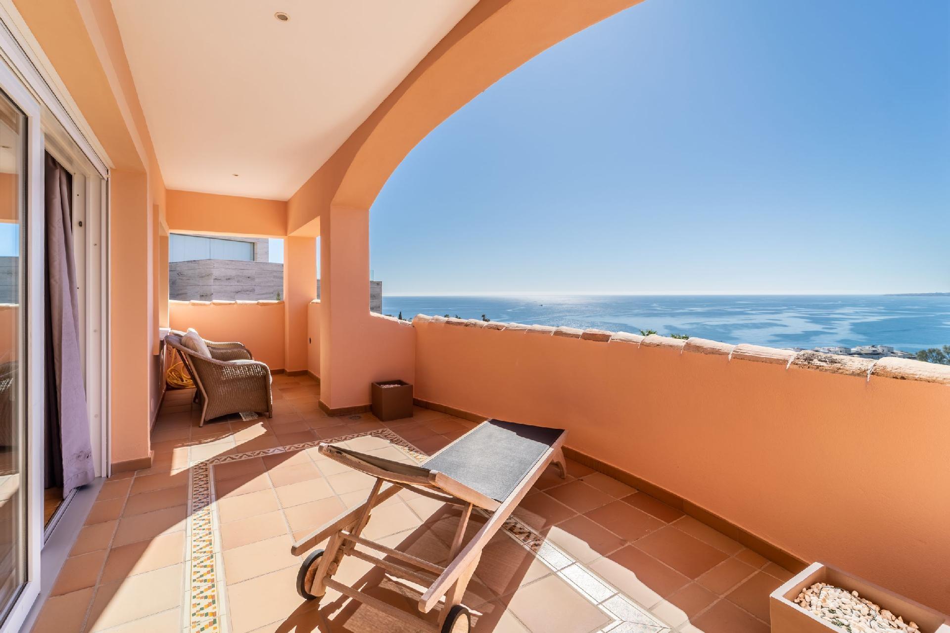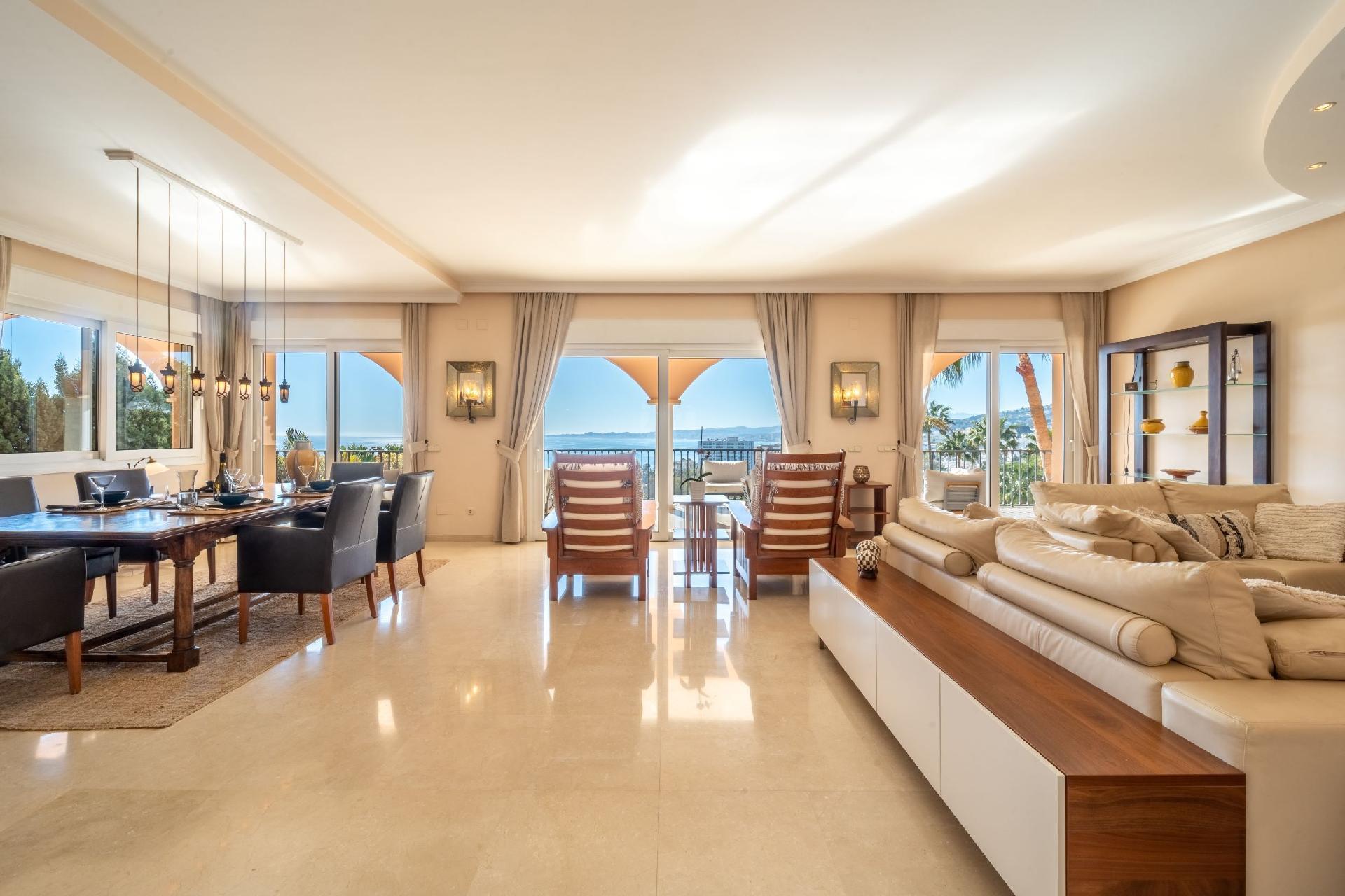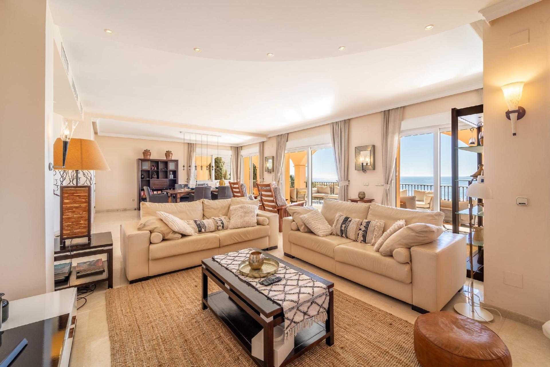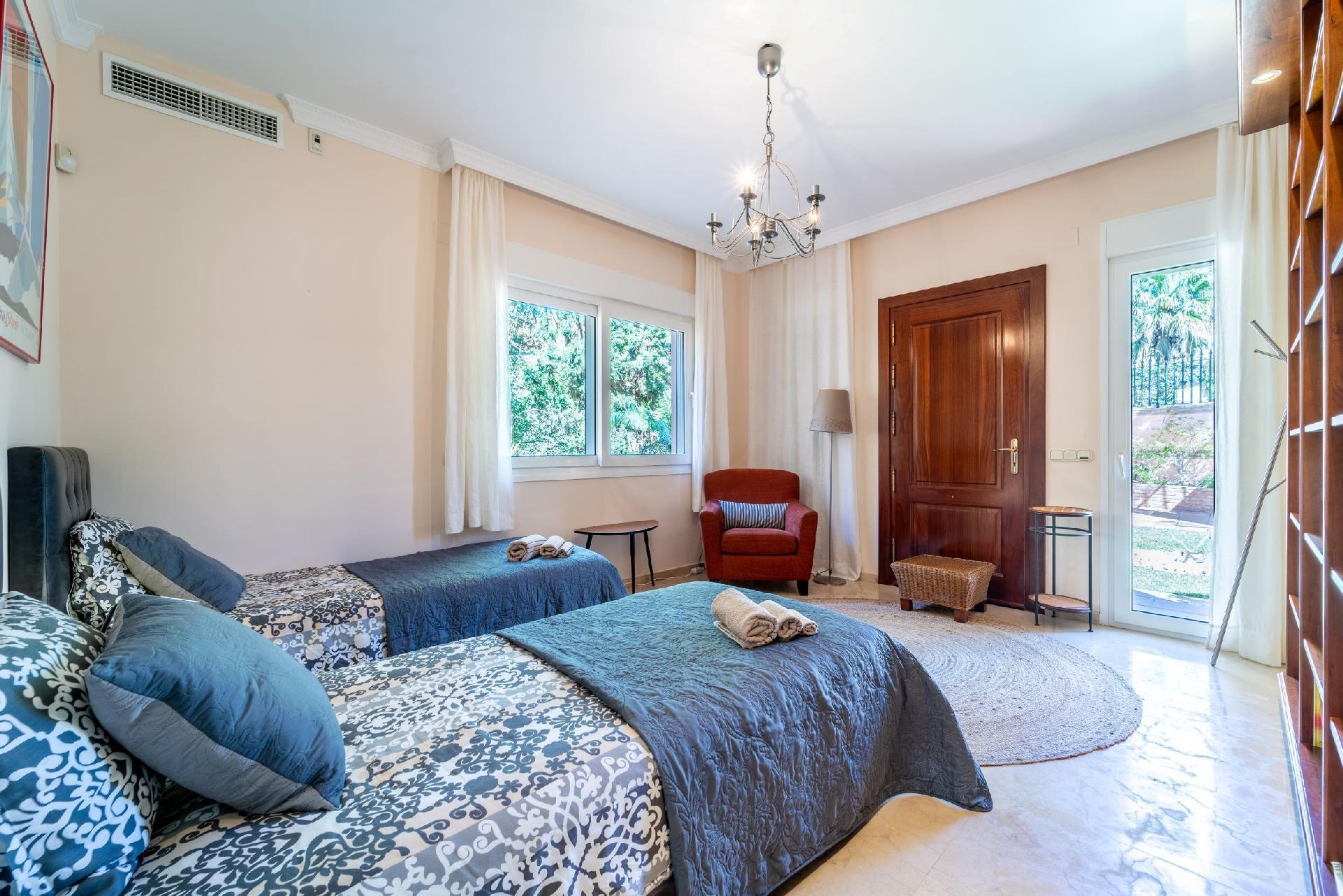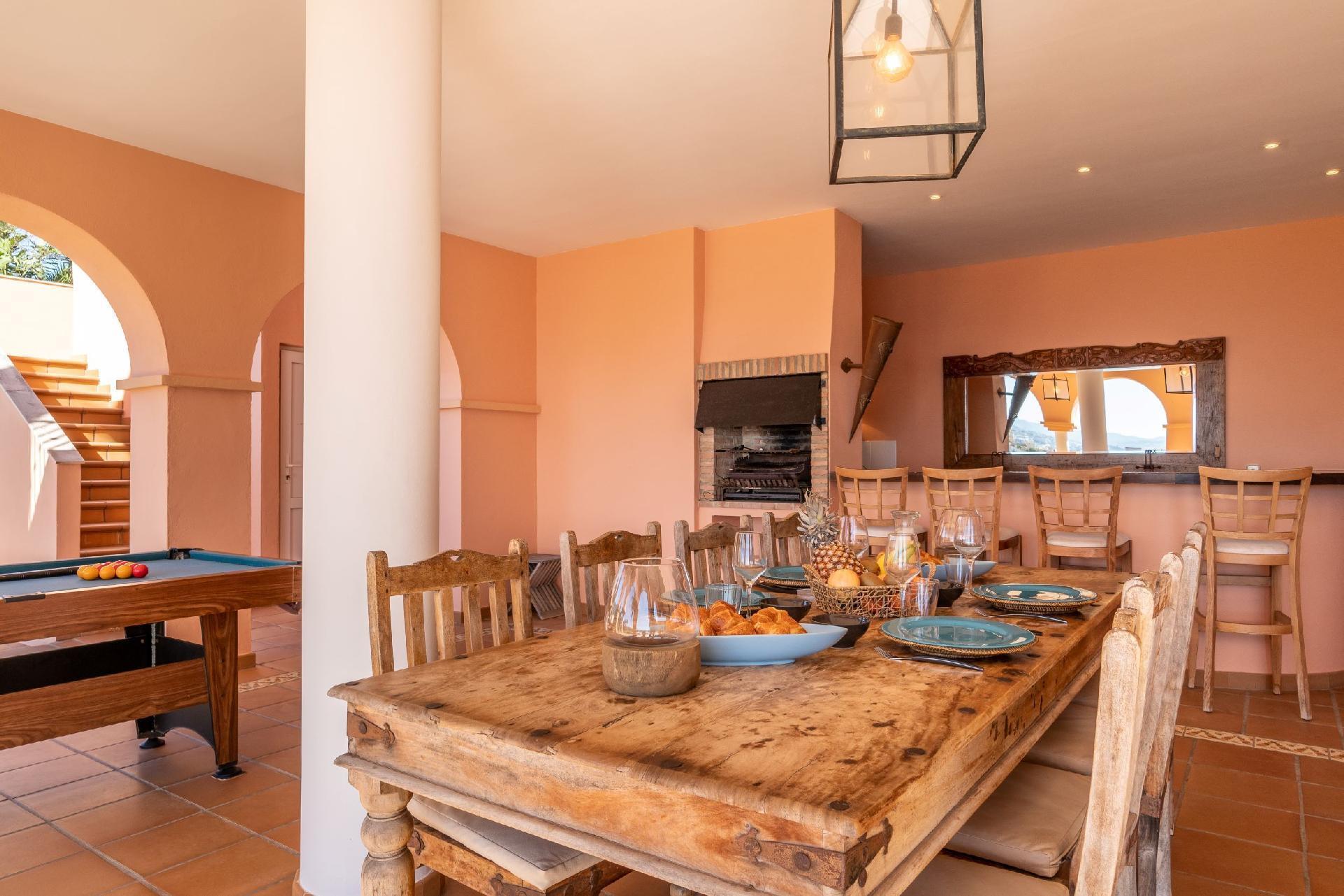 Built in the traditional Andalucian fashion with arches and pillars to create covered terraces as shelter for the hot summers, there has been put lots of detail in the decoration and furnishing of this elegant house. The villa itself epitomizes good taste, comfort and style and offers space and tranquility with panoramic coastal views from almost every room. This impression is confirmed when you step through the imposing front door. The volume and quality of the property are immediately evident. The entire estate is built against the slopes of the hills. The ground floor consists of a large living area, beginning with a double-height entry, a comfortable dining and sitting room complete with fireplace and glass sliding doors offering beautiful sea views and direct access to the ample covered terrace. The modern kitchen is large and welcoming, fully-fitted with everything guests may need during their stay, and has an additional breakfast and sitting area for added convenience, again with great sea views. On the same floor there is a guest toilet and two bedrooms with twin beds of which one with en-suite bathroom. Upstairs, the master bedroom suite is particularly beautiful, with an open dressing room, large en-suite bathroom and private terrace. Downstairs the lower ground floor hosts another bedroom with bathroom, separate guest toilet, utility room plus a gameroom with direct access to a second ample covered terrace and adjacent bar area with steps to garden and swimming-pool.