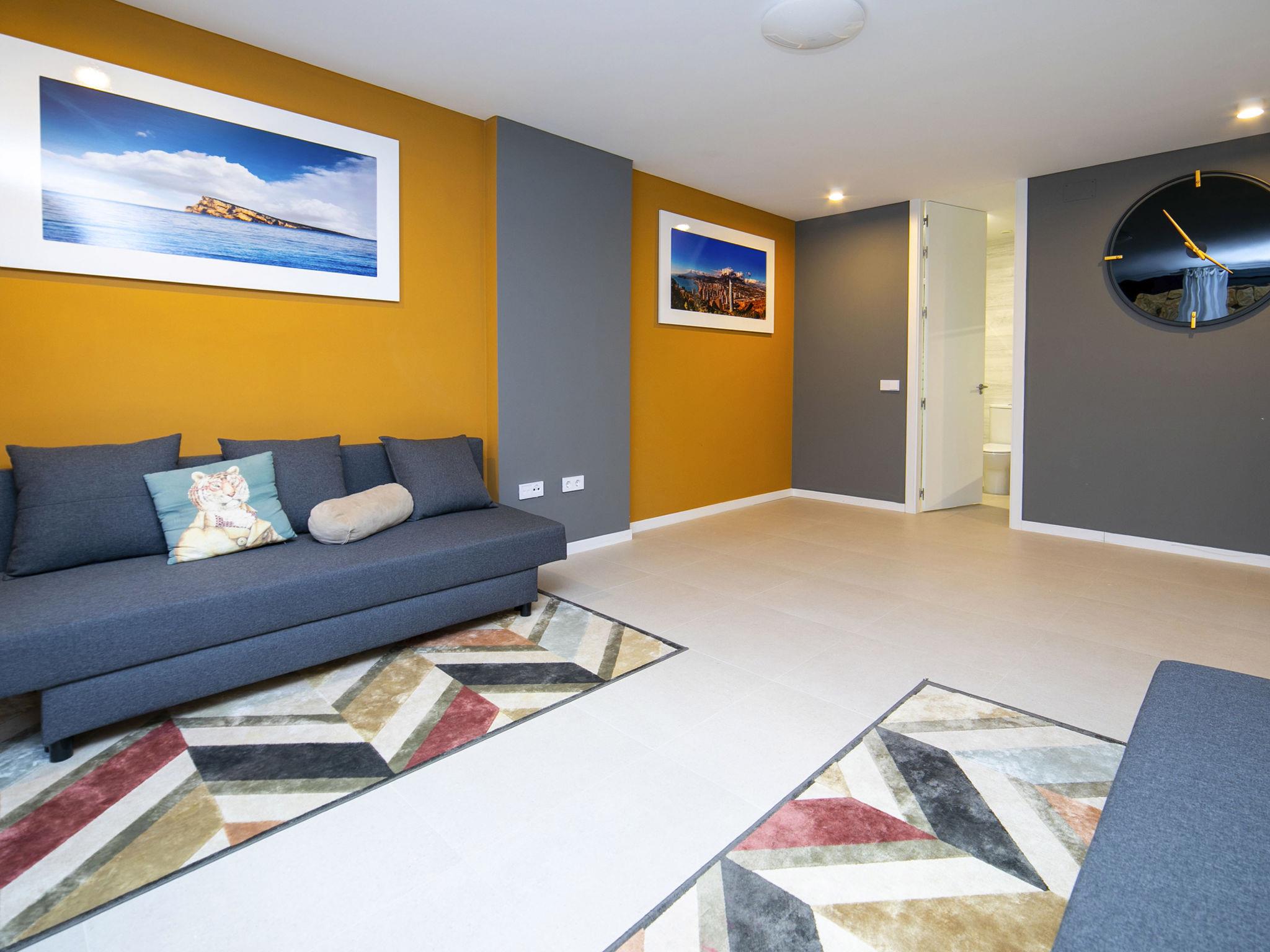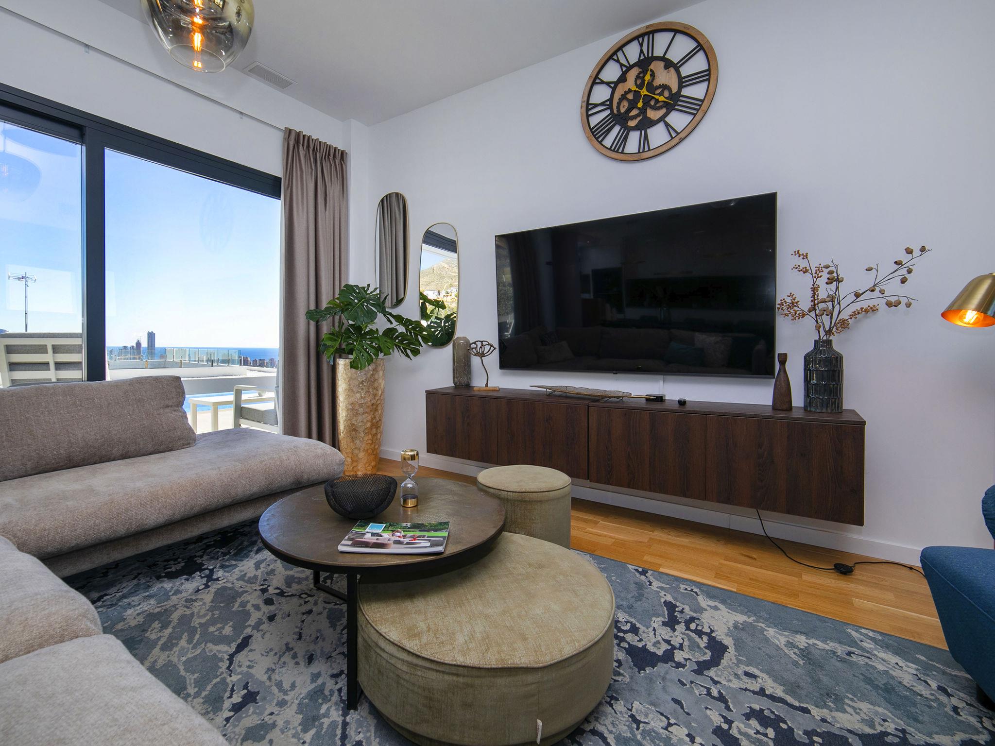 Finestrat: Very large, modern, comfortable villa "Villa perla", 3 storeys. On the outskirts, 7 km from the centre of Benidorm, outside the resort, 4 km from the centre of Finestrat, in a sunny position residential area (villas), 4 km from the sea, 4 km from the beach. Private: property (fenced), garden with lawn, swimming pool angular (seasonal availability: 01.Jan. - 31.Dec.). Patio, garden furniture, parking on the premises. Supermarket 2 km, restaurant 2 km, tram "Benidorm", bus stop "Carrerfour (Finestrat)" 2 km, railway station "Alicante", underground station "Benidorm", ferry "Dénia" 58 km, sandy beach "Cala Finestrat". Golf course (18 hole) 4 km, walking paths from the house 300 m. Nearby attractions: Terra Mitica 4 km, Terra Natura 4 km, Aqualandia 13 km, Mundomar 13 km, Alicante 44 km, Aeropuerto Alicante 56 km. Please note: car recommended, no lift. Baby equipment on request. The owner does not accept any youth groups. Neighbourhood highly sensitive to noise. Quietness and good behaviour expected. There are 15 stairs to enter the house.