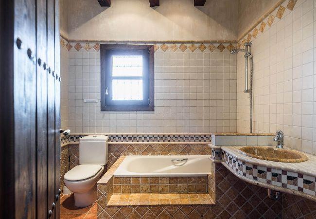 INTERIOR: The GROUND FLOOR consists of a fully equipped independent kitchen, with dishwasher, gas hobs and 2 ovens, a very spacious dining room, a living room with DTT/Sat TV, a bedroom with a double bed, another bedroom with two single beds, air conditioning and an en-suite shower bathroom, a separate toilet, a room with a washing machine, and within it a shower bathroom. The UPPER FLOOR consists of a large bedroom with two single beds, air conditioning and an en-suite bathroom with bathtub, another bedroom with two single beds, air conditioning and an en-suite shower bathroom, another bedroom with 2 single beds, air conditioning and an en-suite shower bathroom and finally, a bedroom with 2 single beds, air conditioning and an en-suite shower bathroom.
