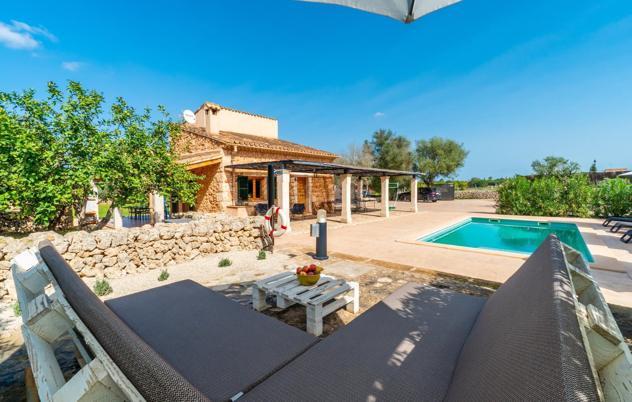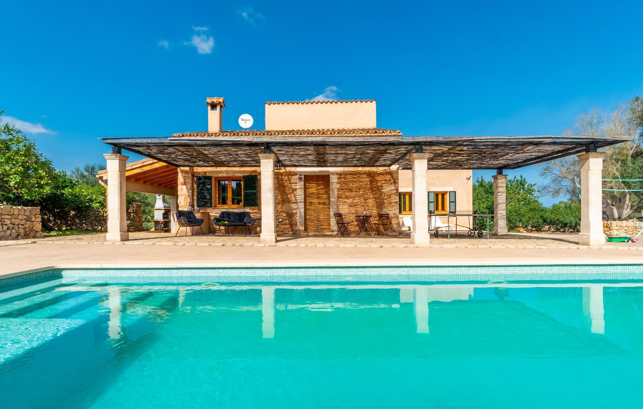 Suchen Sie Ihr eigenes kleines Refugium im Grünen? Ein Ort zum Wohlfühlen – mit Pool, Sonnenterrasse und Olivenbäumen? Dann ist Villa „Binitaref“ genau die richtige Wahl für Sie! Das charmante Natursteinhaus mit klassischen dunkelgrünen Fensterläden liegt in Alleinlage und Südlage auf einem knapp 7.000 m² großen Grundstück, auf das Sie von den vielen, teilweise überdachten Terrassenflächen rund um das Haus einen herrlichen Ausblick genießen können. Aber nur, wenn Sie den Blick vom Pool abwenden können, der in der Sonne schimmert und von einer wunderschönen Steinmauer umgeben ist, die zu einem erfrischenden Bad oder zwei einlädt. Nach dem Schwimmen einfach auf einer der bequemen Liegen ein Nickerchen machen – herrlich! Wer sich lieber austoben möchte, kann mit seinen Mitreisenden eine Partie Volleyball spielen und anschließend die auf dem Grill zubereiteten Köstlichkeiten genießen, die am eleganten Glastisch auf der Terrasse serviert werden.