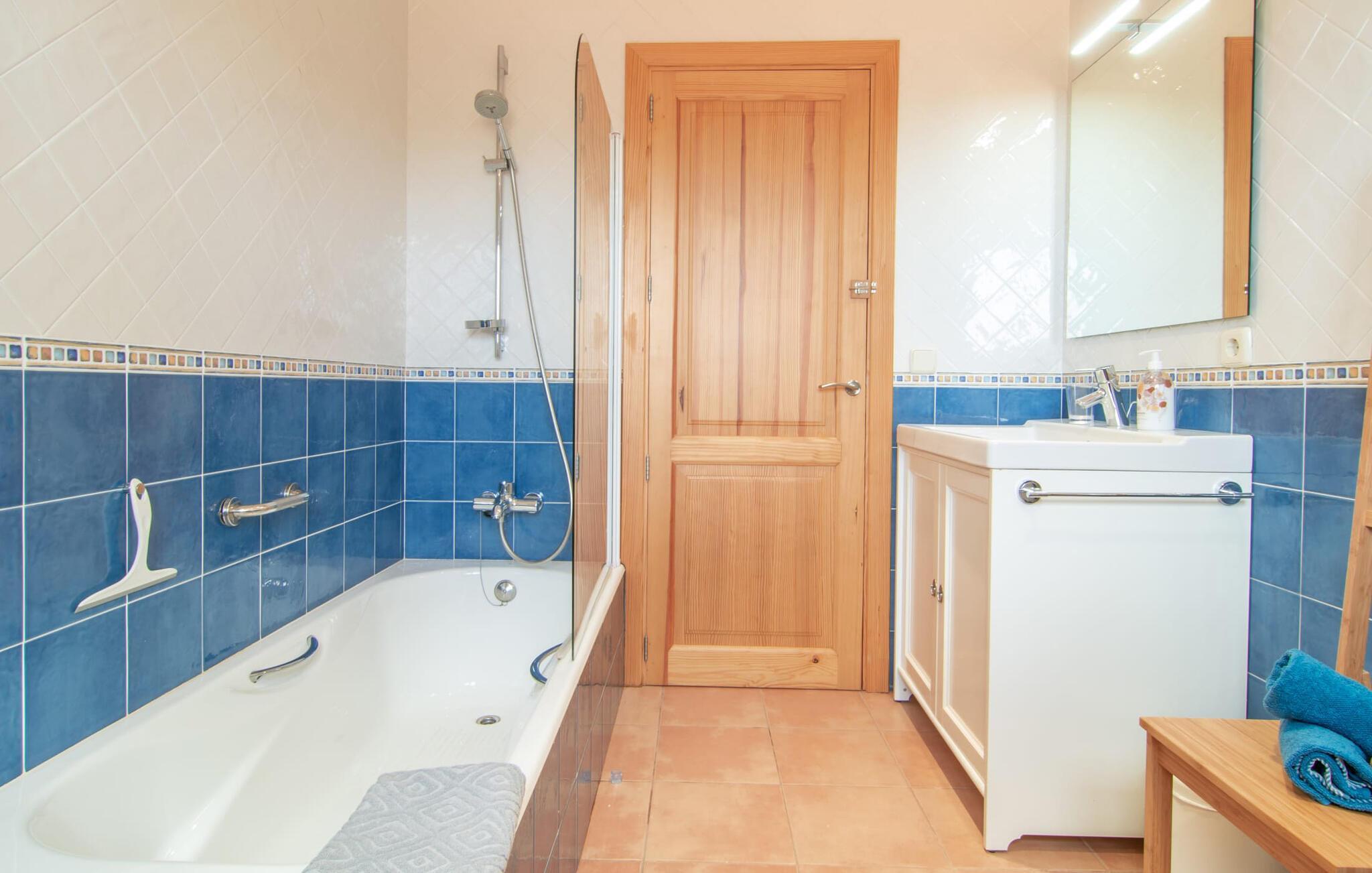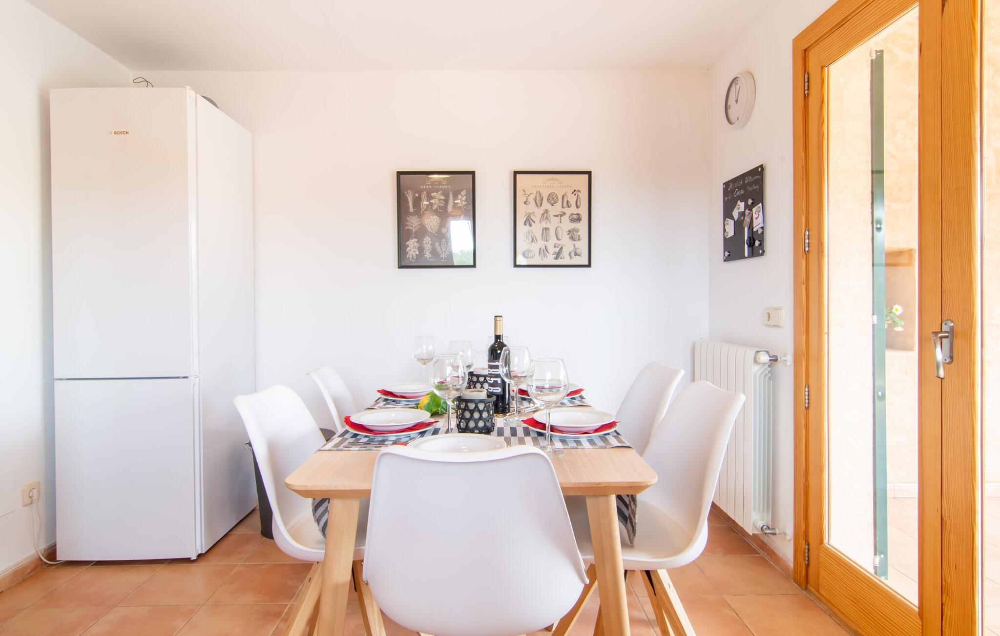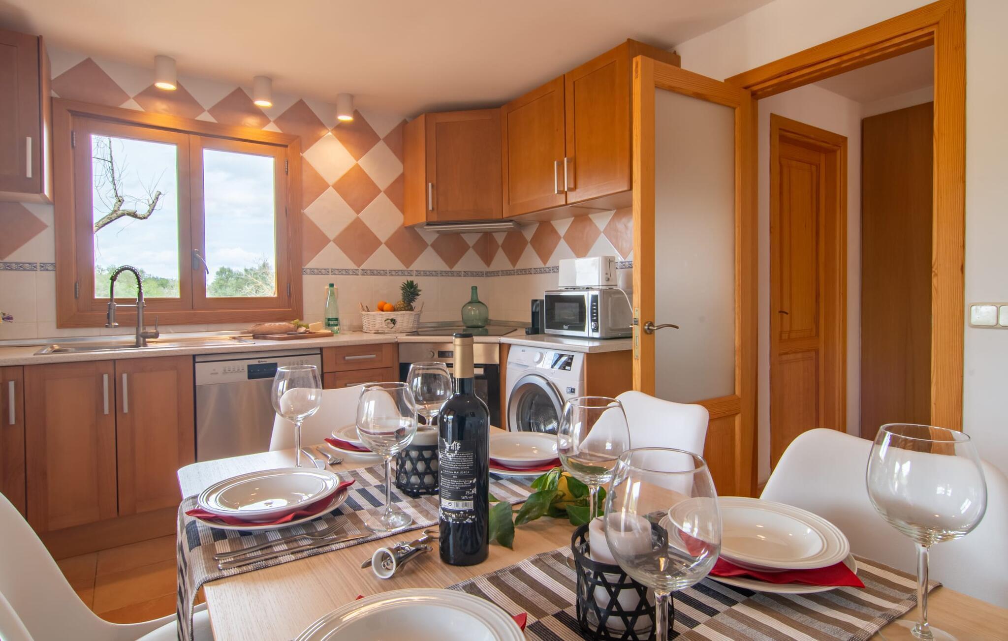 Während der Außenbereich des „Binitaref“ eher rustikal im typischen Villenstil wirkt, ist der Innenbereich modern, hell und freundlich eingerichtet und gestaltet. Im geräumigen Erdgeschoss befindet sich außerdem das gemütliche Wohnzimmer mit zwei bequemen Sofas, von denen aus Sie entweder dem knisternden Feuer zusehen oder einfach fernsehen können. Ein schicker Esstisch befindet sich praktischerweise in der Küche, sodass Sie mit vollen Tabletts nicht weit fahren müssen. Satt und müde können Sie sich in eines der drei angenehm diskreten, klimatisierten Doppelzimmer zurückziehen. Zwei davon befinden sich im Erdgeschoss, eines im Obergeschoss und ist über eine luftige Treppe erreichbar. Zwei schicke Badezimmer, beide mit Badewanne und eines mit En-Suite, runden den absolut überzeugenden Wohnkomfort Ihres Feriendomizils ab.