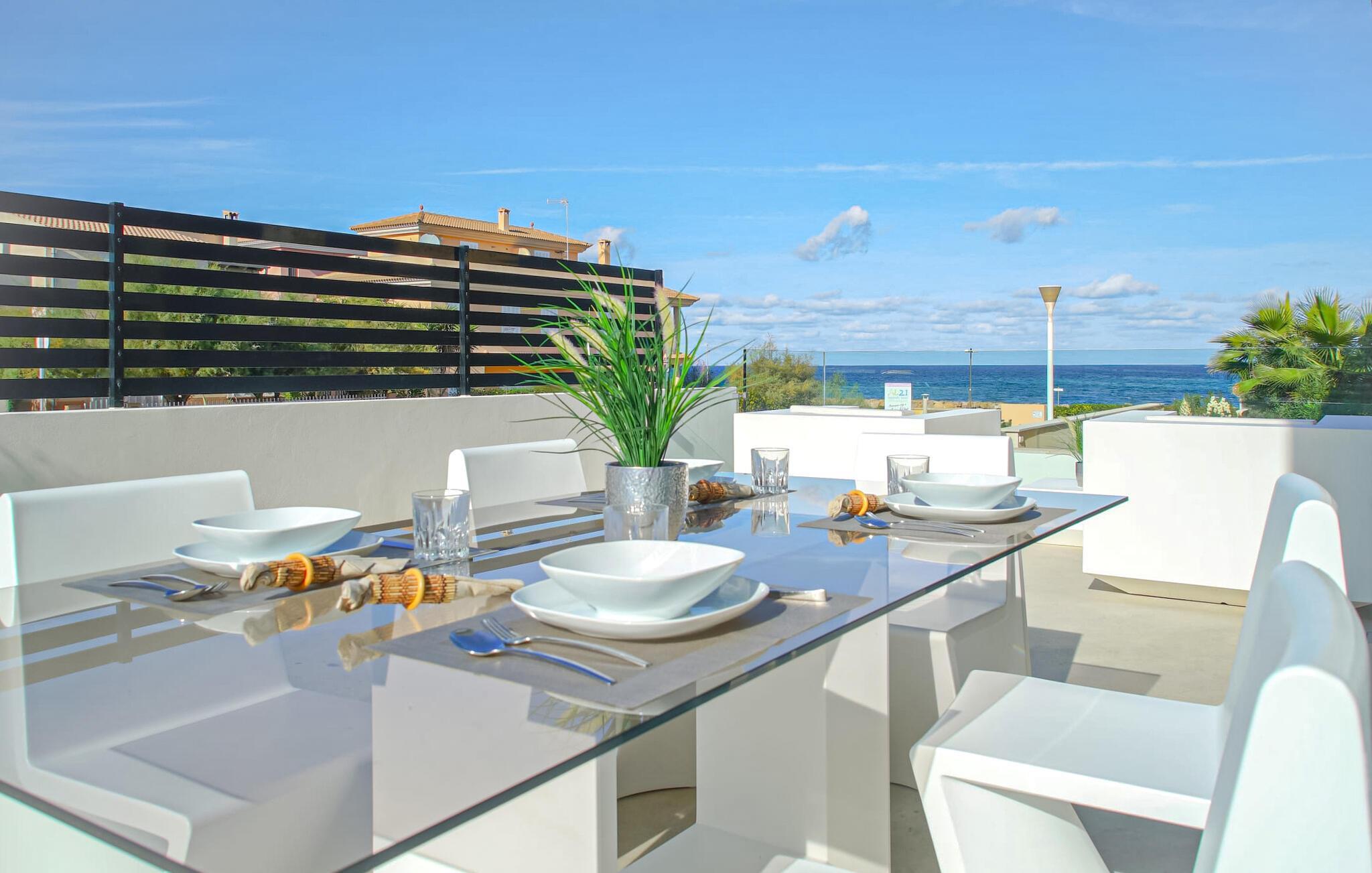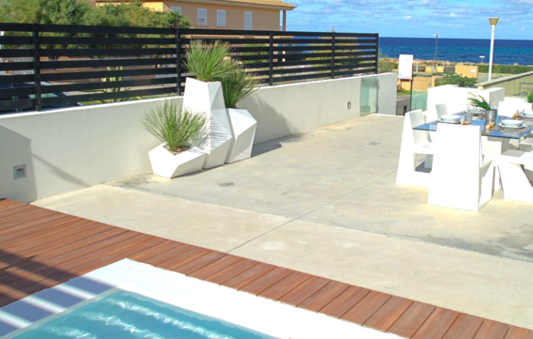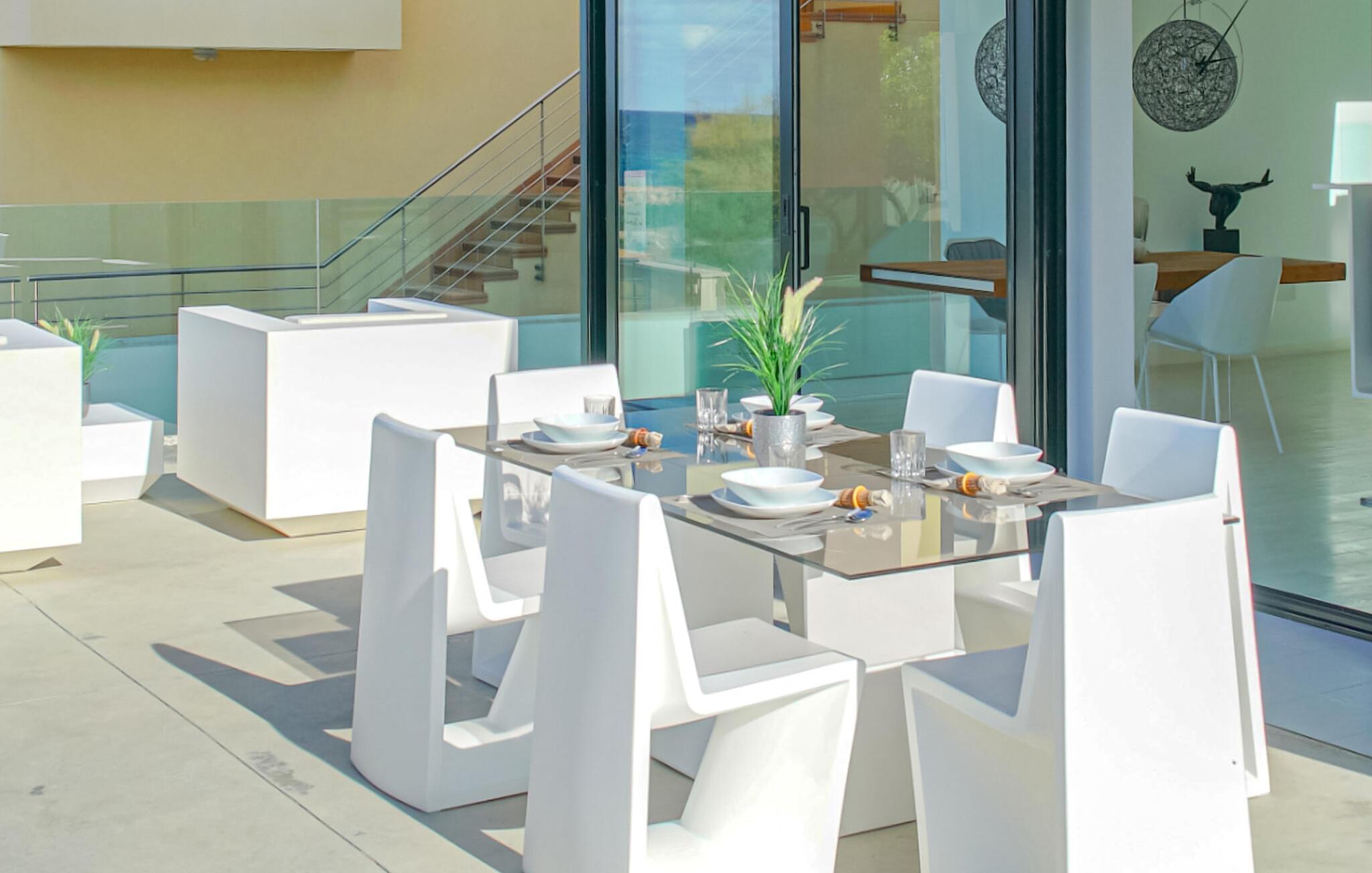 Während einige unbedingt das Leben in einer jahrhundertealten klassischen Villa erleben möchten, schätzen andere die Vorzüge eines modernen Gebäudes – insbesondere, wenn es sich bei diesem Gebäude um eine stilvolle Villa wie „Blaveta“ handelt, die allein aufgrund ihrer Lage ein Volltreffer ist. Nur 100 m Luftlinie vom Meer entfernt gelegen, ist es ein wahres Juwel, denn sein strahlend weißes Gesicht scheint tatsächlich dem „Azurblau“ des Mittelmeerhimmels Konkurrenz zu machen. Das kantige Gebäude ist von 320 gepflegten Quadratmetern umgeben, die sich perfekt für gepflegtes Chillen im Freien eignen. Ein hübscher Tisch mit Glasplatte und Stühle im abstrakten Design laden zu stilvollen Mahlzeiten im Freien mit Blick auf das Meer ein – keine Extras erforderlich. Eine Markise spendet bei Bedarf Schatten. Daneben laden die großen Sessel dazu ein, sich bei einem kühlen Getränk niederzulassen oder den Tag stimmungsvoll ausklingen zu lassen. Auch wenn der Strand fast direkt vor dem Haus liegt und zum Schwimmen naheliegend wäre, gibt es noch eine weitere attraktive Alternative: Auch der 5 m lange Pool vor Ort lädt zu einem erfrischenden Bad ein. Und es gibt keinen besseren Ort zum Entspannen als die geschmackvolle Liege mit Sonnenschirm.
