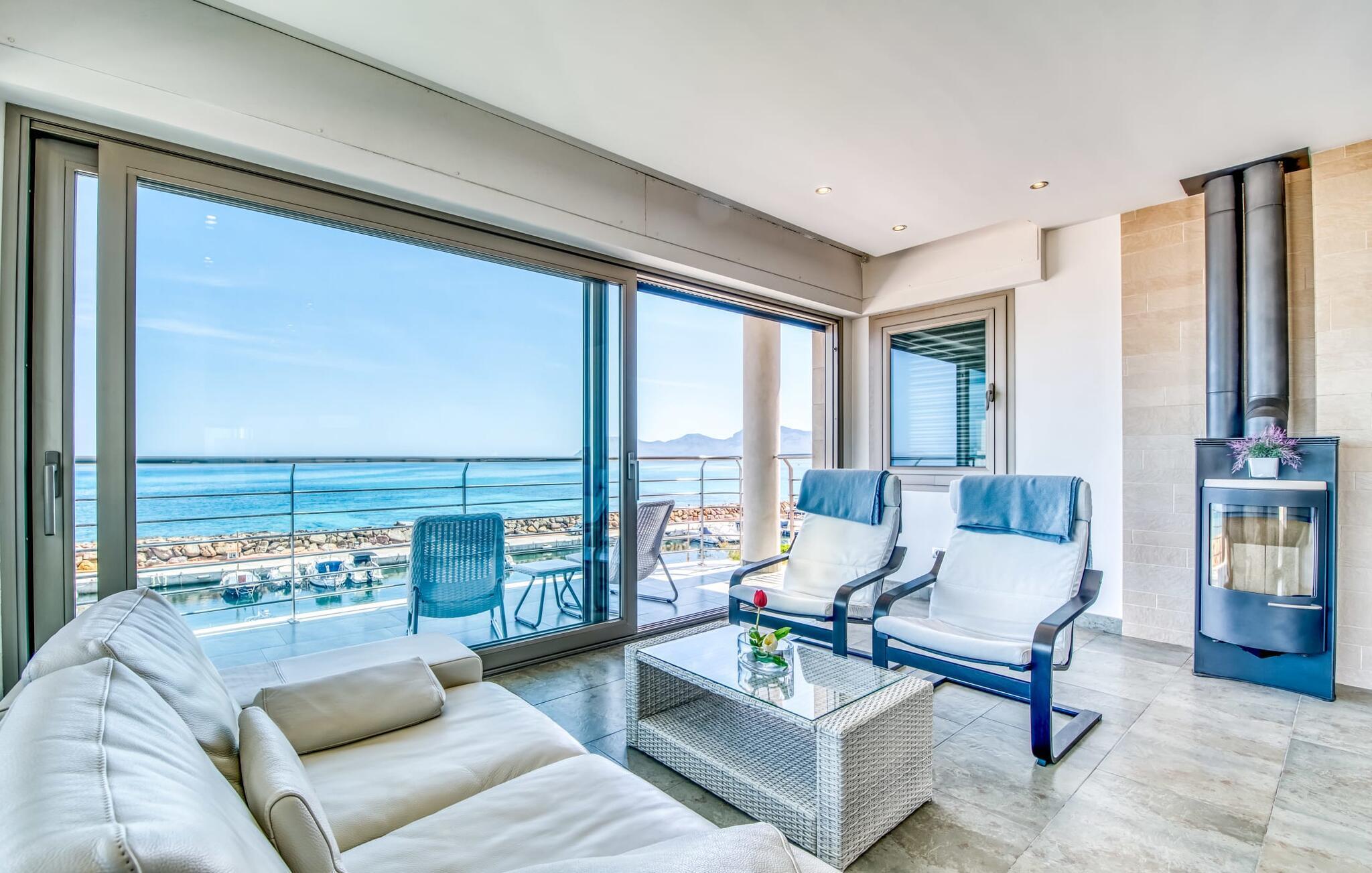 Das Meer und einladende Bademöglichkeiten sind somit nicht weit – aber auch im hauseigenen Pool (nicht beheizbar) lässt sich köstliches Badevergnügen im Handumdrehen verwirklichen. Der große Säulenraum mit dem über eine Treppe erreichbaren langen Schwimmbecken und den blauen Mosaiksteinen wirkt fast wie eine kleine Badeanstalt. Außer, dass Sie hier uneingeschränkte Privatsphäre genießen. Viel Licht fällt durch bodentiefe Fenster in die elegant eingerichteten Räume, in denen ein moderner, angenehm kühler Stil vorherrscht. Wohn- und Essbereich sind zueinander offen und die trendige, luxuriöse, voll ausgestattete Küche nebenan bietet einen weiteren Essbereich sowie direkten Zugang nach draußen. Durch die Glaselemente zwischen Wohnzimmer und Küche entsteht ein sehr charmanter Großzügigkeitseffekt. Ein Badezimmer vervollständigt das Erdgeschoss. Eine schicke Glastreppe führt in die nächste Etage, wo sich geräumige, geschmackvoll eingerichtete Schlafzimmer – teilweise mit herrlichem Meerblick – sowie eigene Badezimmer befinden. Besonders großzügig ist das großzügig verglaste Schlafzimmer im 2. Obergeschoss. Hier ist sogar Platz für eine Sofazone. Ein zusätzlicher Balkon mit tollem Blick auf das Meer und ein Badezimmer en Suite runden diese Wohnebene ab. „Bohemi“, das für Body, Health, Mind steht, macht seinem Namen alle Ehre, indem es seinen Gästen in jeder Hinsicht höchsten Komfort bei perfekter Ästhetik bietet.