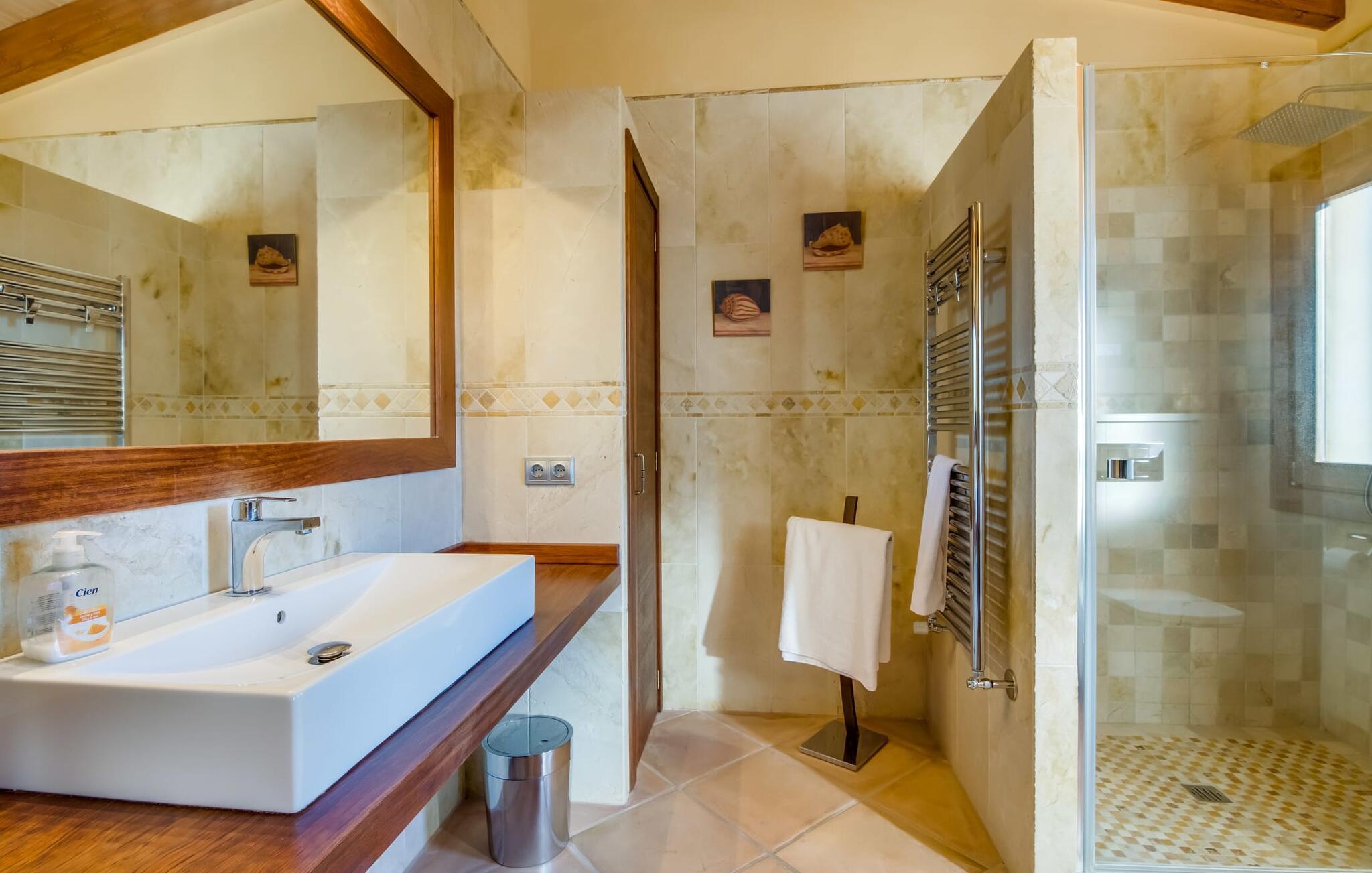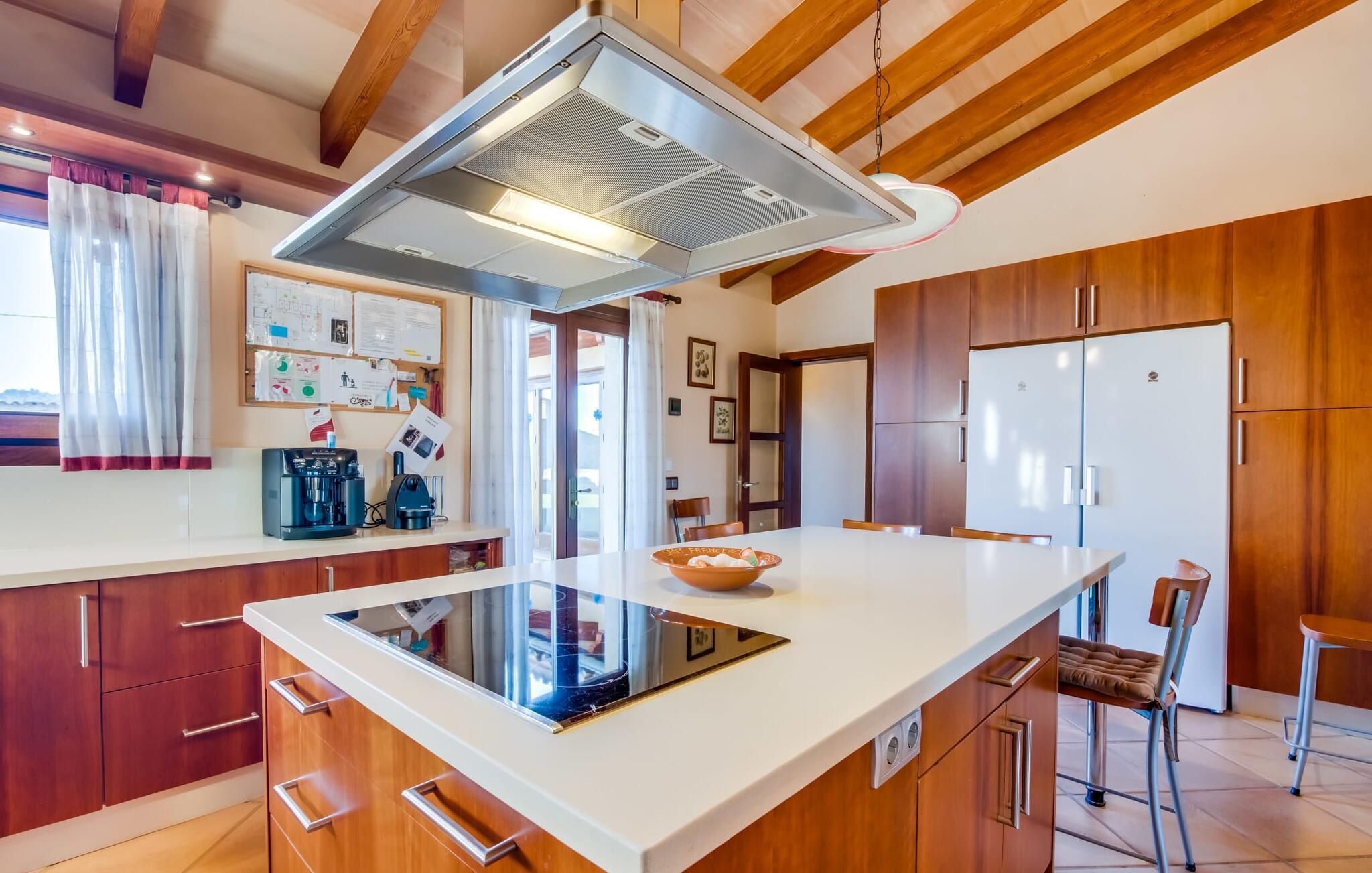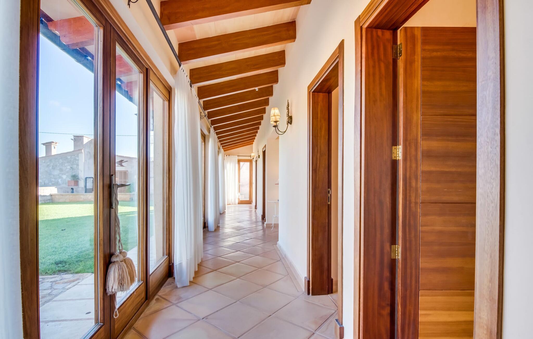 Auch im Erdgeschoss der Finca ist Großzügigkeit angesagt und ergänzt wirkungsvoll die gemütliche Einrichtung. Harmonische Farben, viel Holz und eine gekonnt ausgewählte Beleuchtung und Dekoration setzen klare Maßstäbe in puncto Ästhetik. Besonders einladend ist das große Wohn-Esszimmer mit verschiedenen Plätzen zum Entspannen sowie einem Esstisch und direktem Zugang zur Terrasse. Auch der riesige Flachbildfernseher ist hier installiert. Die komplett mit hochwertigen Geräten ausgestattete Küche ist halboffen und eignet sich mit ihrer großen Kochinsel hervorragend für die Zubereitung von Mahlzeiten. Von hier aus besteht auch ein direkter Zugang nach draußen. Im anderen Teil des Gebäudes befinden sich die fünf komfortabel eingerichteten Doppelzimmer, von denen eines über ein eigenes Bad verfügt. Die anderen Schlafzimmer teilen sich zwei weitere Badezimmer, so dass auch bei Vollbelegung ausreichend Privatsphäre gewährleistet ist. Dieses charmante Bauernhaus auf Mallorca punktet nicht nur mit der Nähe zum Meer, sondern auch mit der Nähe zum Meer, da es nur etwa 15 Autominuten von Playa de Muro und nur zehn von Can Picafort entfernt ist. Auch nach Sa Pobla mit seinen guten Einkaufsmöglichkeiten ist es nicht weit. Durch die Lage in der Nähe mehrerer Straßen, die je nach Wind auch akustisch wahrnehmbar sind, ist die Verkehrsanbindung hier besonders gut. Das üppige und sehr gepflegte Anwesen macht auch längere Aufenthalte auf dem Bauernhofgelände sehr attraktiv.