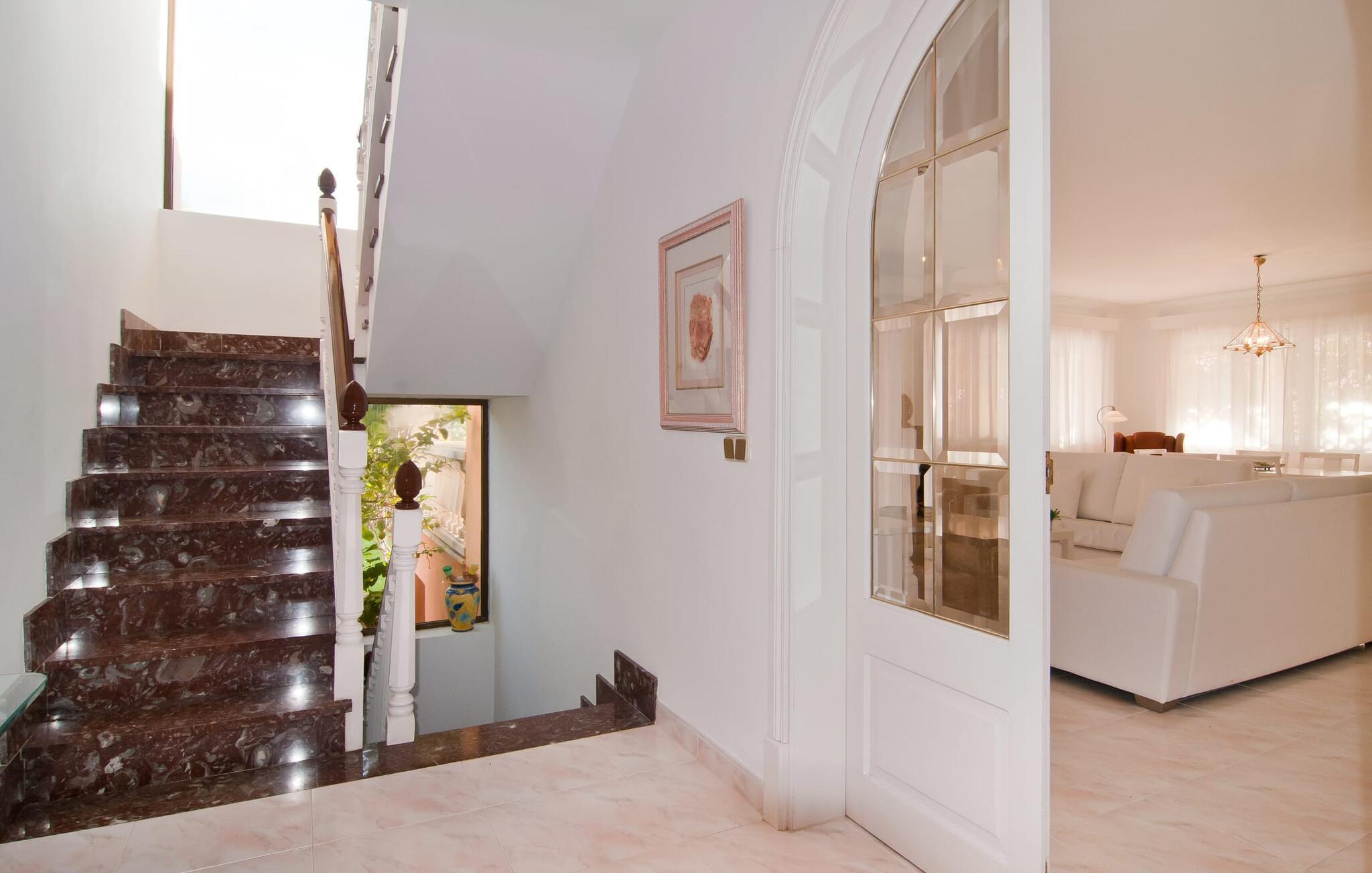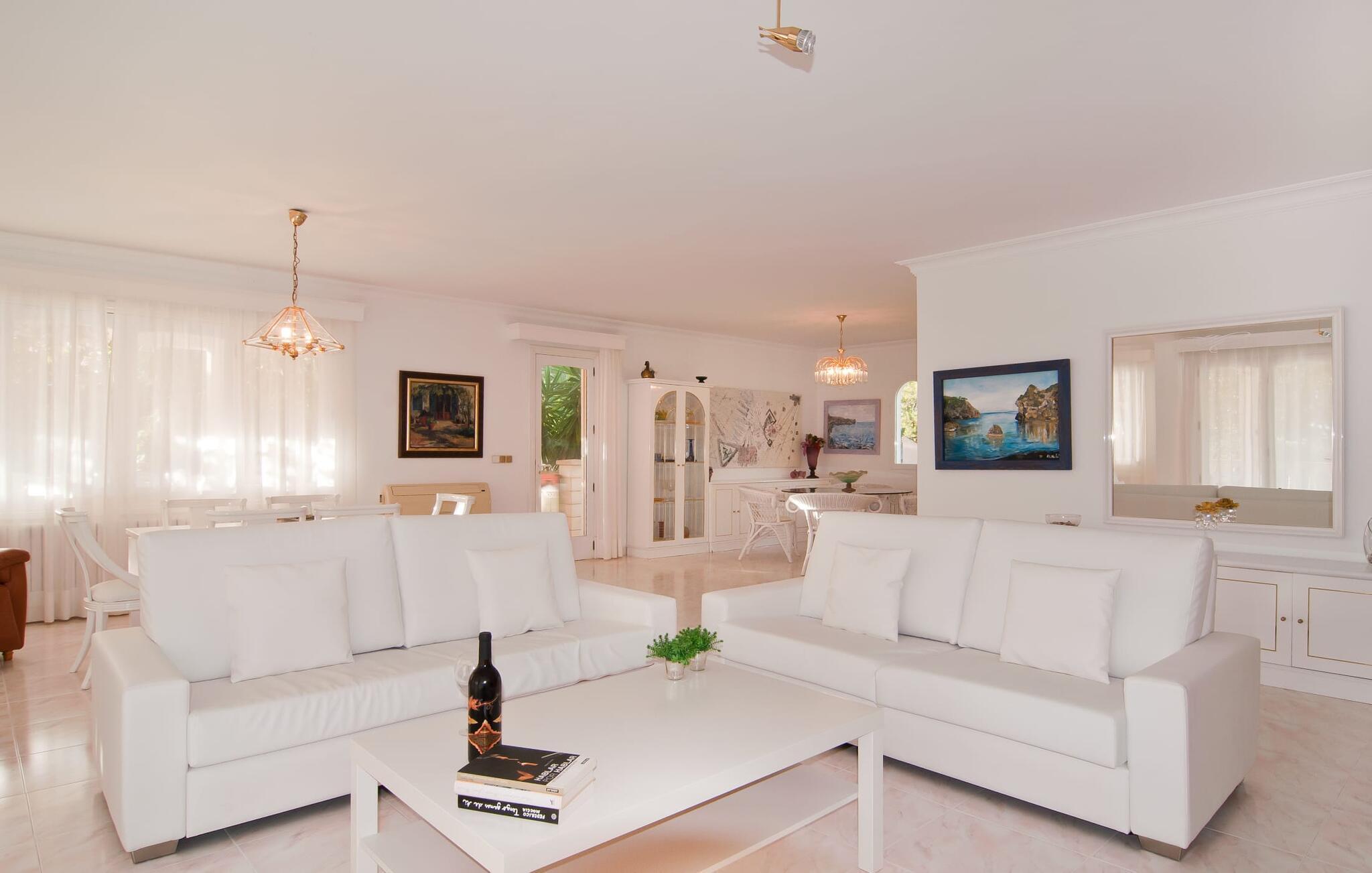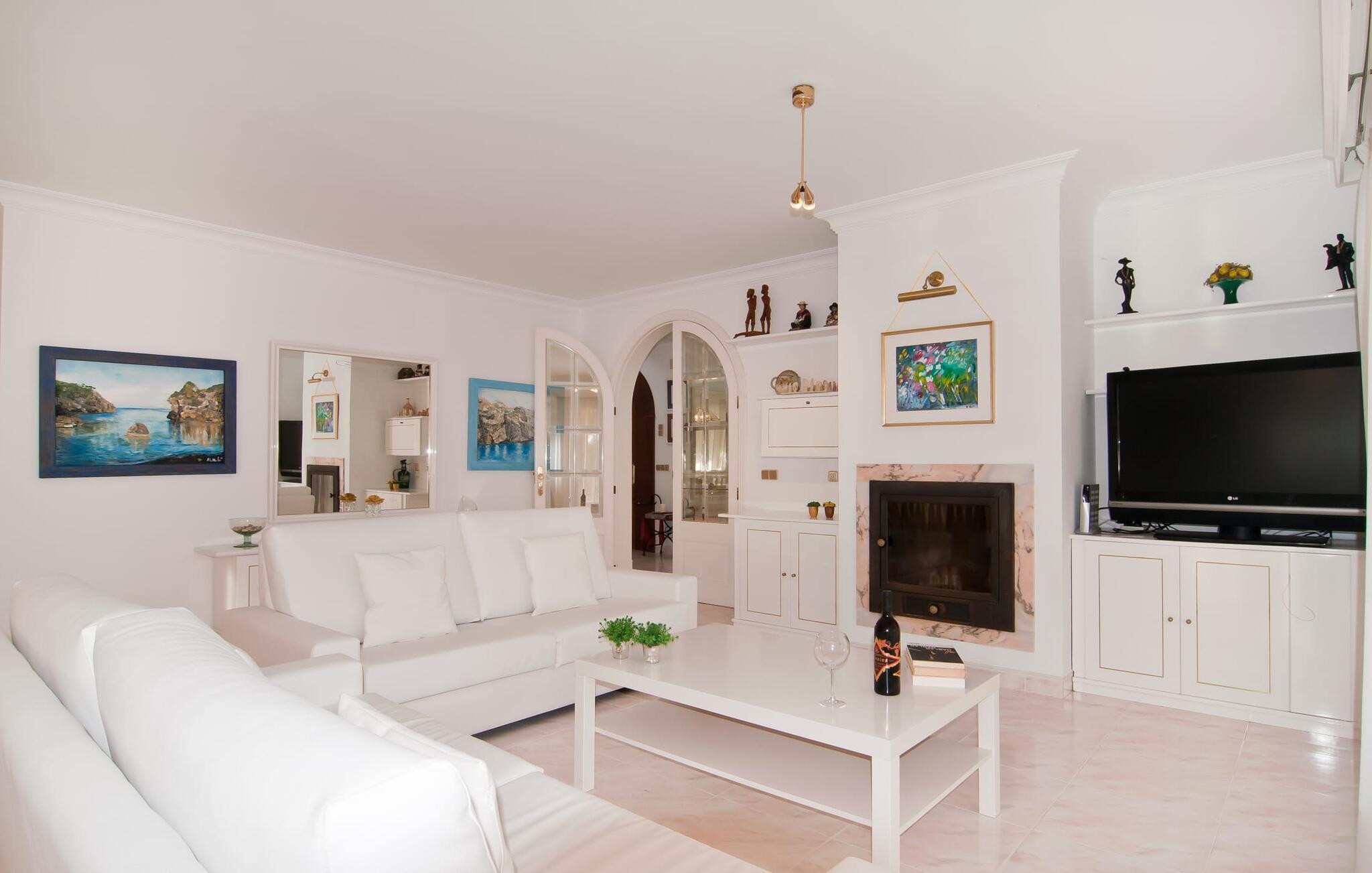 Das sehr gepflegte Haus besticht durch ein auffallend helles Ambiente, geprägt von weißen Wänden und Möbeln, gekonnt akzentuiert durch wohldosierte Farbtupfer. Auch bei der Dekoration wurde ebenso sparsam wie geschmackvoll vorgegangen. Auf diese Weise ist ein klares, elegantes Flair entstanden, das Sie überzeugend dazu einlädt, die Zeit in der Villa zu genießen. Im schicken Eingangsbereich finden Sie das Treppenhaus und den Zugang zur Küche, wobei sich im Erdgeschoss auch ein Schlafzimmer mit Bad befindet. Dusche und Badewanne waren ursprünglich in den Raum integriert und nur noch durch eine Glaswand voneinander getrennt. Ein großes Wohn-/Esszimmer vervollständigt diese Etage. An kühlen Abenden sorgt der Kamin für zusätzliche heimelige Behaglichkeit. Anspruchsvolle gemeinsame Mahlzeiten können Sie drinnen an einem der beiden Esstische genießen. Die ebenfalls weiße Küche ist geräumig und komplett ausgestattet mit allem, was Sie für Ihren täglichen Küchenbedarf benötigen, einschließlich Wasserkocher, Filter und Espressomaschine. Im Obergeschoss befinden sich ein weiteres Schlafzimmer und zwei Badezimmer, die jeweils von zwei Schlafzimmern gemeinsam genutzt werden. Ein Bügeleisen und ein Haartrockner sind vorhanden, sodass Sie keinen eigenen von zu Hause mitbringen müssen.