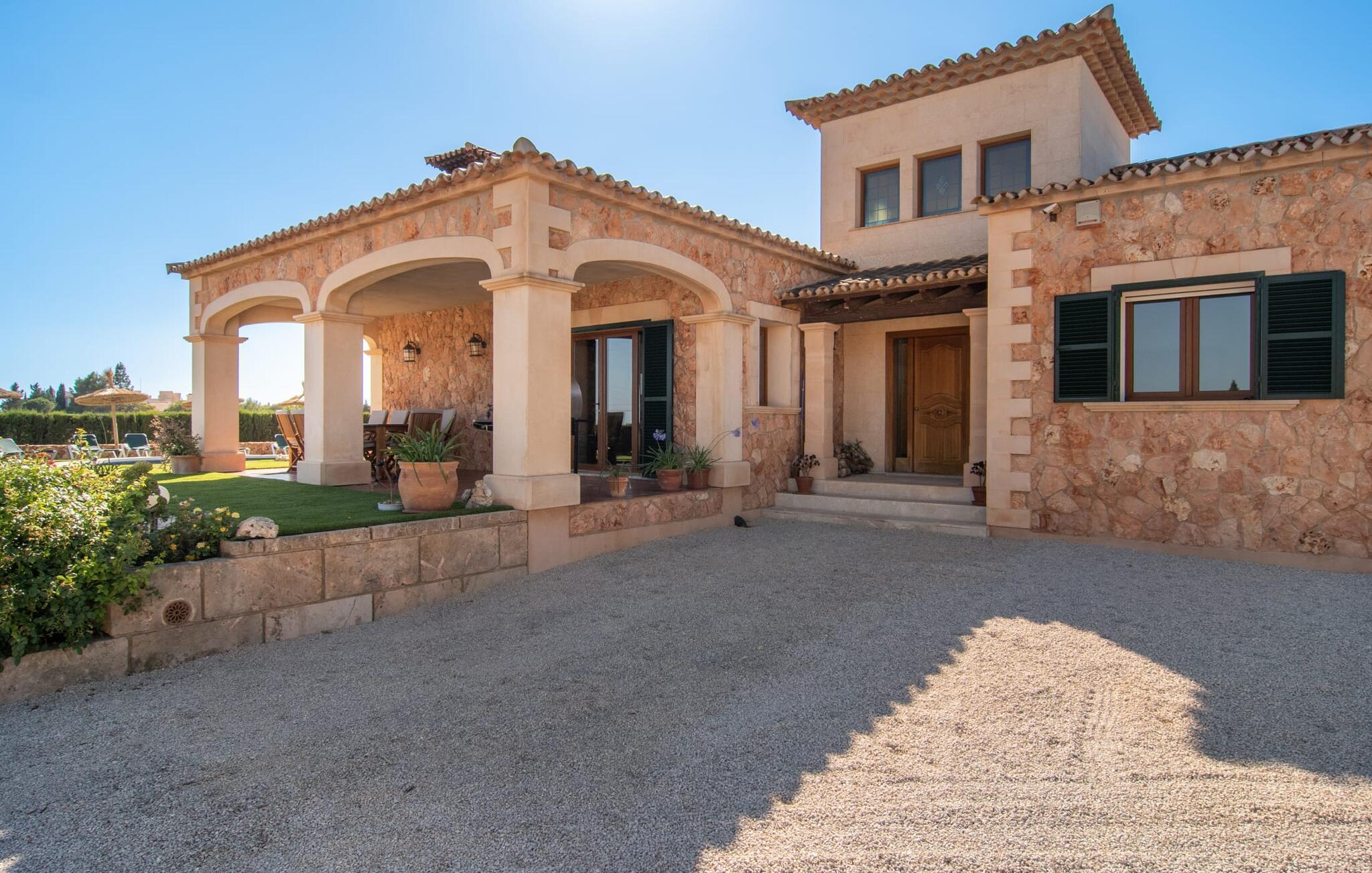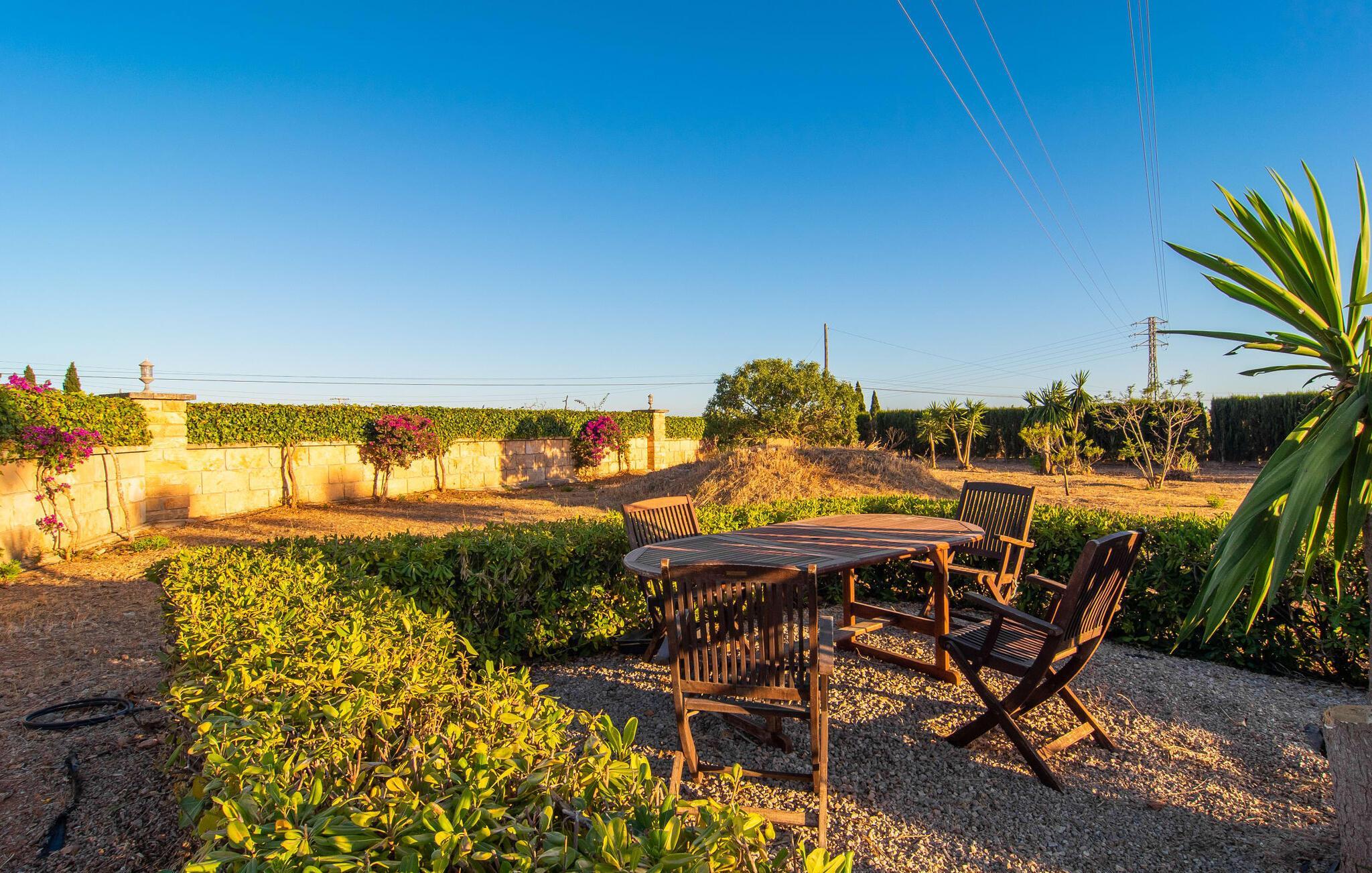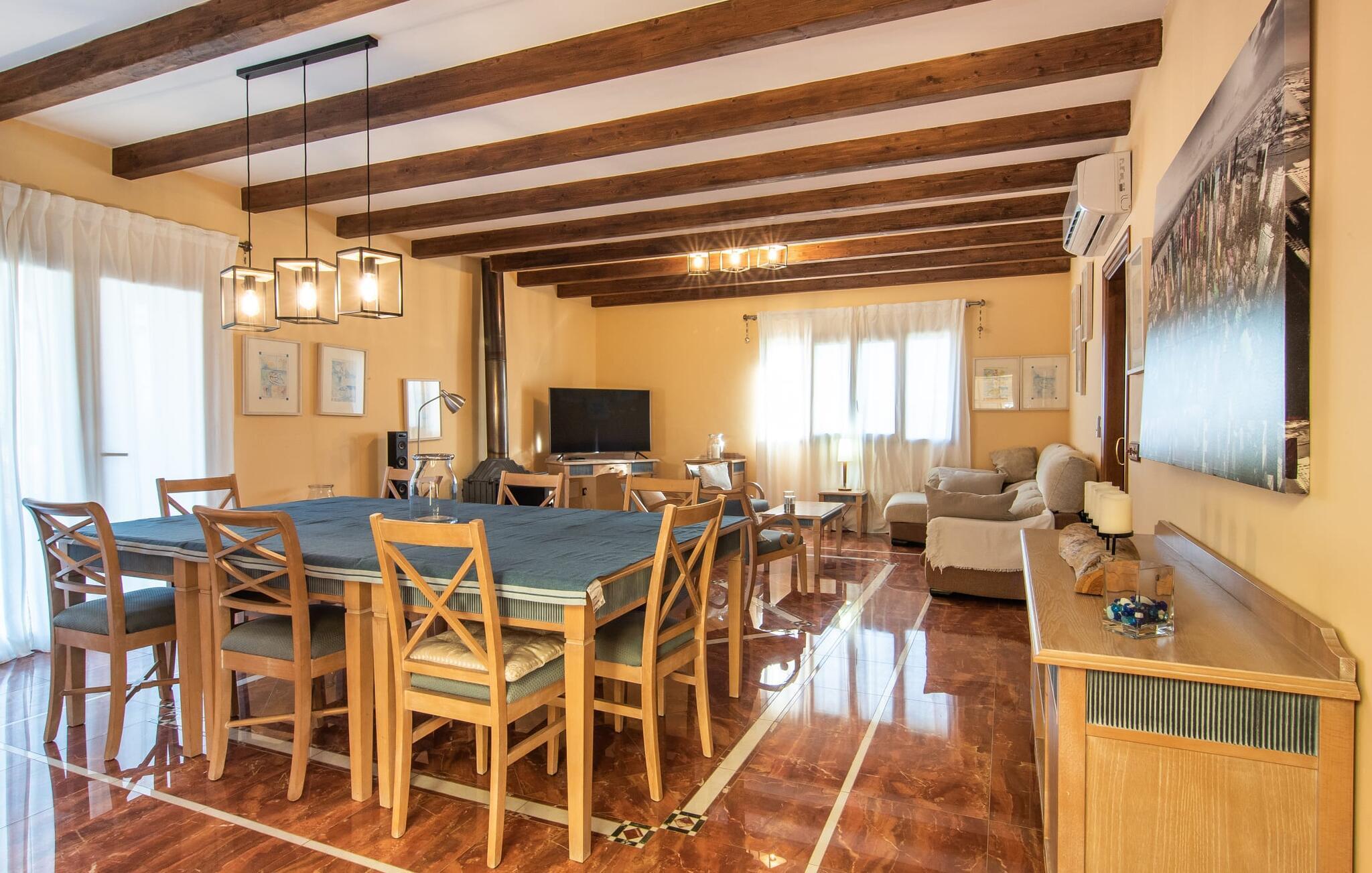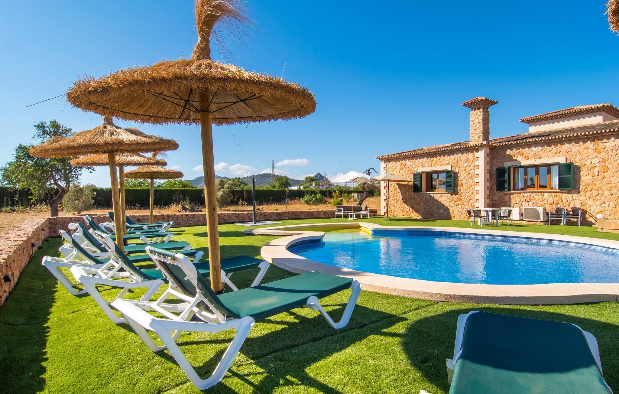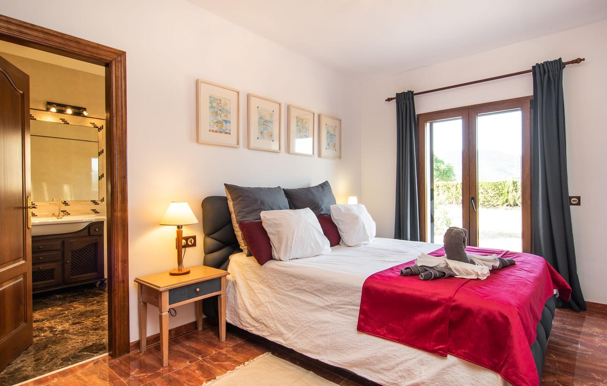 Das Interieur der Finca verbindet traditionellen rustikalen Charme mit modernem Komfort und zeichnet sich durch freundliche Farben, dunkle Holzakzente und Fliesenböden aus. Alle Zimmer liegen auf einer Ebene und bieten so einen einfachen Zugang für Familien mit kleinen Kindern. Der einladende Eingang führt zu einem großen offenen Wohn- und Essbereich, der mit einem gemütlichen Sofa, einem Fernseher und einem Kamin für kühlere Tage sowie einem langen Esstisch für Familienessen ausgestattet ist. Eine Schiebetür trennt diesen Raum von einer gut ausgestatteten Küche. Das Anwesen umfasst fünf Doppelzimmer und drei stilvolle Badezimmer, eines davon en Suite.