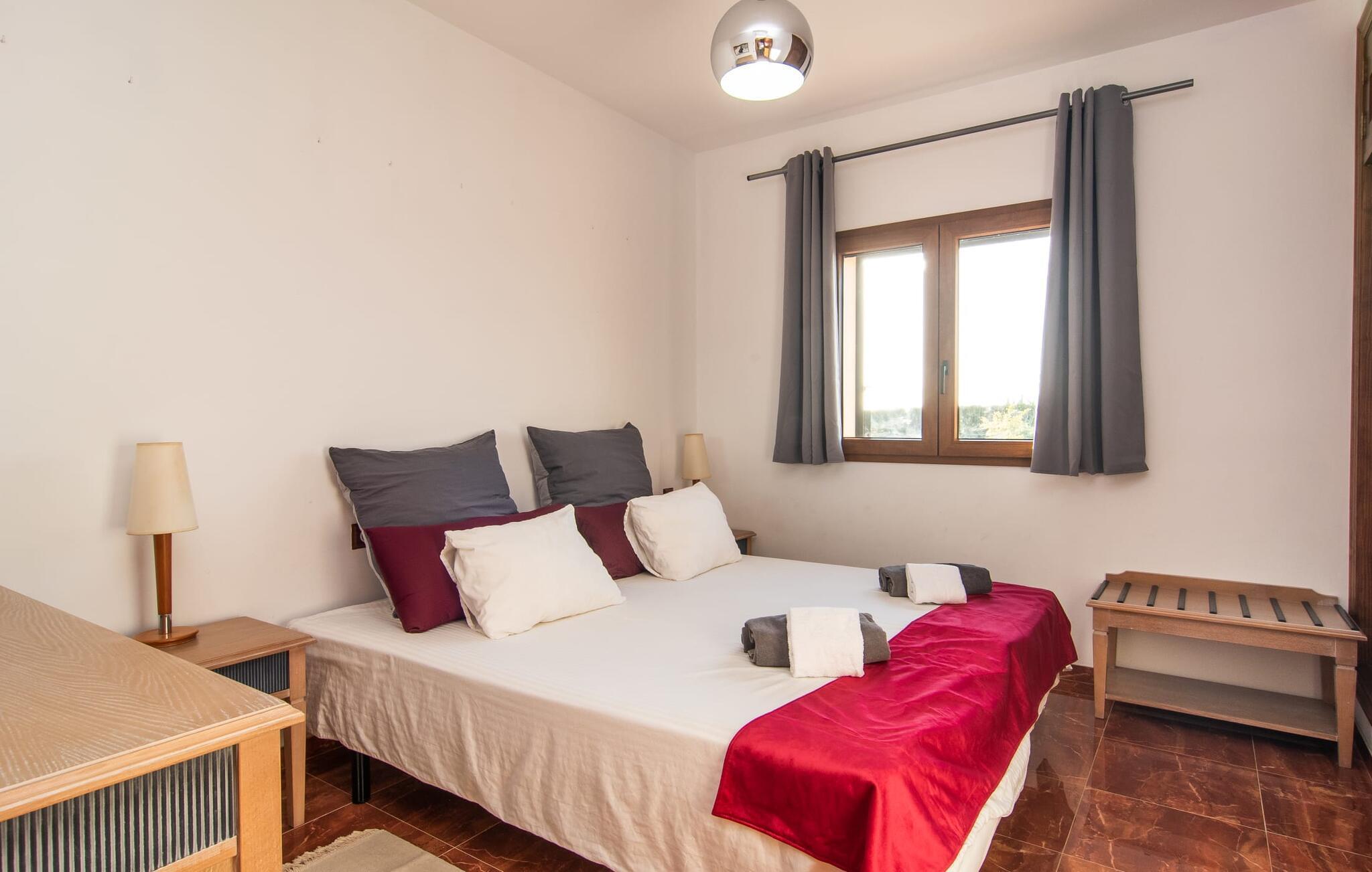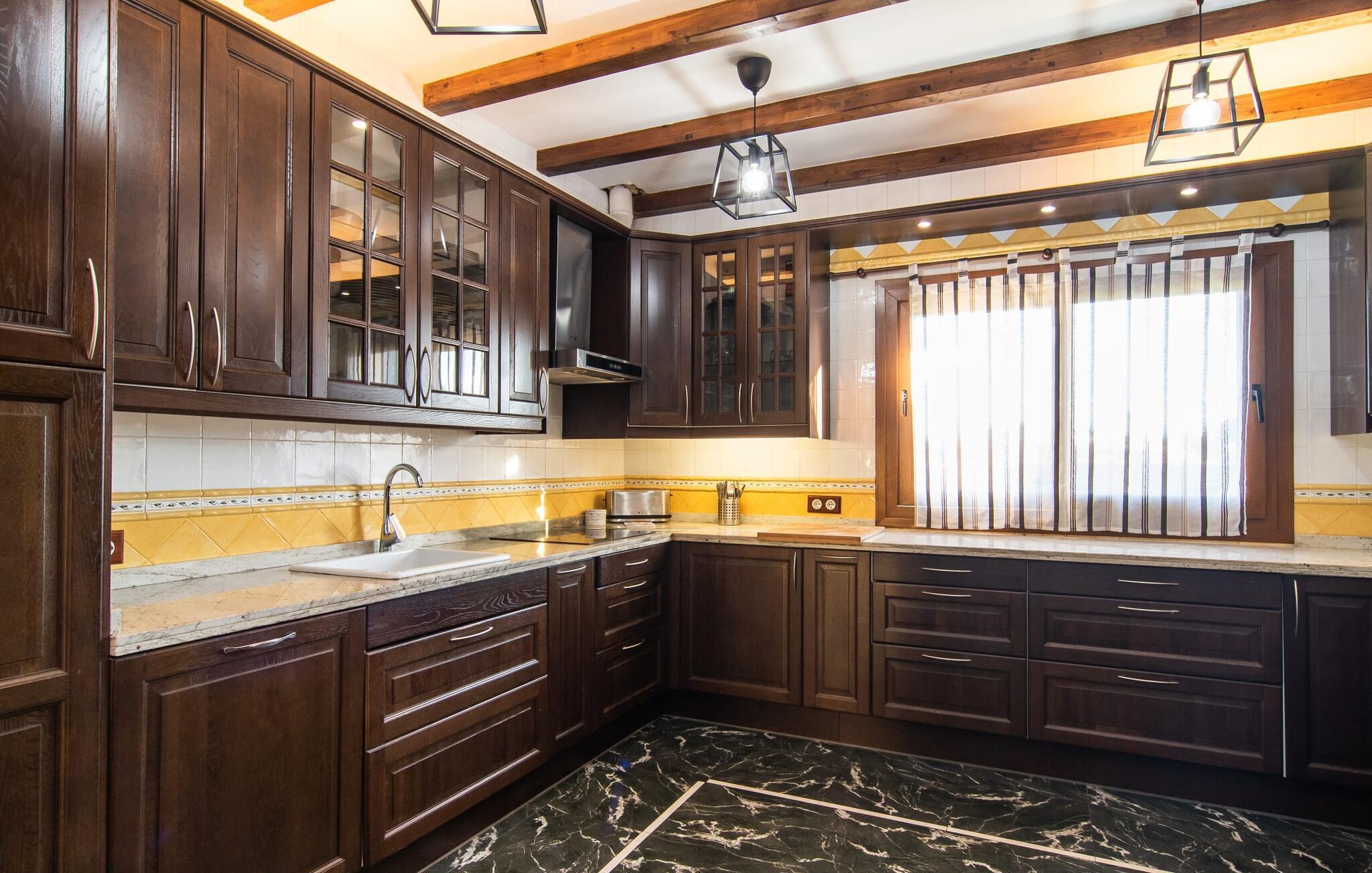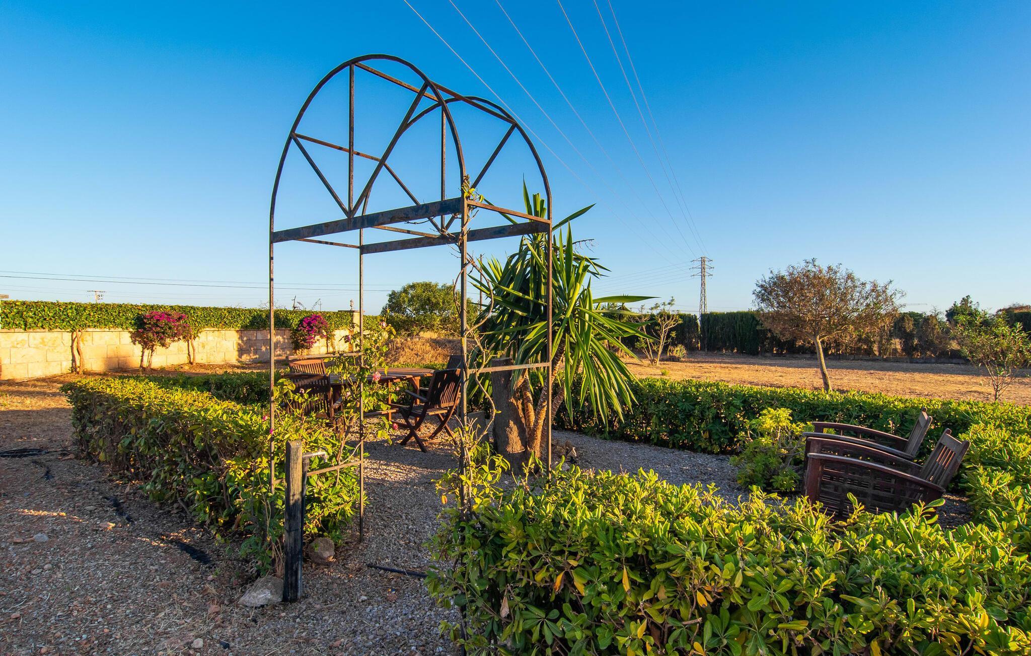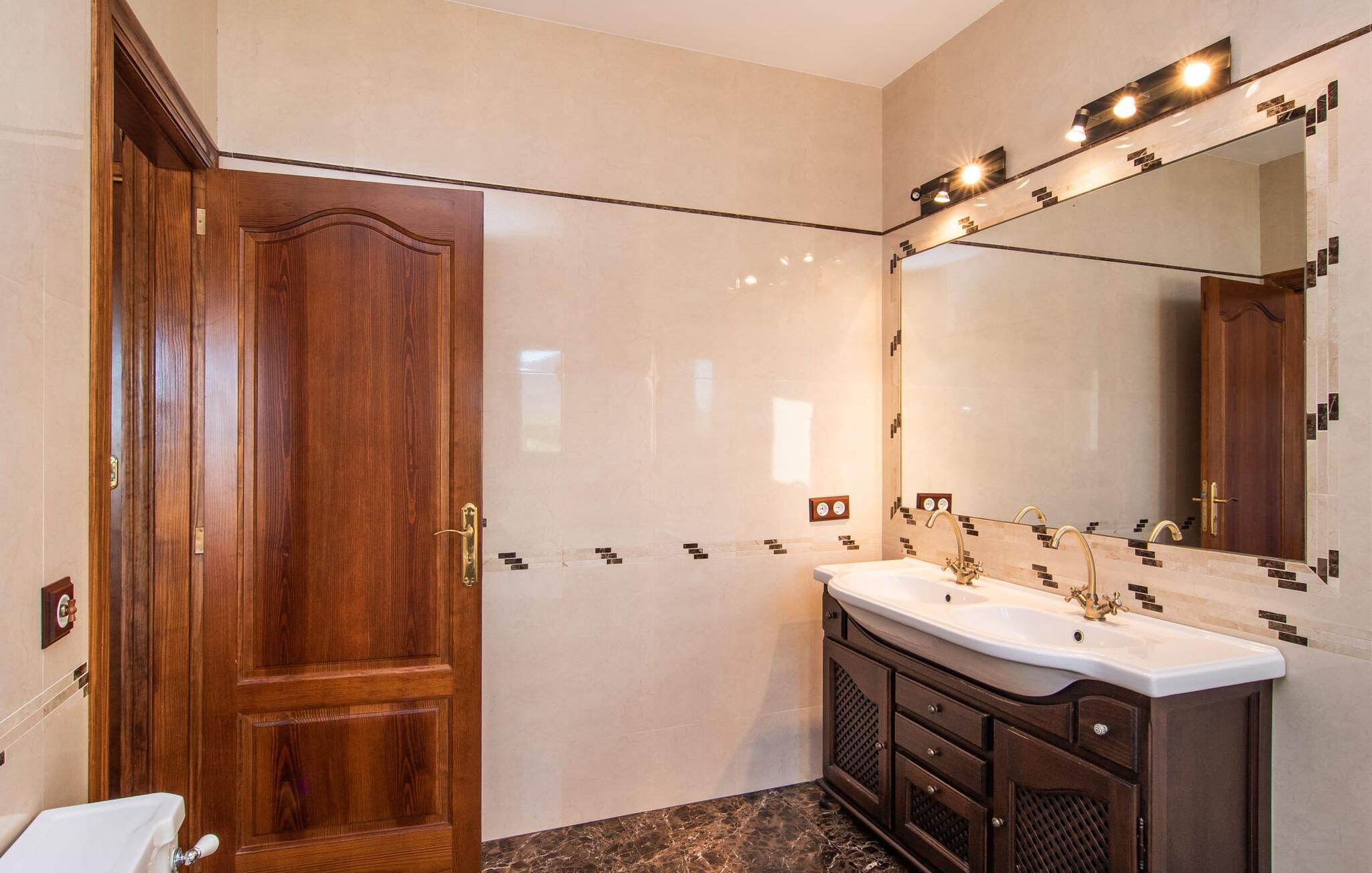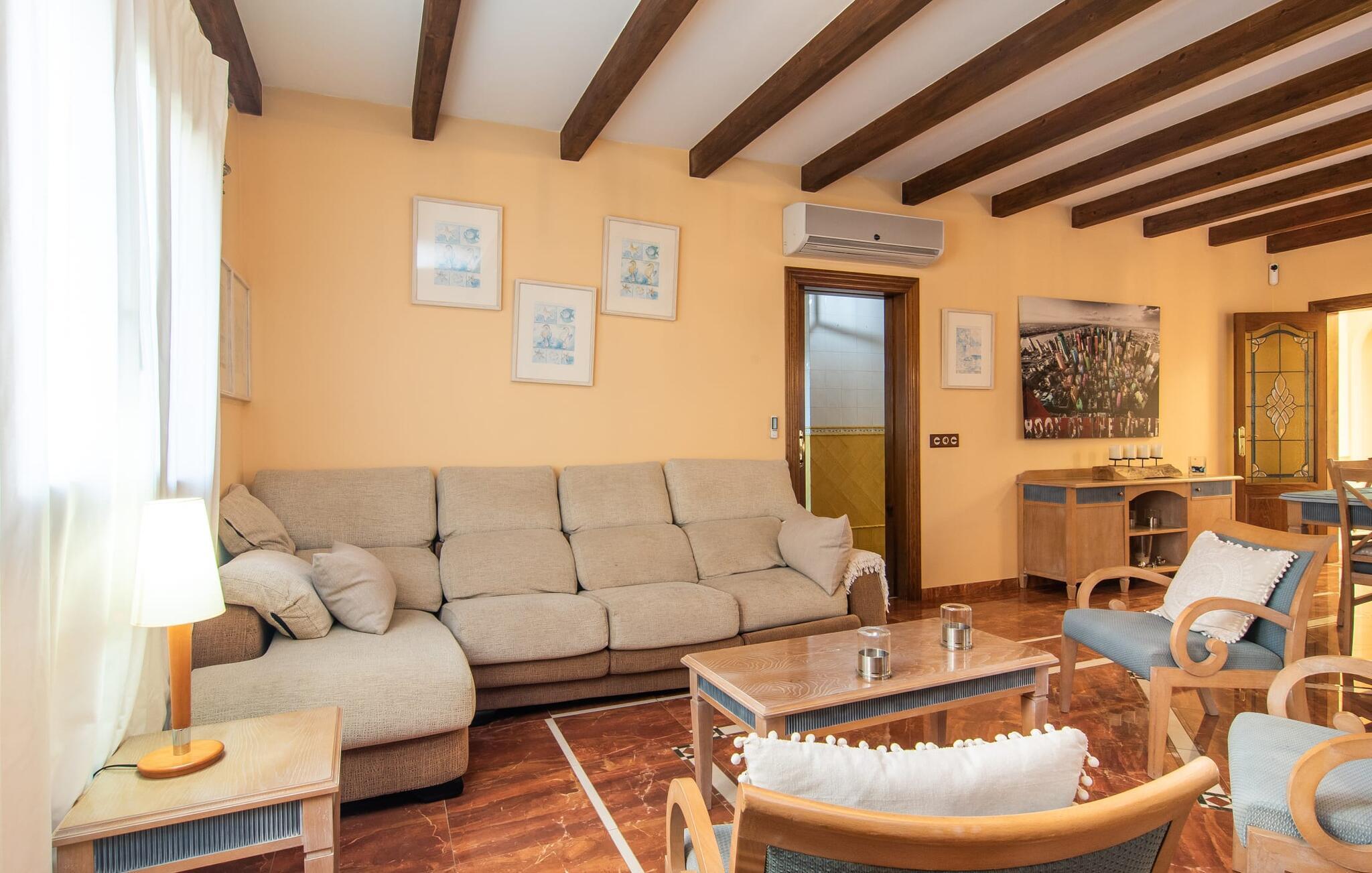 Das Interieur der Finca verbindet traditionellen rustikalen Charme mit modernem Komfort und zeichnet sich durch freundliche Farben, dunkle Holzakzente und Fliesenböden aus. Alle Zimmer liegen auf einer Ebene und bieten so einen einfachen Zugang für Familien mit kleinen Kindern. Der einladende Eingang führt zu einem großen offenen Wohn- und Essbereich, der mit einem gemütlichen Sofa, einem Fernseher und einem Kamin für kühlere Tage sowie einem langen Esstisch für Familienessen ausgestattet ist. Eine Schiebetür trennt diesen Raum von einer gut ausgestatteten Küche. Das Anwesen umfasst fünf Doppelzimmer und drei stilvolle Badezimmer, eines davon en Suite.