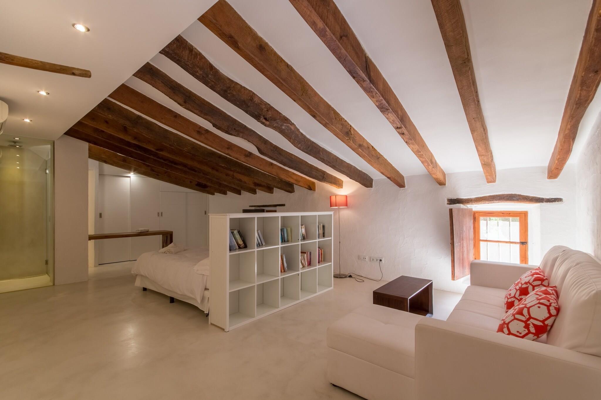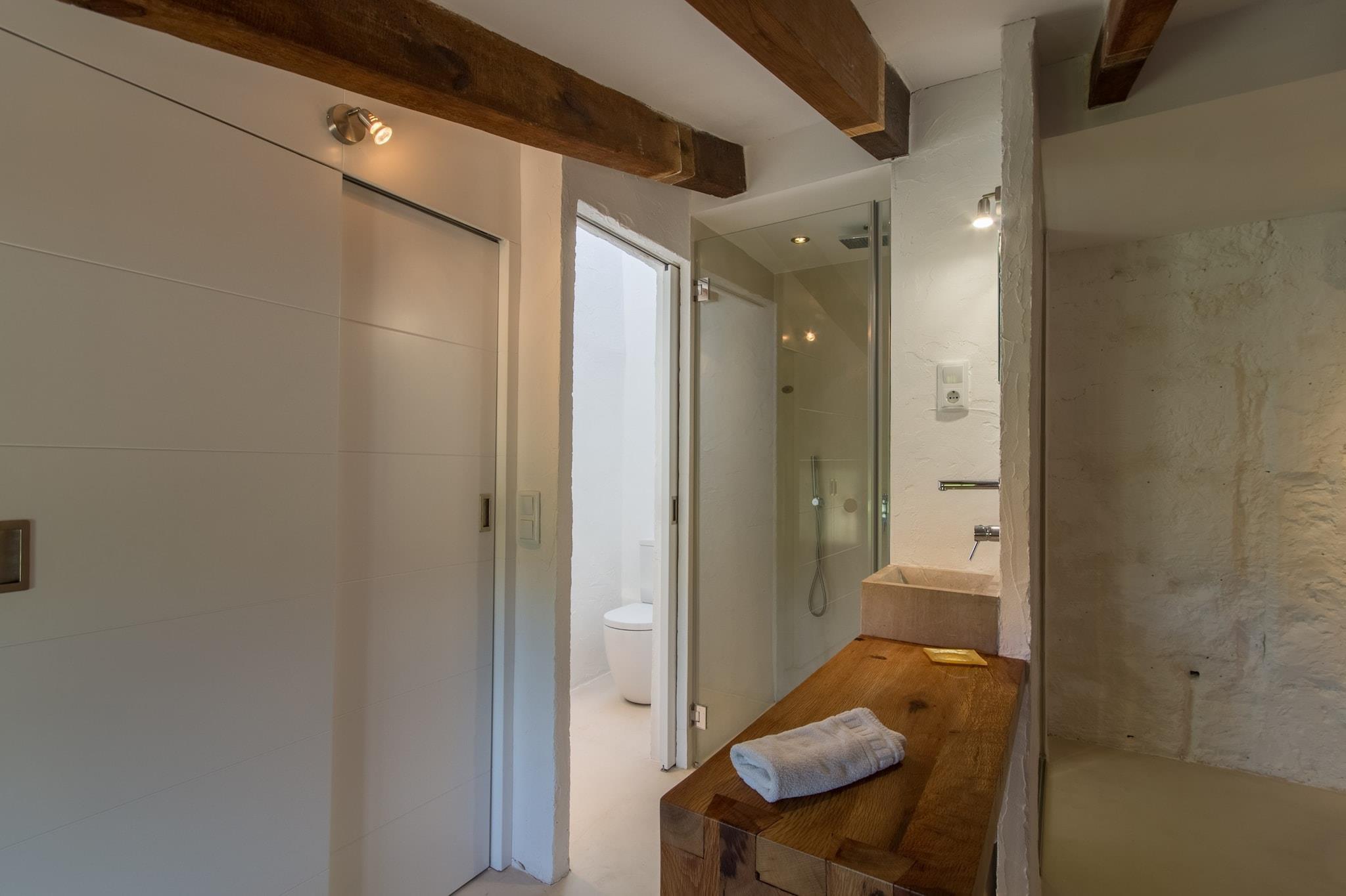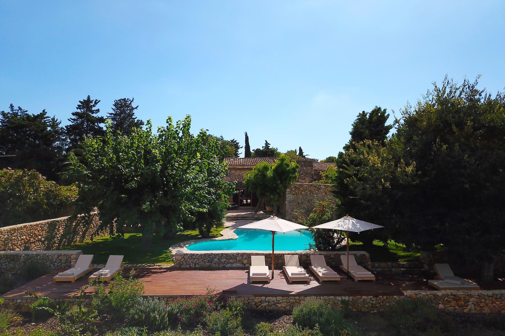 This charming country house, Es Rafal Vell de Buger offers a peaceful retreat for up to 8 adults, with 5 double bedrooms and 5 bathrooms, providing ample space for everyone to enjoy a relaxing stay. The house is equipped with modern amenities, including air conditioning, free Wi-Fi, and a cozy fireplace, ensuring comfort throughout your stay. The property boasts a spacious garden with a stunning 42m² pond-shaped pool, surrounded by lush lawns, trees, and a chic wooden terrace. A large barbecue area with additional cooking facilities makes it ideal for outdoor dining, perfect for gathering with friends and family. Located in the idyllic village of Búger, in the north of Mallorca, this finca offers a serene escape from the hustle and bustle of everyday life. Surrounded by stunning views of the Albufera, the bay of Alcúdia, and the Tramuntana mountains, the property is just a short drive away from the beautiful Platja de Muro beach, where you can enjoy turquoise waters and soft sand. The village itself is known for its charming weekly market, held every Saturday in front of the town hall, and offers easy access to nearby supermarkets and other local attractions. The house combines rustic charm with modern comforts. The 400m² living space includes a large rustic kitchen, cozy living areas, and a blend of modern and antique furniture that adds to the character of the home. The upper floor features 4 spacious double bedrooms, each with an en-suite bathroom, ensuring privacy and comfort. The rental license number is VT/445