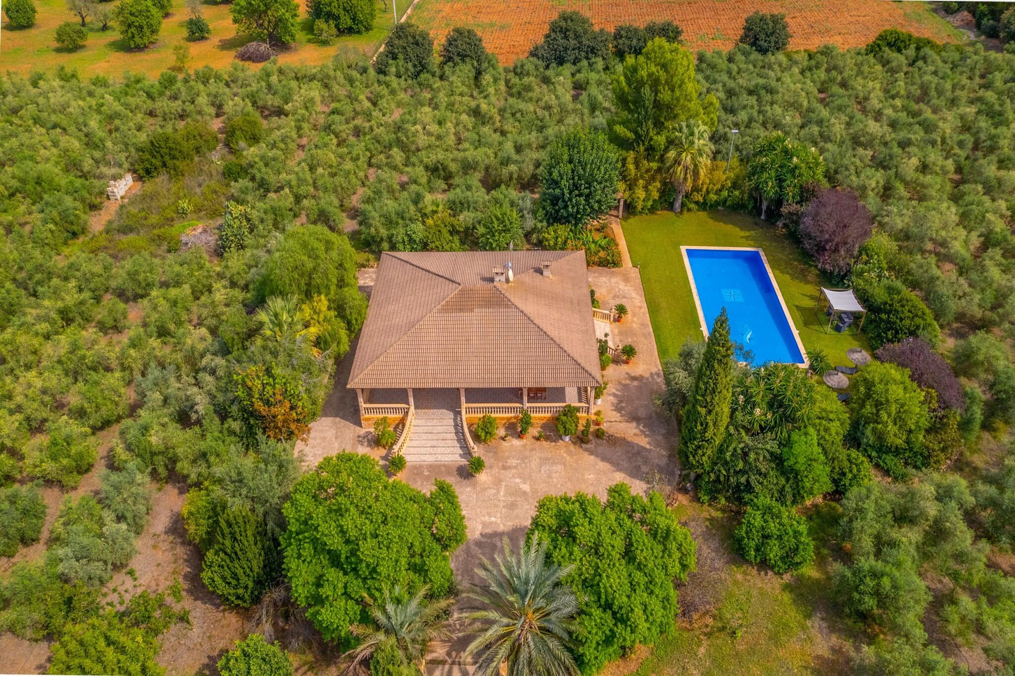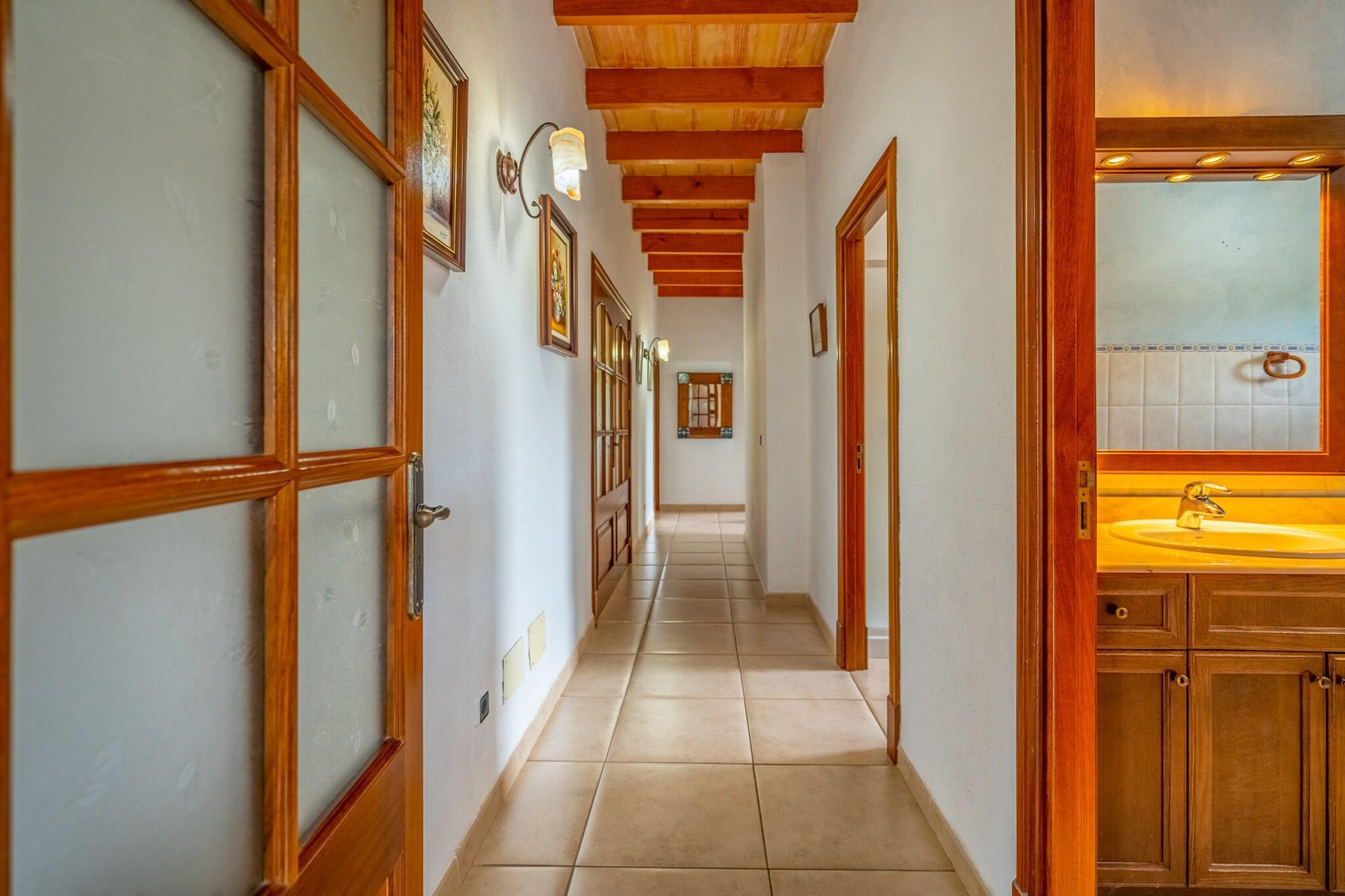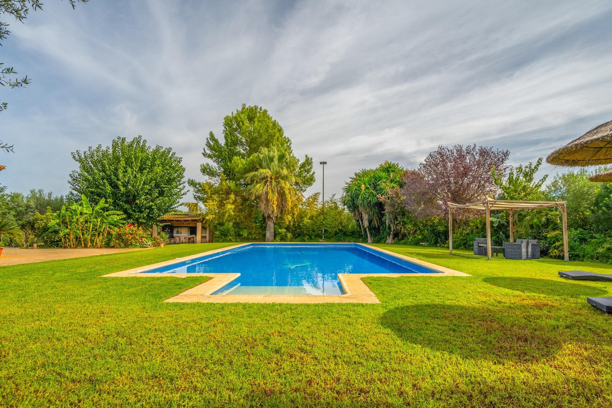 This charming country house Dofi Blau offers a peaceful retreat for up to 8 adults, with 5 double bedrooms and 5 bathrooms, providing ample space for everyone to enjoy a relaxing stay. The house is equipped with modern amenities, including air conditioning, free Wi-Fi, and a cozy fireplace, ensuring comfort throughout your stay. The property boasts a spacious garden with a stunning 42m² pond-shaped pool, surrounded by lush lawns, trees, and a chic wooden terrace. A large barbecue area with additional cooking facilities makes it ideal for outdoor dining, perfect for gathering with friends and family. Located in the idyllic village of Búger, in the north of Mallorca, this finca offers a serene escape from the hustle and bustle of everyday life. Surrounded by stunning views of the Albufera, the bay of Alcúdia, and the Tramuntana mountains, the property is just a short drive away from the beautiful Platja de Muro beach, where you can enjoy turquoise waters and soft sand. The village itself is known for its charming weekly market, held every Saturday in front of the town hall, and offers easy access to nearby supermarkets and other local attractions. The house combines rustic charm with modern comforts. The 400m² living space includes a large rustic kitchen, cozy living areas, and a blend of modern and antique furniture that adds to the character of the home. The upper floor features 4 spacious double bedrooms, each with an en-suite bathroom, ensuring privacy and comfort. The Rental License number is ETV/887