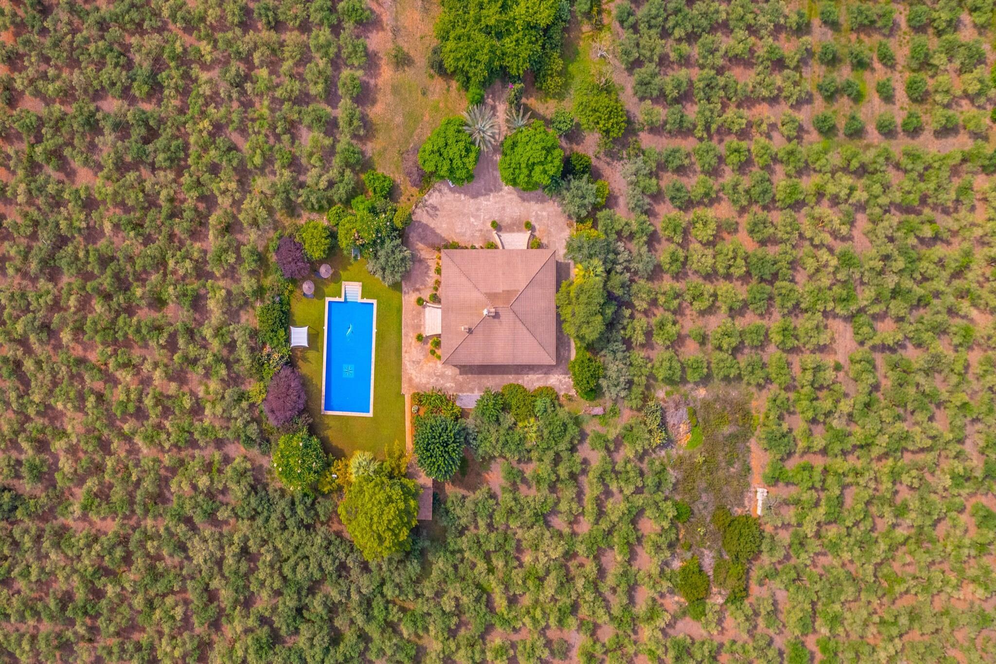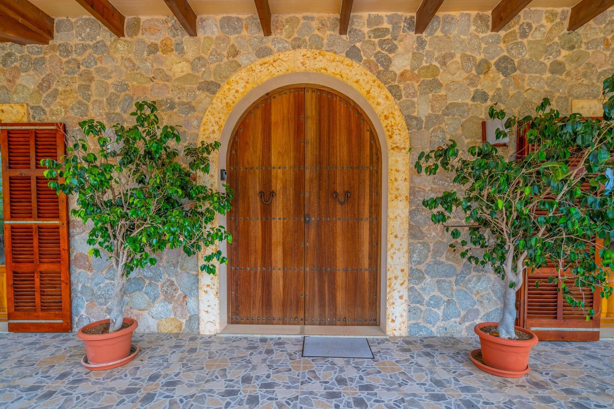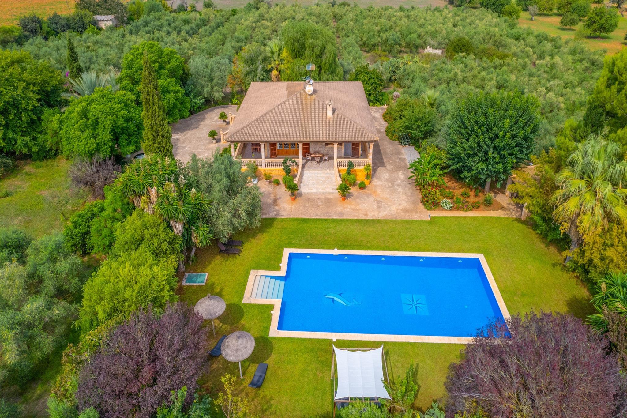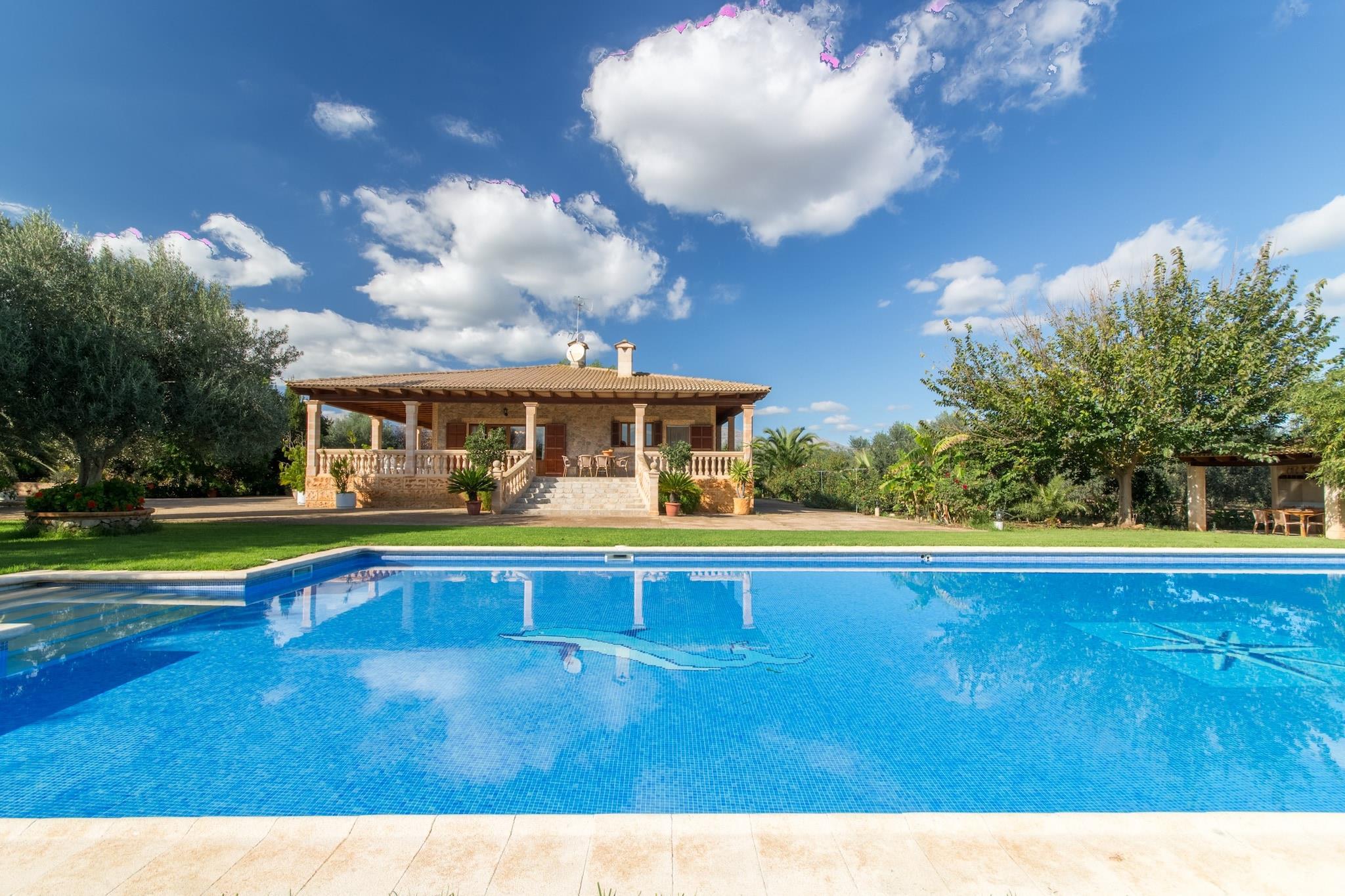 This charming country house Dofi Blau offers a peaceful retreat for up to 8 adults, with 5 double bedrooms and 5 bathrooms, providing ample space for everyone to enjoy a relaxing stay. The house is equipped with modern amenities, including air conditioning, free Wi-Fi, and a cozy fireplace, ensuring comfort throughout your stay. The property boasts a spacious garden with a stunning 42m² pond-shaped pool, surrounded by lush lawns, trees, and a chic wooden terrace. A large barbecue area with additional cooking facilities makes it ideal for outdoor dining, perfect for gathering with friends and family. Located in the idyllic village of Búger, in the north of Mallorca, this finca offers a serene escape from the hustle and bustle of everyday life. Surrounded by stunning views of the Albufera, the bay of Alcúdia, and the Tramuntana mountains, the property is just a short drive away from the beautiful Platja de Muro beach, where you can enjoy turquoise waters and soft sand. The village itself is known for its charming weekly market, held every Saturday in front of the town hall, and offers easy access to nearby supermarkets and other local attractions. The house combines rustic charm with modern comforts. The 400m² living space includes a large rustic kitchen, cozy living areas, and a blend of modern and antique furniture that adds to the character of the home. The upper floor features 4 spacious double bedrooms, each with an en-suite bathroom, ensuring privacy and comfort. The Rental License number is ETV/887