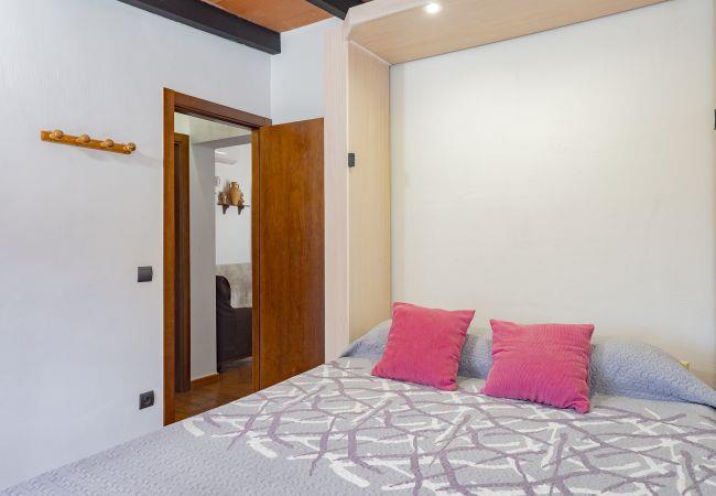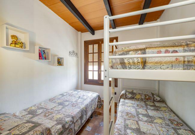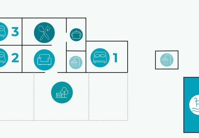 The rural house has three bedrooms with capacity for 8 people: two bedrooms to the left of the entrance and one to the right, all with exterior windows and space to store luggage. The beds are distributed in a double bed, a single bed, and a bunk bed; the main bedroom offers a double bed and a single bed. Additionally, it has an interior bathroom with a shower tray and another full exterior bathroom with a shower tray, facilitating comfort for large groups.