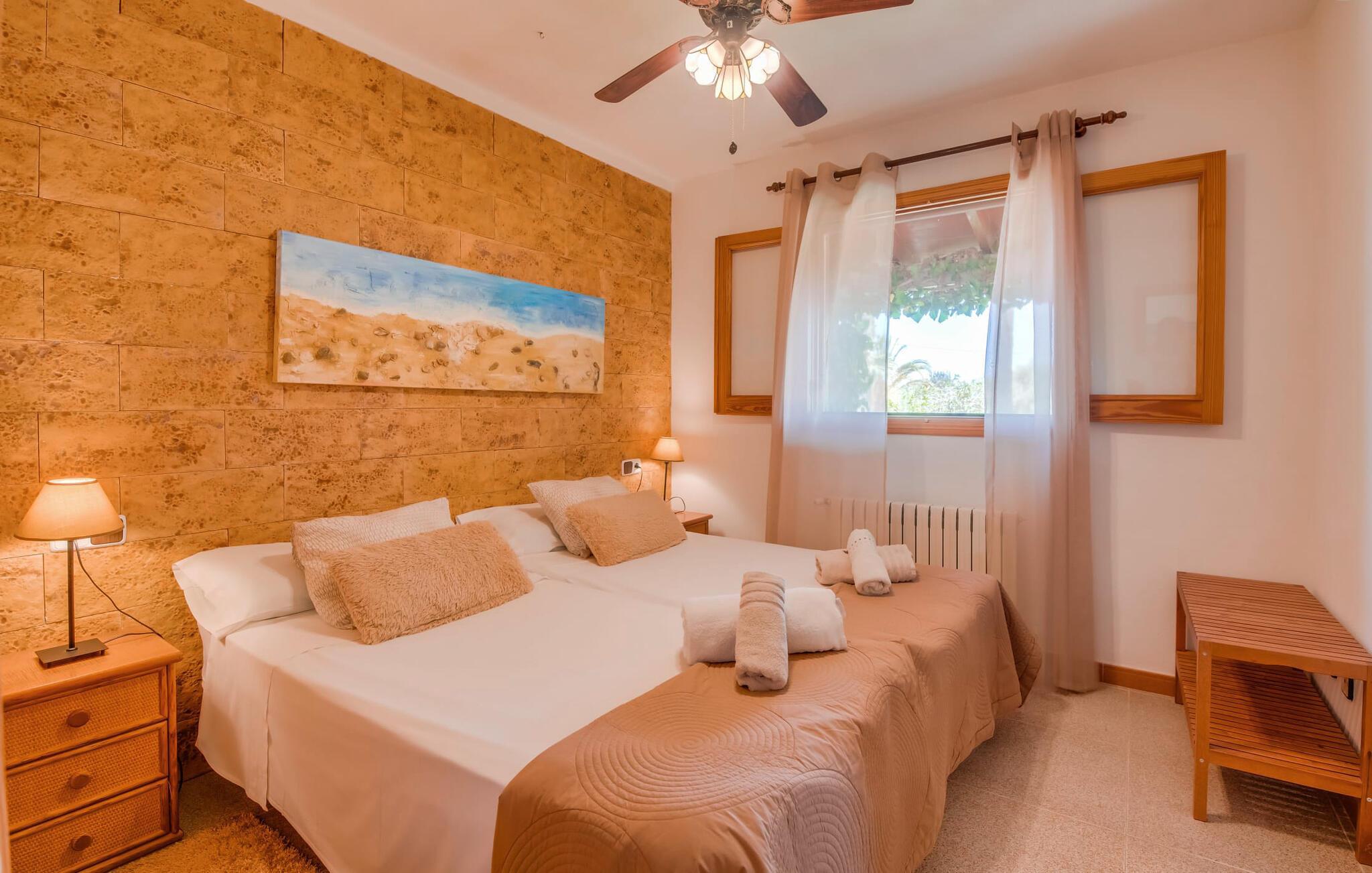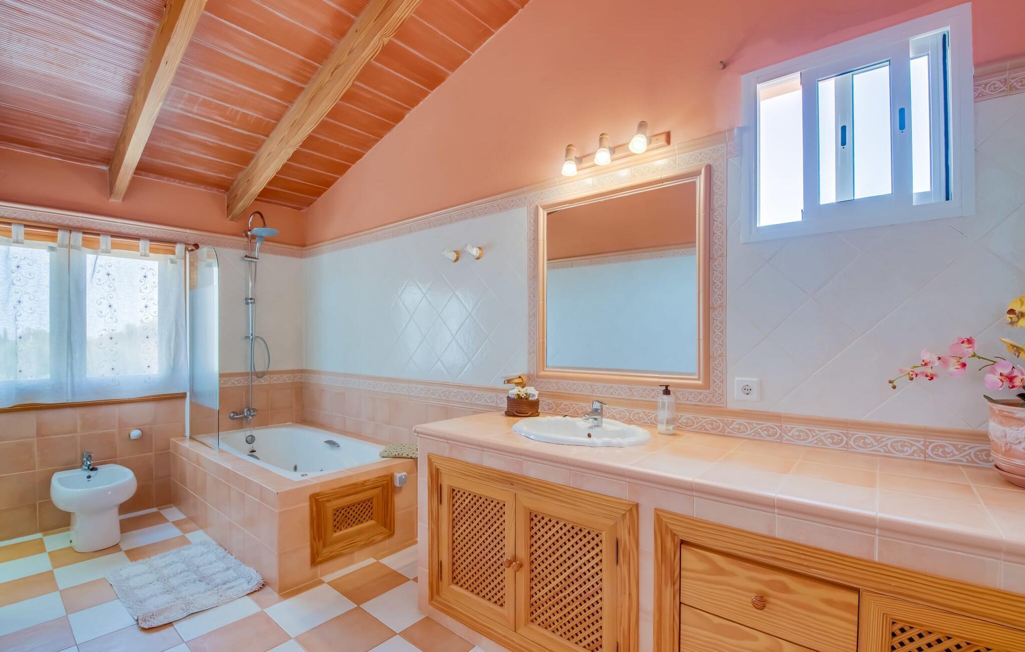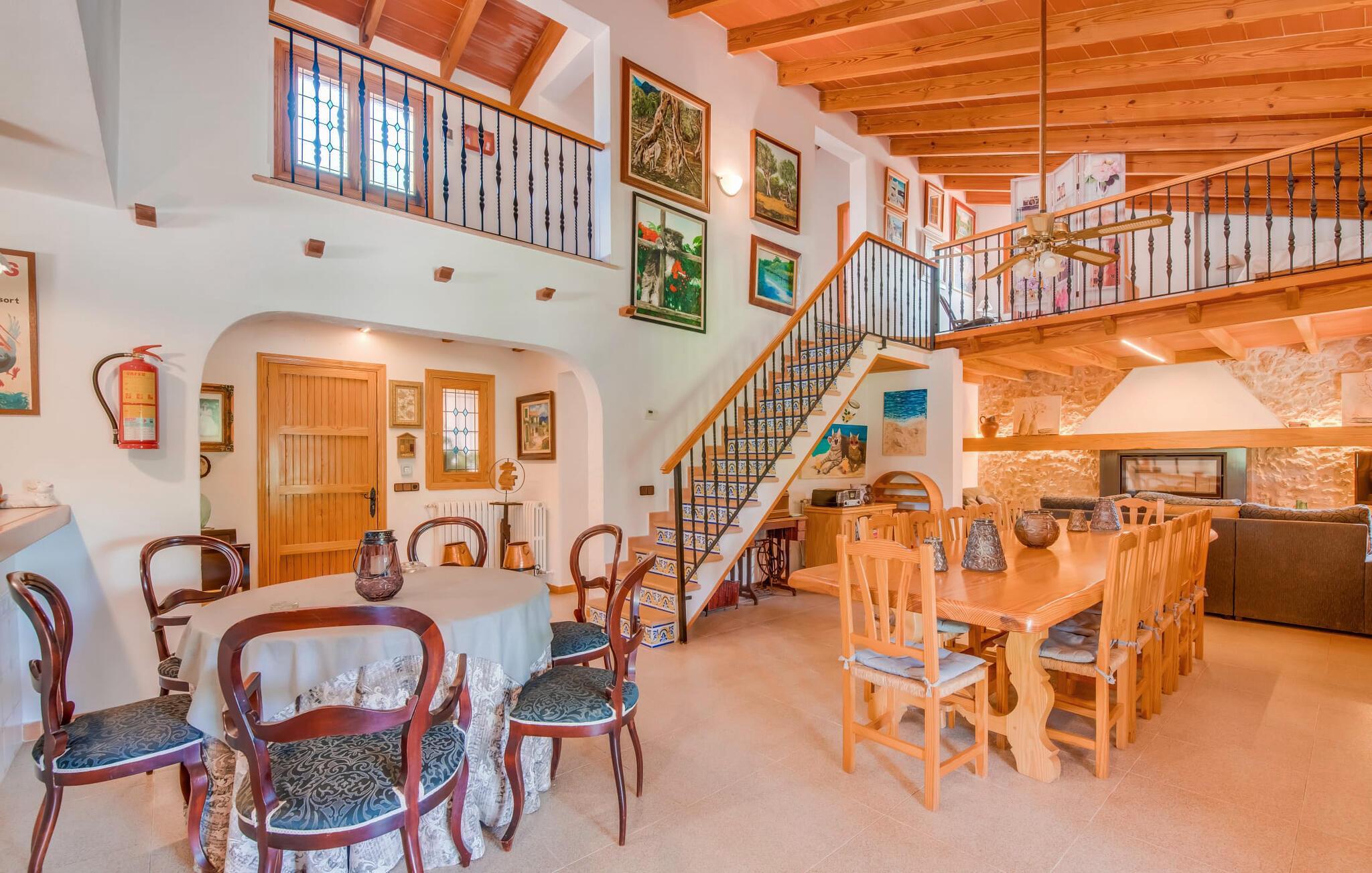 Besonders beeindruckend an der Inneneinrichtung ist die lockere, lockere Atmosphäre, die durch den großen offenen Wohn-/Essbereich im Erdgeschoss mit einer Treppe, die bis zur offenen Galerie und den Zimmern im Obergeschoss führt, ermöglicht wird. Im Erdgeschoss befindet sich eine gemütliche Sofagarnitur vor einem offenen Kamin, wo Sie einen entspannten Abend vor dem Fernseher verbringen können. Direkt daneben steht ein riesiger Esstisch, der mehr als genug Platz für alle Mitreisenden bietet. Der Küchenbereich ist durch eine lange Theke mit handbemalten Fliesen und einer schweren Holzdiele optisch vom Rest des Raumes getrennt. Genießen Sie auch im Urlaub die komplette Ausstattung – darunter eine Mikrowelle, einen Wasserkocher, eine Kaffeemaschine, einen Herd mit Gasherd und sogar einen Geschirrspüler – alle Annehmlichkeiten, die Sie sich für den autarken Urlaub wünschen, für den Sie sich entschieden haben. Im Erdgeschoss befinden sich außerdem zwei Schlafzimmer und ein komfortables Badezimmer, die sie sich teilen können. Zwei weitere Schlafzimmer und zwei stilvolle Badezimmer befinden sich im Obergeschoss hinter dem offenen Galeriebereich. Die gemütlichen Schlafzimmer verfügen über freiliegende Holzdecken und ausreichend Stauraum für die Kleidung, die Sie mitbringen oder während Ihres Aufenthalts mitnehmen. Alle Badezimmer sind angenehm in einem modernen Stil eingerichtet; Zwei davon verfügen über ein Bad mit Duscharmatur und das dritte über eine maßgefertigte Einbaudusche. In der gastfreundlichen Villa „Ca Na Bisquerra“ ist alles praktisch und unkompliziert, genau so, wie Sie sich Ihren Urlaub wünschen, und dieser Ort bietet das ideale Ambiente für ein solches Erlebnis.