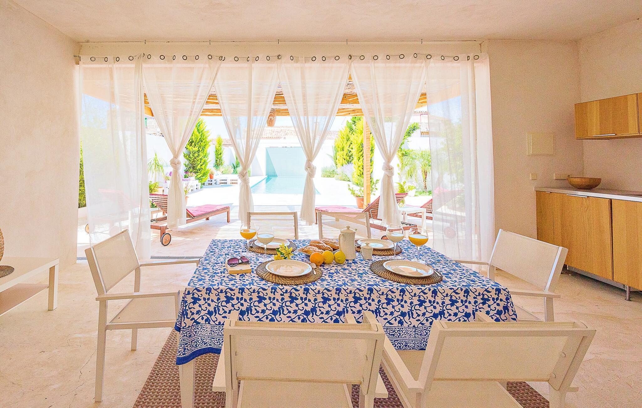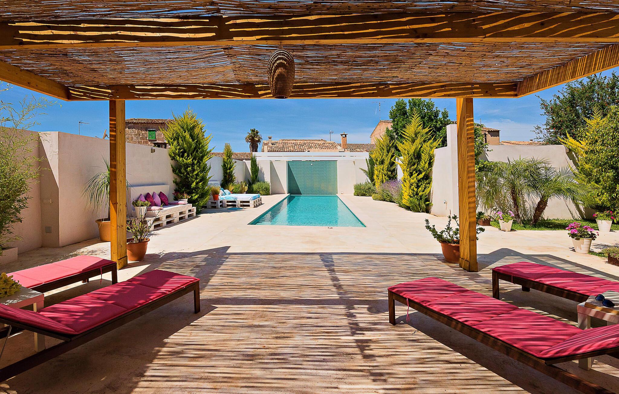 Sie möchten in einem authentischen mallorquinischen Haus Urlaub machen, aber dennoch privat sein und eine gute Infrastruktur genießen? Dann lohnt es sich, einen genaueren Blick darauf zu werfen. Die Villa „Ca Na Molinera“ vereint diese Qualitäten nicht nur, sondern ergänzt sie mit einer modernen und sehr stilvollen Atmosphäre, in der Sie sich mit Sicherheit wohlfühlen werden. Das Feriendomizil liegt direkt in der zentralen Region Pla de Mallorca im Dorf Sant Joan, das Ihnen ein typisches, fast ursprüngliches Flair bietet. Die Villa wirkt wie eine Oase, die sich durch ihre stilvolle Ausstattung von der Umgebung abhebt. Alles wirkt auf den ersten Blick sehr hell und strahlend und der malerische Außenbereich lädt zu langen, vergnüglichen Stunden im Freien ein. Einige mediterrane Pflanzen, teilweise in Töpfen, schmücken die ansonsten schlichten und überwiegend weißen Flächen. Direkt neben dem Haus befindet sich eine tolle Chill-Out-Zone aus Palettenmöbeln. Hier können Sie den ganzen Tag über entspannen, am besten bei einem kühlen Getränk und vielleicht einem erfrischenden Snack. Bunte Kissen peppen das Ganze mit hellen Tönen auf. Der breite Weg zum Pool führt zunächst an weiteren Ruhezonen vorbei, die perfekte Orte für entspannte Stunden im Freien darstellen und garantiert bei allen Reisenden beliebt sind. Der Pool ist für ein Stadthaus sehr groß. Auf einer Länge von 12 m können Sie echte Runden schwimmen – haben Sie das schon einmal gemacht, früh am Morgen, wenn das Licht des Tages und das Leben um Sie herum zu erwachen beginnt? Wenn nicht, dann sollten Sie dies unbedingt tun und diese ganz besondere Form von Luxus genießen. Zum Entspannen stehen Ihnen anschließend bequeme Liegen zur Verfügung. Darüber hinaus gibt es am Pool ein weiteres Highlight – eine Art renovierte Garage, in der Sie eine tolle Außenküche mit Esstisch und Kühlschrank finden. In diesem stilvollen Ambiente mit schönem Blick auf den Pool können Sie gemeinsam speisen und abends eine Grillsession zelebrieren.