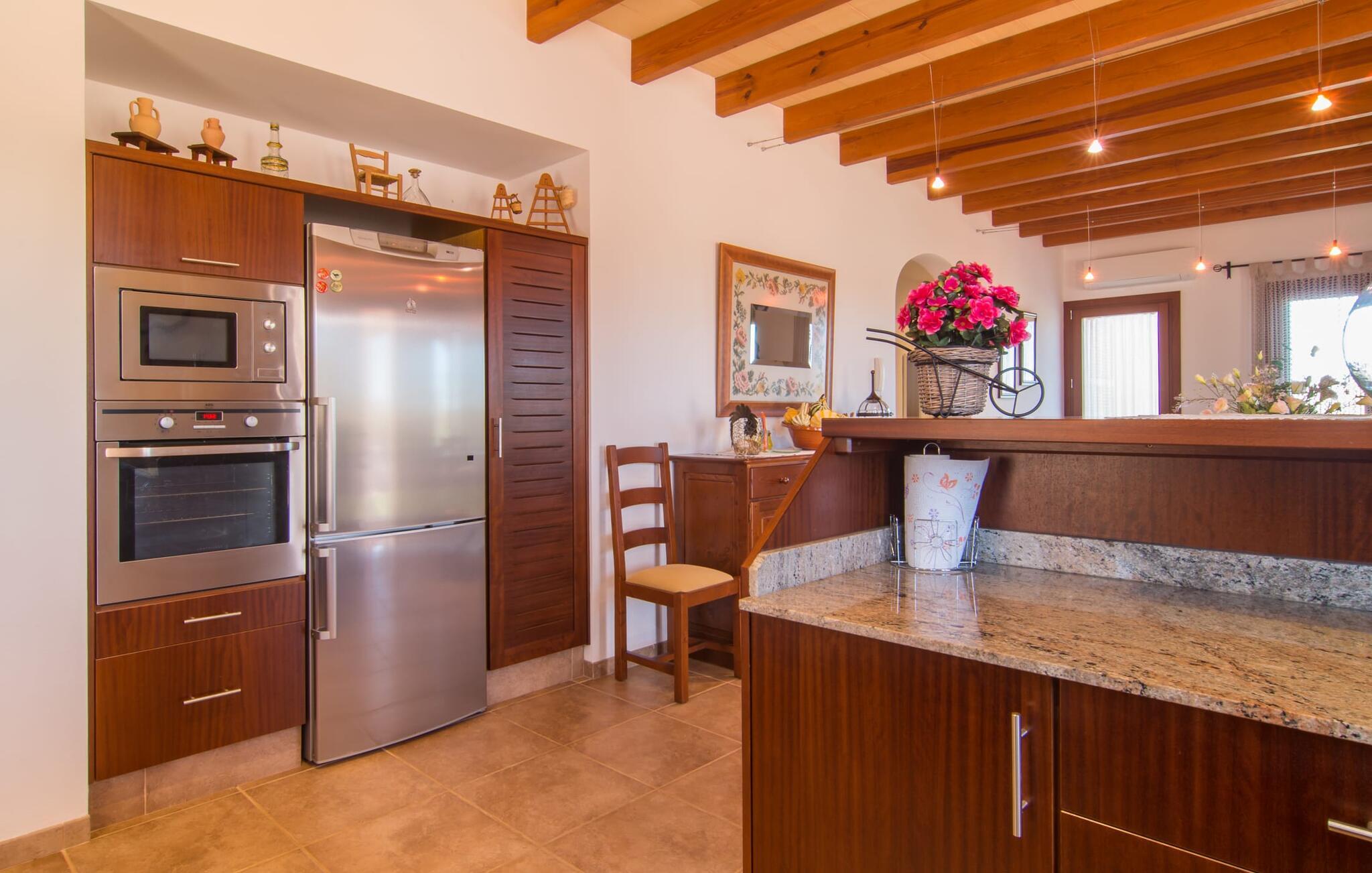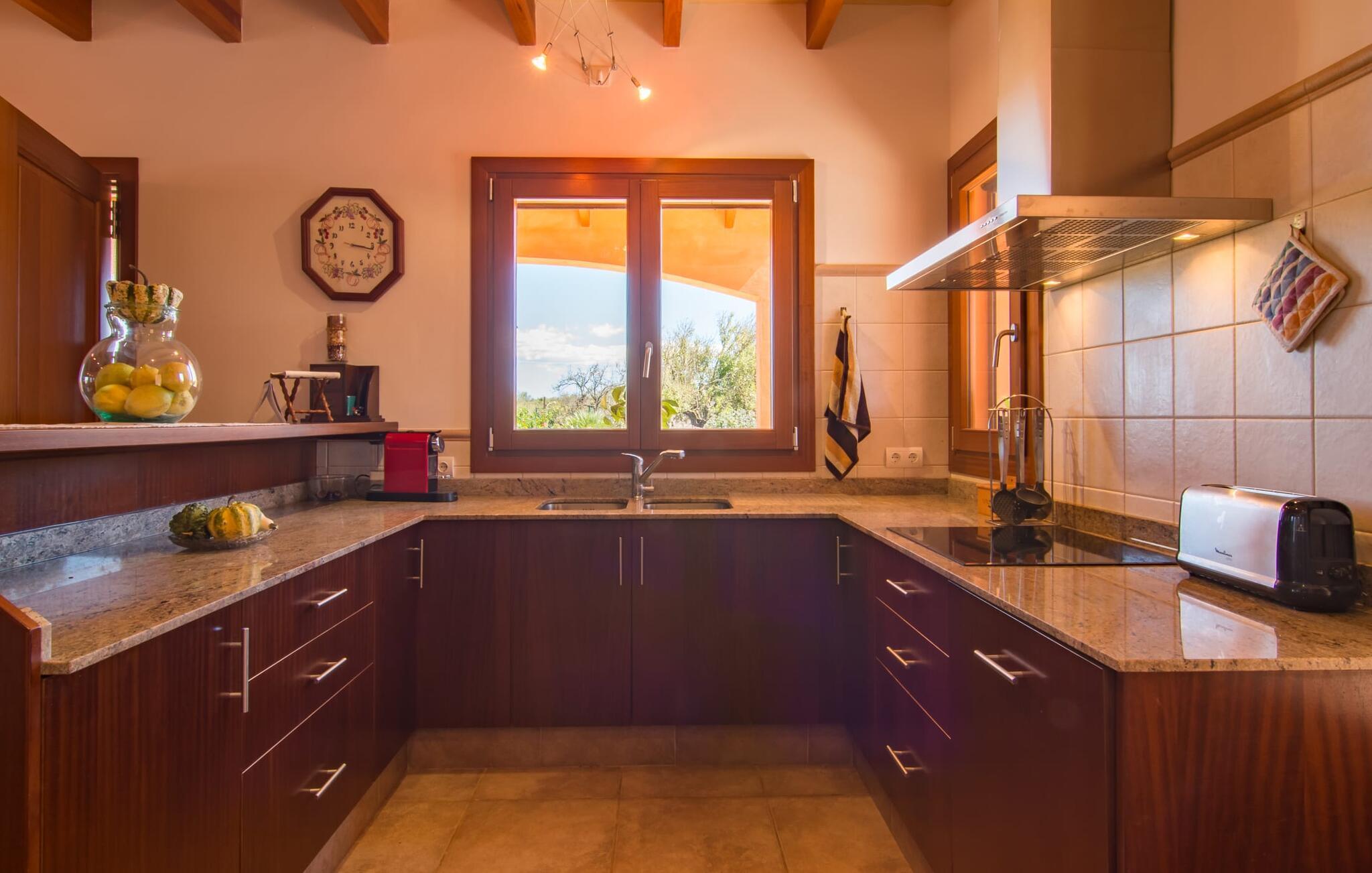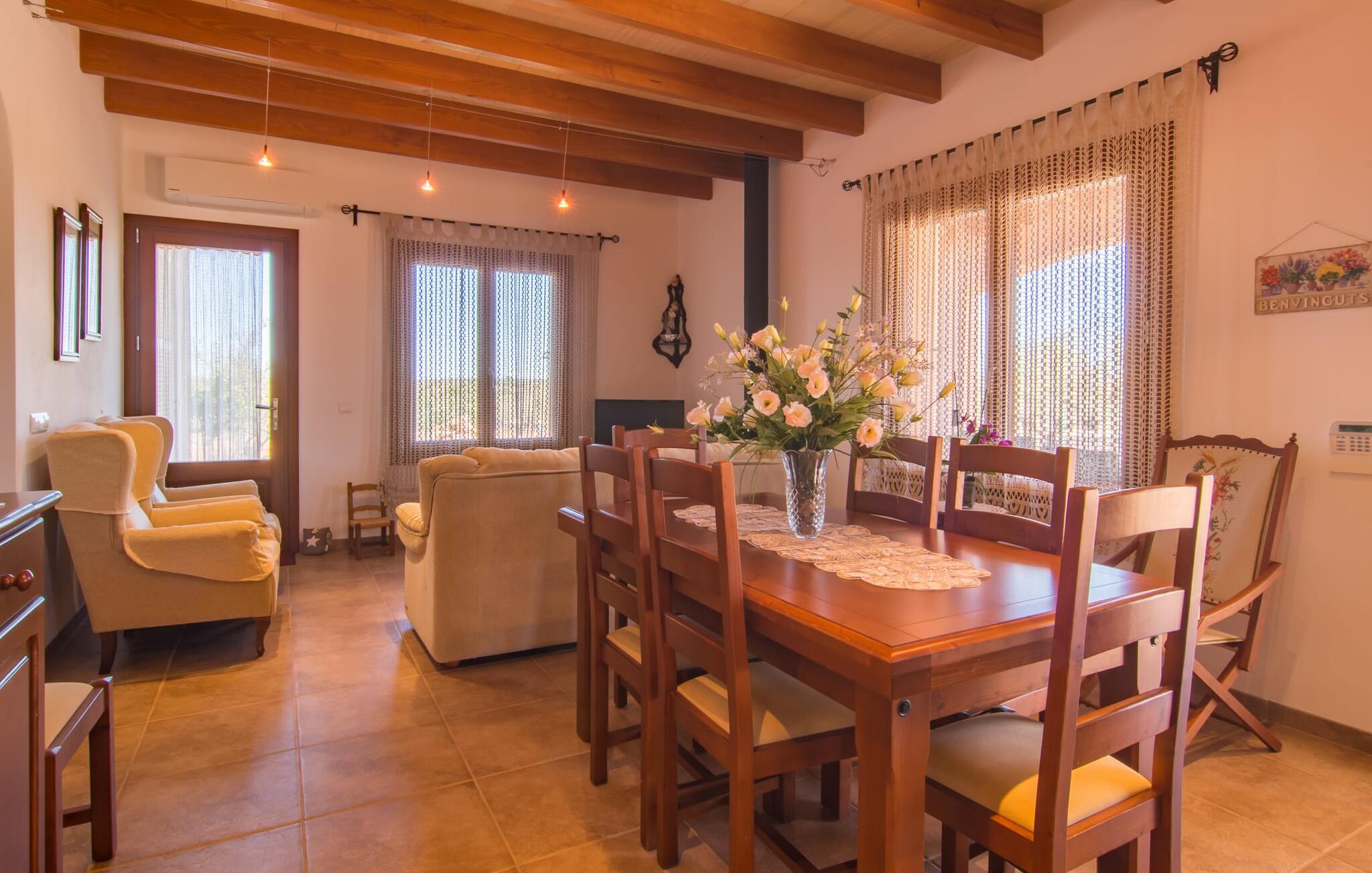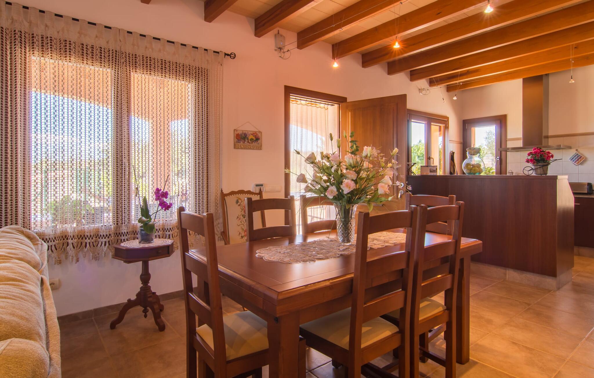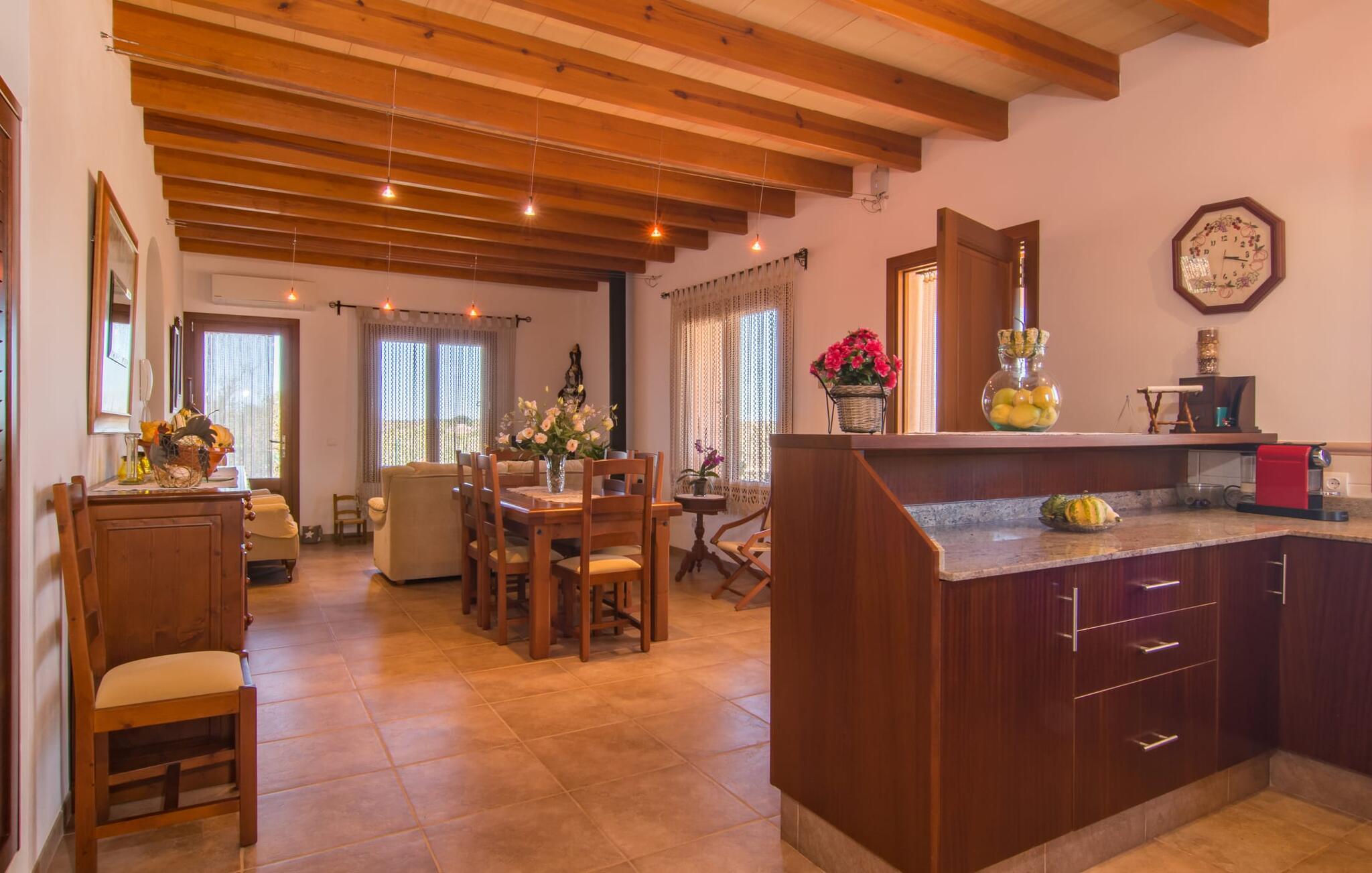 Nicht nur das Äußere lässt Sie rundum sorgenfrei zurück, auch das Innere des Hauses bietet nahezu alles, was das Herz begehrt. Die klassisch-mallorquinische Küche mit angrenzendem Wohn-/Essbereich bietet Platz für viele Dinge gleichzeitig. Während eine Person in der Küche ein leckeres Abendessen zaubert, kann eine andere dafür sorgen, dass sie kein wichtiges Spiel oder ihre Lieblingsserie im Fernsehen verpasst. Dank der ebenerdigen Bauweise der Villa sind die drei liebevoll eingerichteten Doppelzimmer nicht weit entfernt, die Ihnen jeweils ein Lächeln aufs Gesicht zaubern werden. Ruhige Nächte garantieren auch die Moskitonetze an den Fenstern, die vier tragbaren Ventilatoren und die Klimaanlage. Doch auch an kälteren Tagen erfüllt diese familienfreundliche Villa keine Wünsche und sorgt dank des Kamins für eine wunderbare Atmosphäre. Dies ist ein fantastischer Ort zum Entspannen und Erholen, perfekt für Familien mit Kindern.