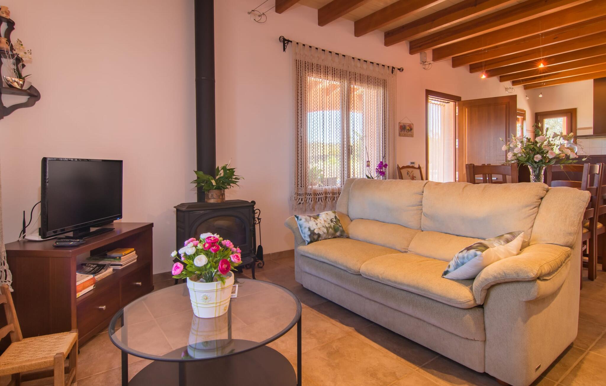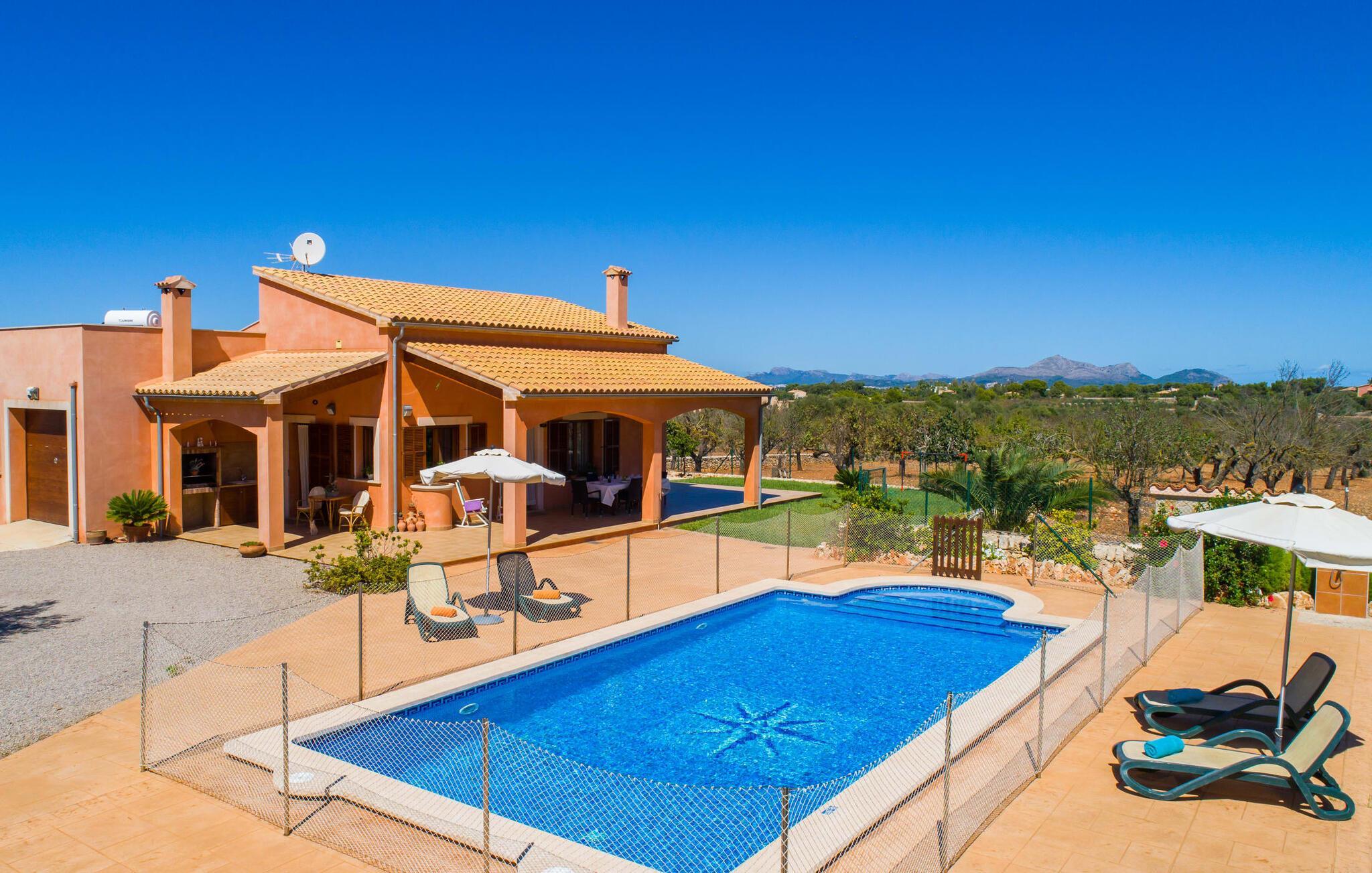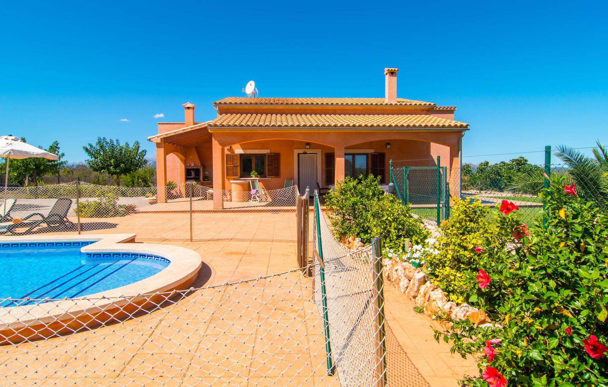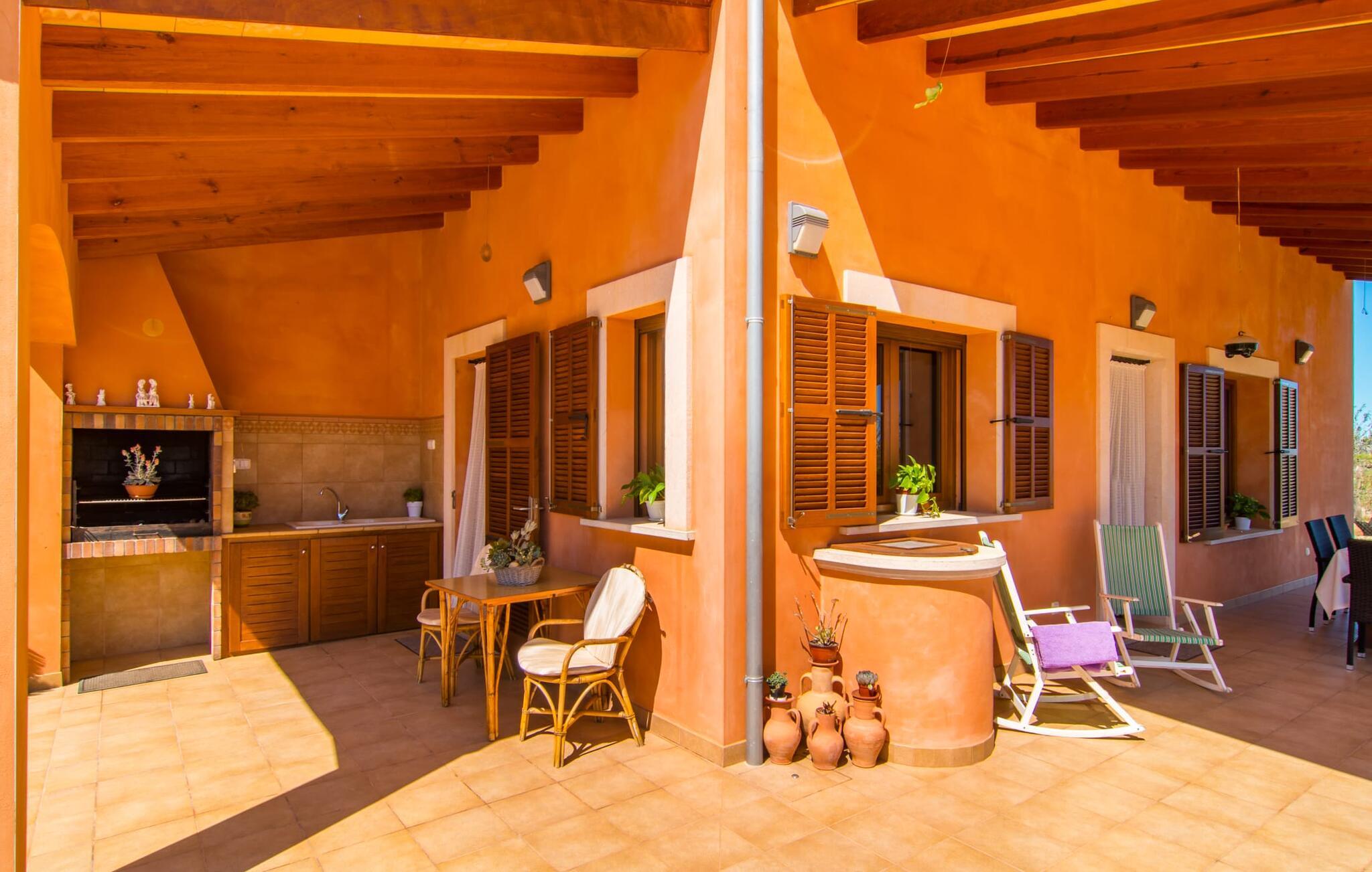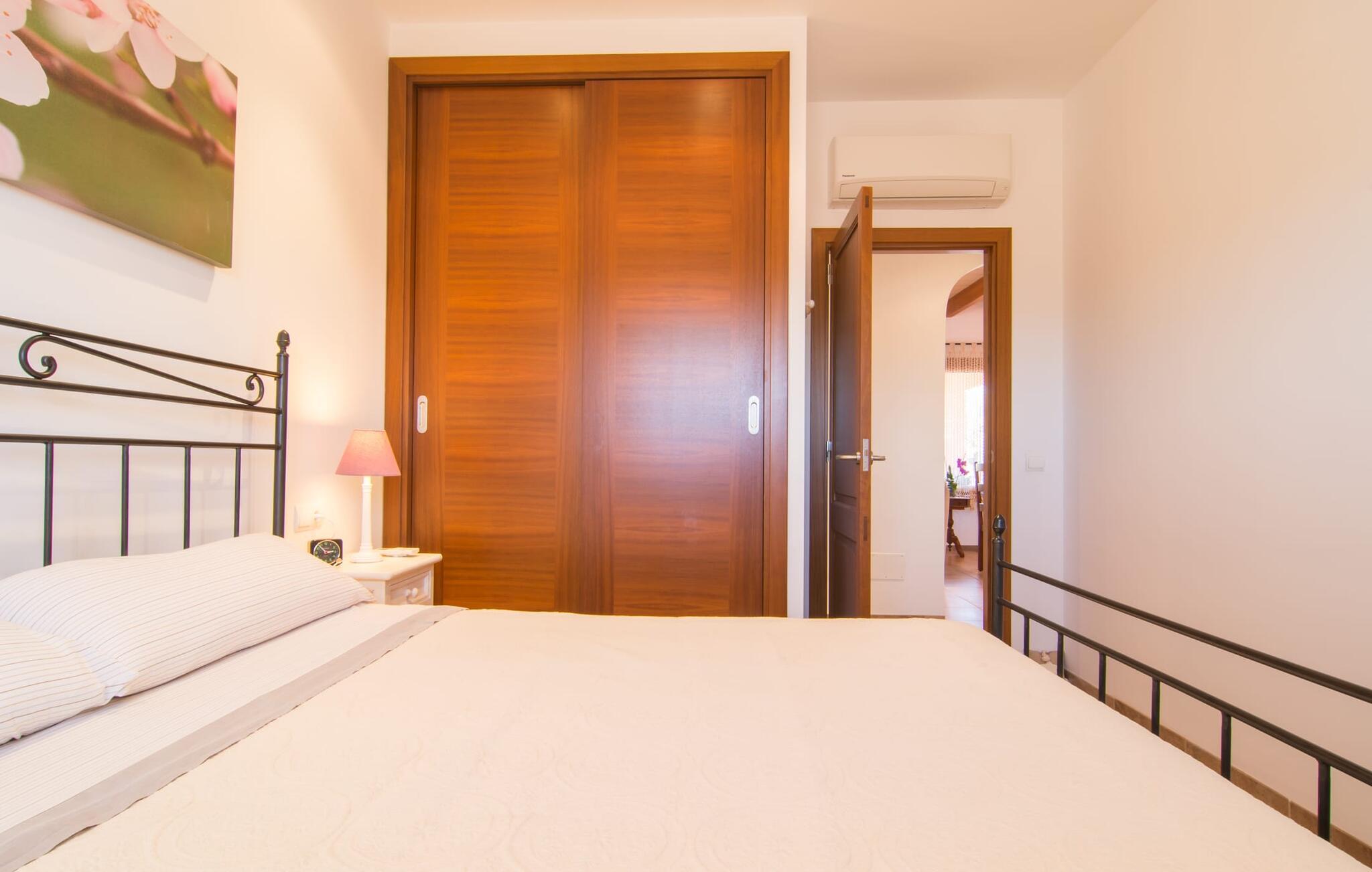 Nicht nur das Äußere lässt Sie rundum sorgenfrei zurück, auch das Innere des Hauses bietet nahezu alles, was das Herz begehrt. Die klassisch-mallorquinische Küche mit angrenzendem Wohn-/Essbereich bietet Platz für viele Dinge gleichzeitig. Während eine Person in der Küche ein leckeres Abendessen zaubert, kann eine andere dafür sorgen, dass sie kein wichtiges Spiel oder ihre Lieblingsserie im Fernsehen verpasst. Dank der ebenerdigen Bauweise der Villa sind die drei liebevoll eingerichteten Doppelzimmer nicht weit entfernt, die Ihnen jeweils ein Lächeln aufs Gesicht zaubern werden. Ruhige Nächte garantieren auch die Moskitonetze an den Fenstern, die vier tragbaren Ventilatoren und die Klimaanlage. Doch auch an kälteren Tagen erfüllt diese familienfreundliche Villa keine Wünsche und sorgt dank des Kamins für eine wunderbare Atmosphäre. Dies ist ein fantastischer Ort zum Entspannen und Erholen, perfekt für Familien mit Kindern.