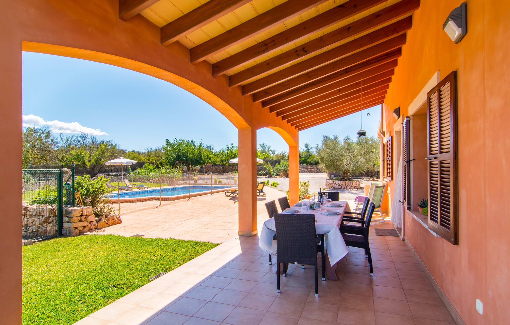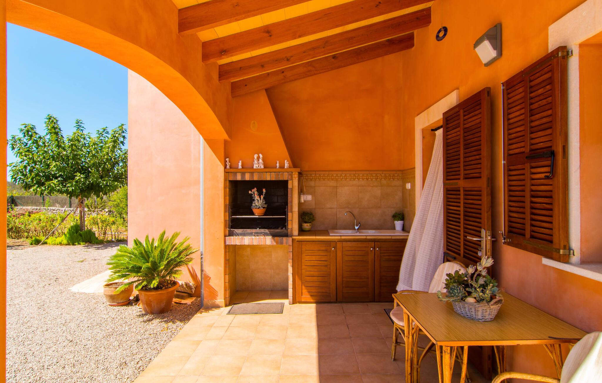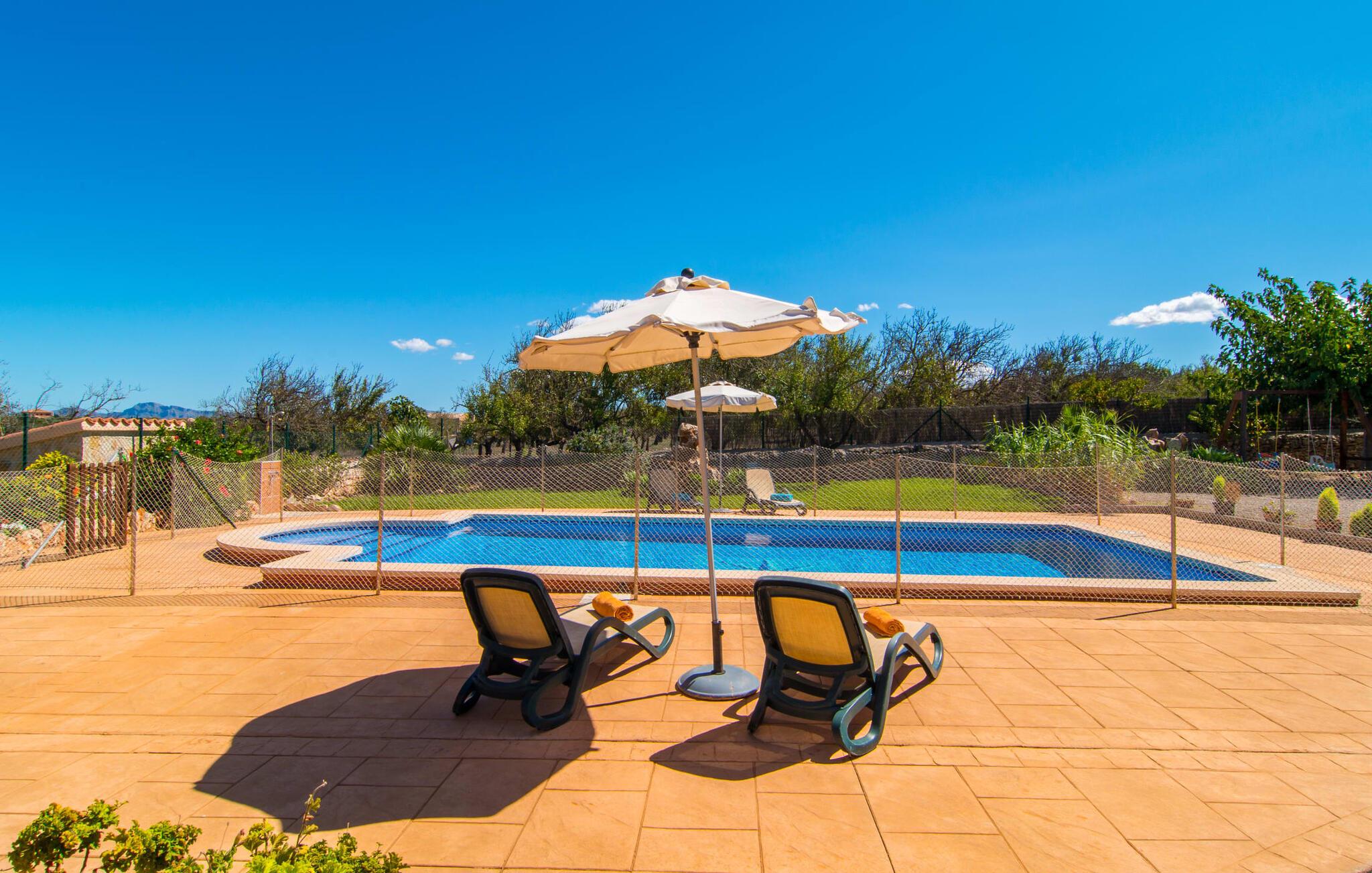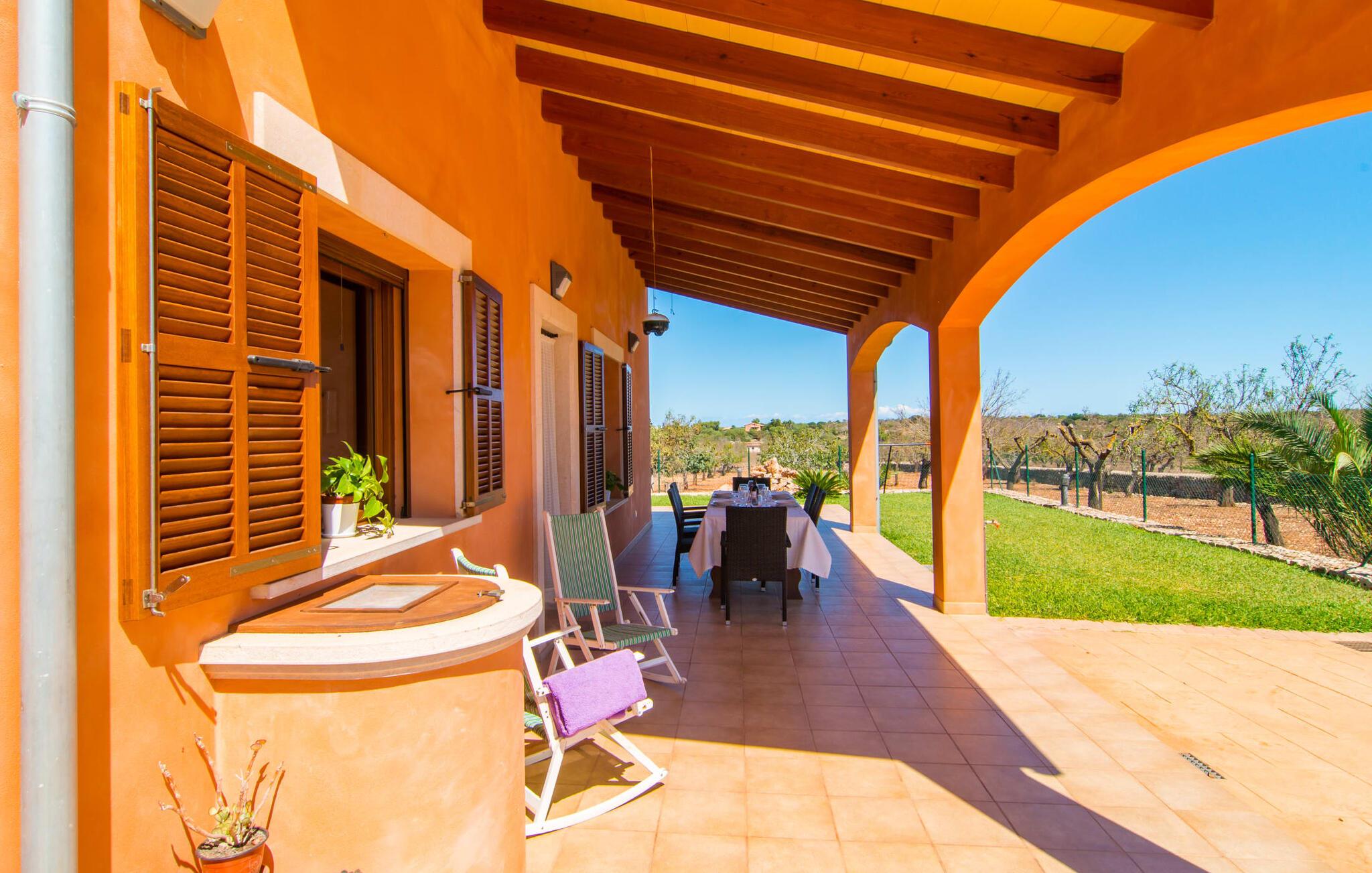 Nicht nur das Äußere lässt Sie rundum sorgenfrei zurück, auch das Innere des Hauses bietet nahezu alles, was das Herz begehrt. Die klassisch-mallorquinische Küche mit angrenzendem Wohn-/Essbereich bietet Platz für viele Dinge gleichzeitig. Während eine Person in der Küche ein leckeres Abendessen zaubert, kann eine andere dafür sorgen, dass sie kein wichtiges Spiel oder ihre Lieblingsserie im Fernsehen verpasst. Dank der ebenerdigen Bauweise der Villa sind die drei liebevoll eingerichteten Doppelzimmer nicht weit entfernt, die Ihnen jeweils ein Lächeln aufs Gesicht zaubern werden. Ruhige Nächte garantieren auch die Moskitonetze an den Fenstern, die vier tragbaren Ventilatoren und die Klimaanlage. Doch auch an kälteren Tagen erfüllt diese familienfreundliche Villa keine Wünsche und sorgt dank des Kamins für eine wunderbare Atmosphäre. Dies ist ein fantastischer Ort zum Entspannen und Erholen, perfekt für Familien mit Kindern.