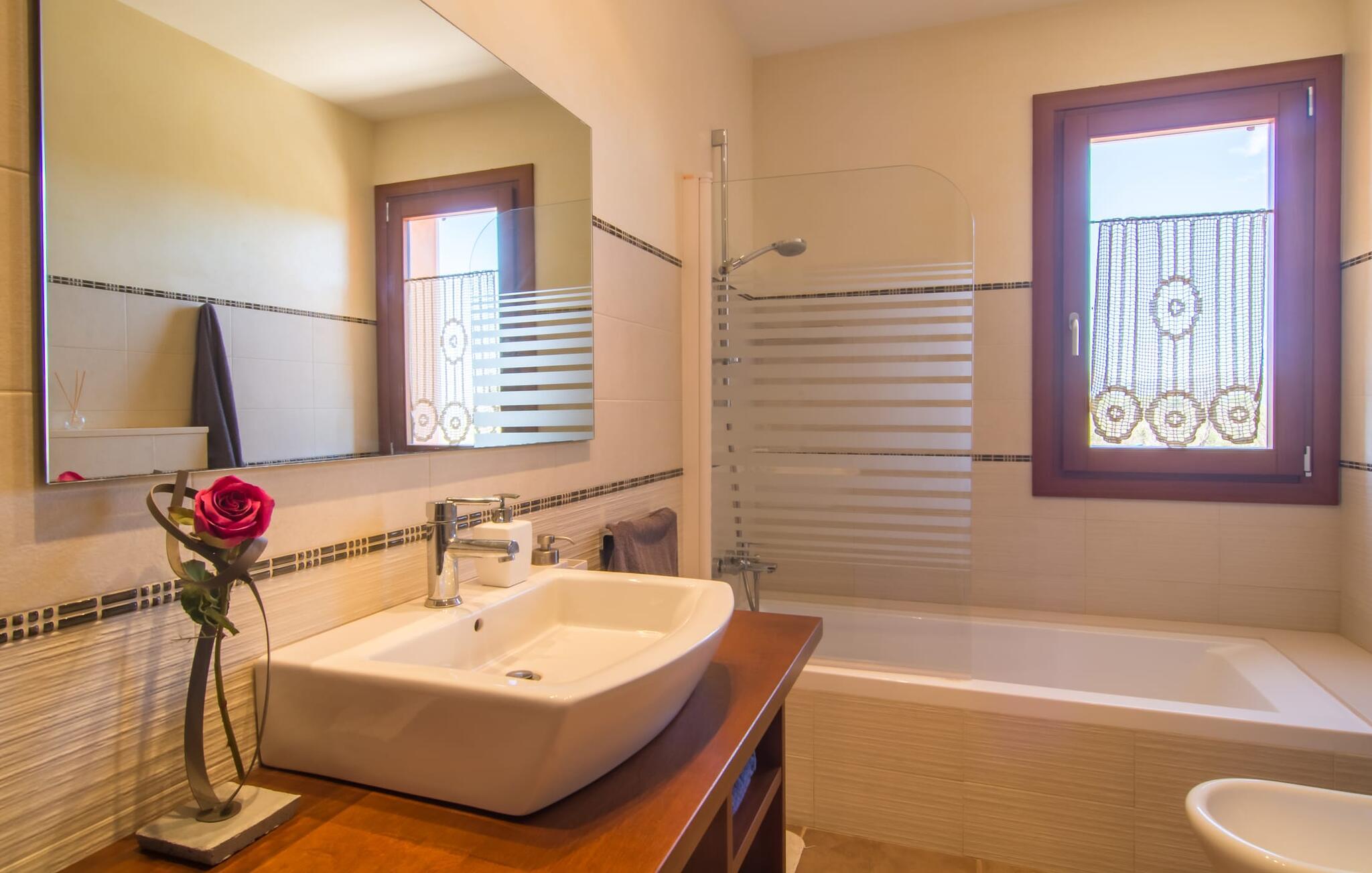 Von der Dachterrasse aus auf die grüne Landschaft im Norden Mallorcas blicken und einfach nur die atemberaubende Aussicht genießen – so könnte man seine kostbare Zeit im Urlaub in der charmanten Villa „Ca Na Poveta“ verbringen. Es ist überhaupt nicht einsehbar und bietet absolute Privatsphäre, da der nächste Nachbar 160 m entfernt ist. Das weitläufige und kinderfreundliche Gelände lädt die Kleinen zum Austoben ein. Es gibt nicht nur einen schönen, gepflegten Garten mit Spielwiese, sondern auch eine Schaukel und eine Kinderrutsche. Wer sich danach abkühlen möchte, ist herzlich eingeladen, ein paar Bahnen im abgeteilten Pool mit abgestuftem Boden zu schwimmen. Für ein anschließendes Sonnenbad im Schatten stehen Ihnen außerdem einige bequeme Liegestühle und Sonnenschirme zur Verfügung. Sollten die südlichen Temperaturen doch einmal etwas zu warm werden, bietet die überdachte Terrasse an der Vorderseite der Villa einen Zufluchtsort vor der Hitze. Außerdem verfügt es über eine kleine, stilvolle Außenküche mit festem Grill, ideal für ein gemeinsames Festmahl zum Ausklingen des Abends. Darüber hinaus können Sie in der sandsteinfarbenen Villa Ihren Mietwagen direkt vor der Tür oder in der Garage abstellen, die einen direkten Zugang zum geräumigen und gut ausgestatteten Innenbereich der Immobilie bietet.