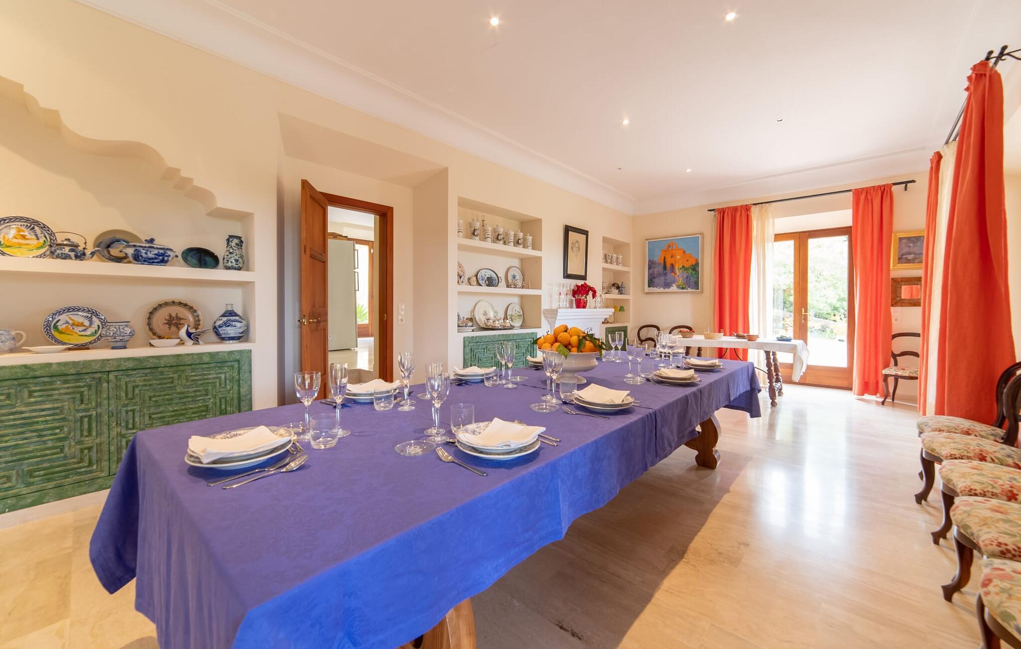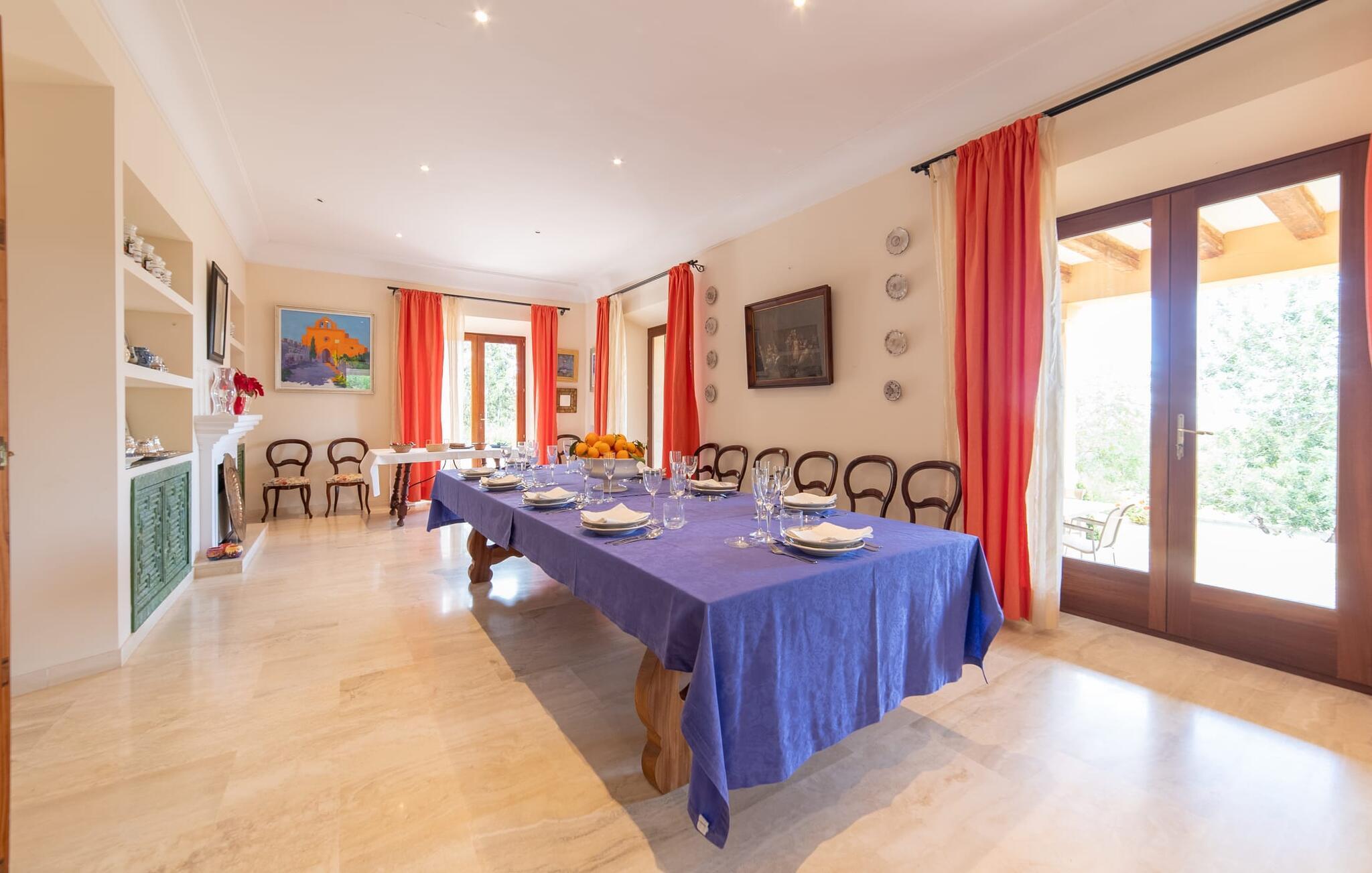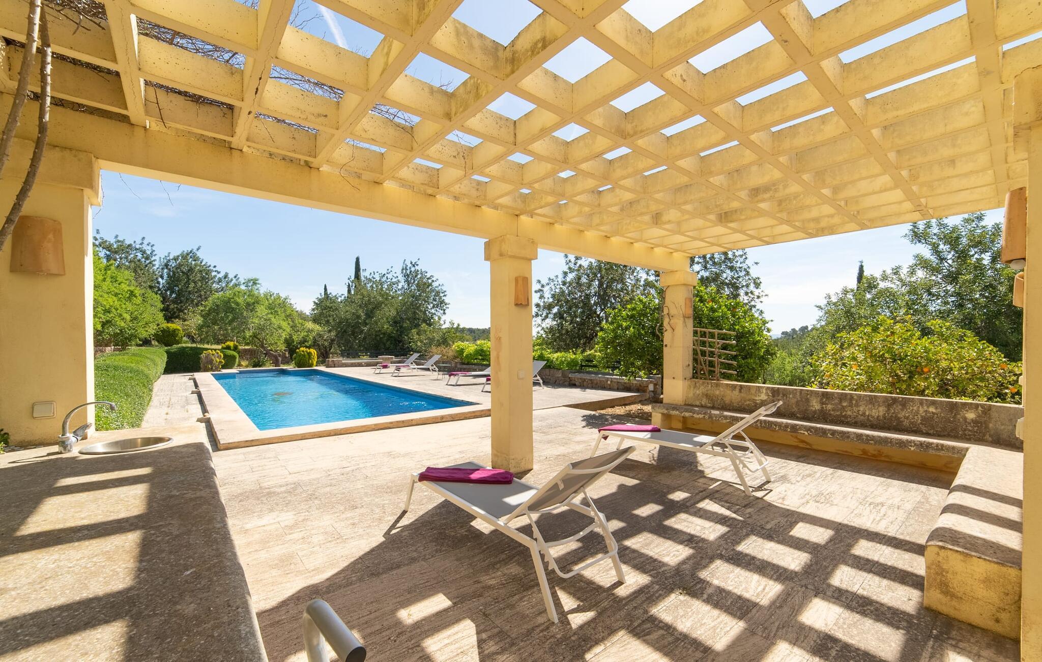 Dieses bezaubernde Ferienhaus auf Mallorca ist ein idealer Ort für Familien, gemeinsam reisende Paare oder Freunde, die ein paar Tage Abgeschiedenheit und Ruhe auf dem Land genießen möchten. Auf dem riesigen Gelände gibt es jede Menge Platz, um das alles in vollen Zügen genießen zu können. Mediterrane Vegetation, kleine Wege, Nischen und Mauern laden dazu ein, immer wieder nach neuen Orten zum Verweilen zu suchen. Für die Kleinen gibt es auch eine Schaukel. Auch am Pool können Sie angenehme Stunden genießen. Es ist nicht nur groß, sondern auch flach und verfügt über leicht zugängliche Stufen. Auf der Sonnenterrasse laden neben bequemen Liegen auch gemauerte Bänke zum Entspannen ein. Auf der überdachten, mit Flusskieseln bedeckten Terrasse direkt am Haus können Sie am Esstisch oder auch in der gemütlichen Lounge zusammensitzen. Aufgrund der natürlichen Lage kann es zu Ziegen in der Nähe kommen. Um zu verhindern, dass sie das Grundstück betreten, gibt es einen Wachhund, der in einem umzäunten Bereich an der Leine läuft.