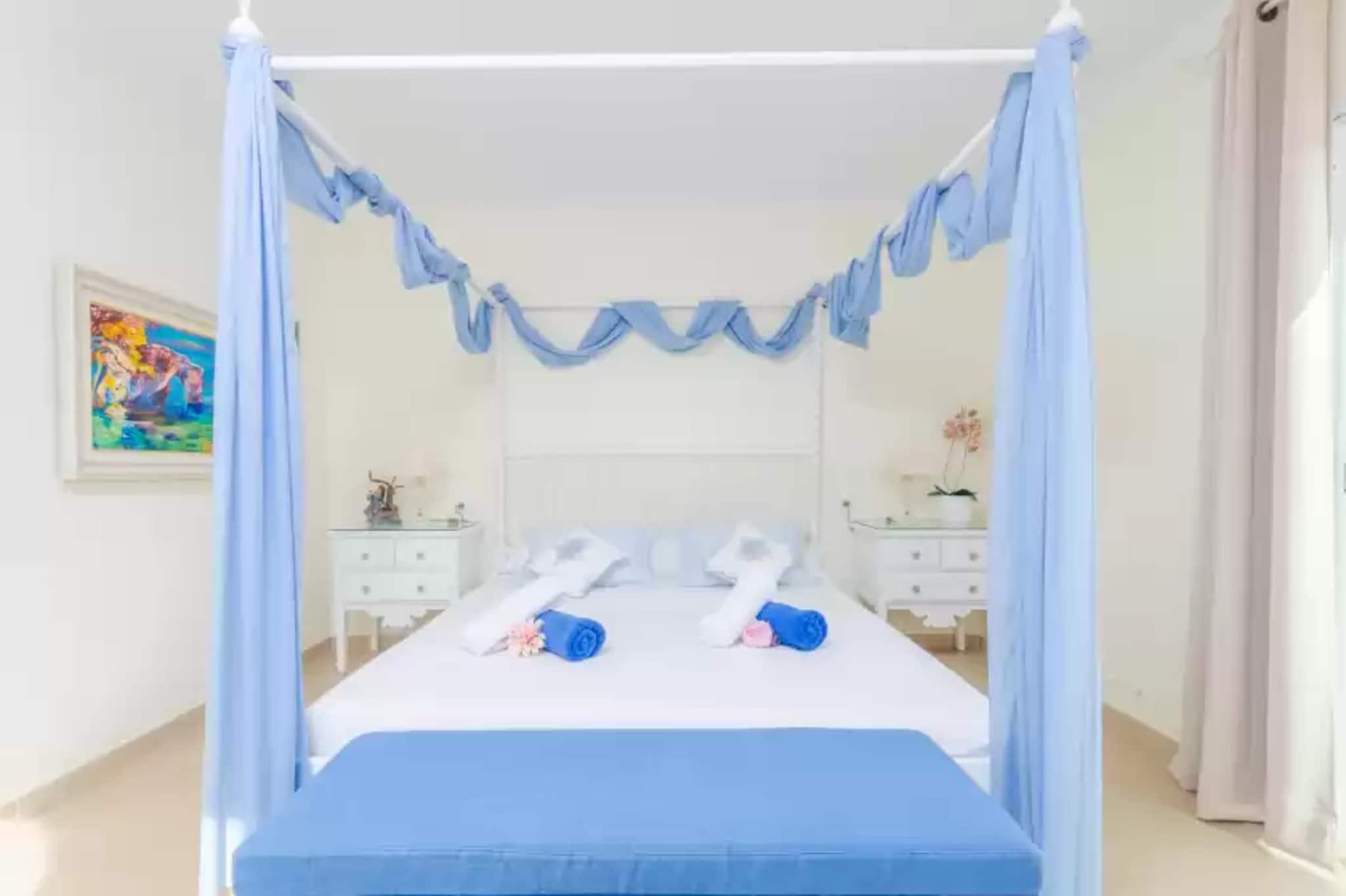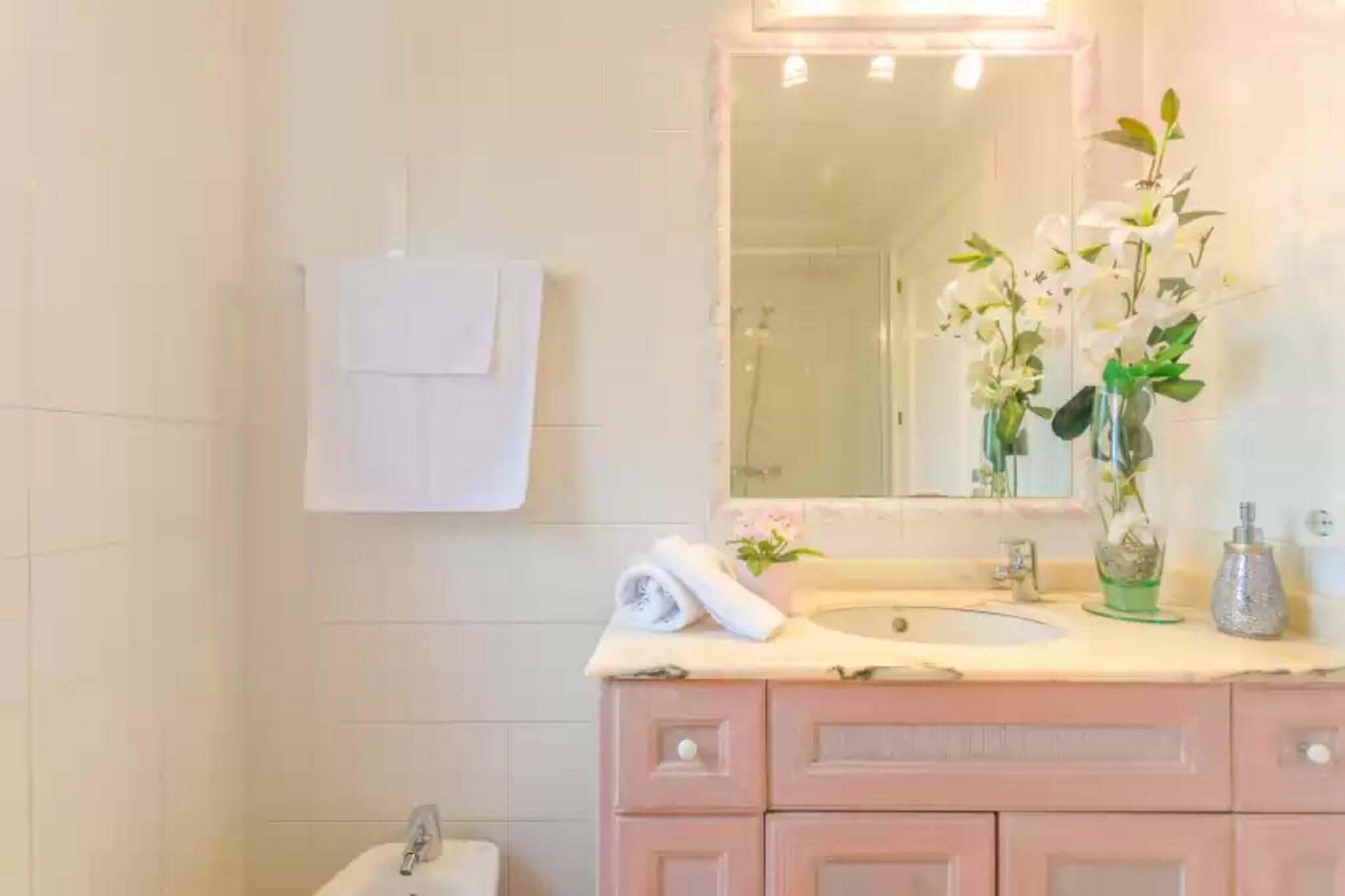 Living room, dining room, Kitchen(cooker, coffee machine, oven), bedroom(2x single bed), bedroom(double bed), bedroom(double bed), bathroom, bathroom, bathroom, microwave, dishwasher, fridge, freezer, bath tub, bath tub, shower, shower, washbasin, washbasin, washbasin, toilet, toilet, toilet, bidet, air conditioning, air conditioning, air conditioning, garden, garden furniture, 6x sun loungers, BBQ, swimming pool, children's bed, high chair