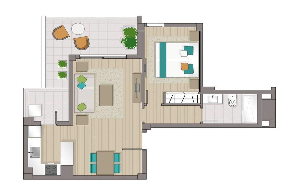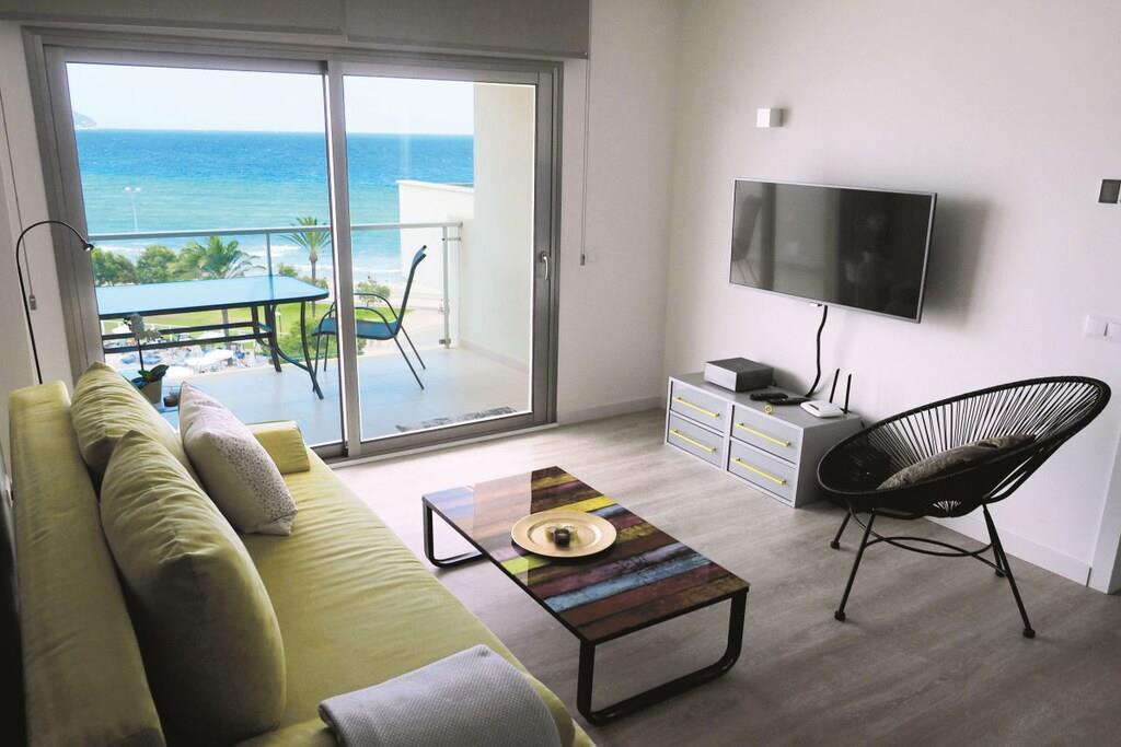 Live like with friends! Individually designed beach apartment on the 6th floor with majestic view of the sea primarily. The 64 m² apartment on the 6th floor (elevator available) with sea view from all windows offers a bedroom, bathroom with shower, a large living/dining/kitchen area and a storage room. The 11m², covered balcony looks to the east towards the Bay of Cala Millor, but also releases the view of the mountains in the west in the back. With great attention to detail, the bright apartment stylish is set up according to the motto 'Modern Purism meets Belle Époque'. The double bed in the bedroom is 180 x 200 cm (separate mattresses) and the living room couch is extendable (approx. 150 x 200 cm) - the apartment offers space for 3 people. The apartment also offers books (German, English), games, stereo, astra satellite receiver, flat-screen TV and free WiFi
