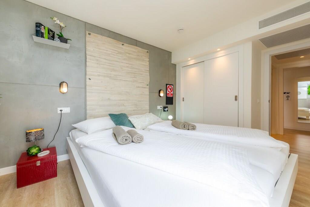Live like with friends! Individual beach holiday apartment in the Loft style in the first sea line with an unrestricted panoramic view of the whole bay. The 81 m² apartment on the 2nd floor (elevator) offers 2 bedrooms, bathroom with shower, a large living/dining/kitchen area, a storage room and a 11m², covered balcony with a view of the entire bay in the forefront Sea. You can also see the beach, palm trees and the Punta de N'amer nature park from every window. The bright apartment is designed according to the motto 'Vintage Industrial meets Music', real wood, leather and metal dominate. Both bedrooms offer a 180 x 200 cm double bed (separate spring mattresses) and the living room couch is pull -out (150 x 200 cm) - the apartment offers space for 5 people. The apartment also offers books (German, English), DVDs, games, stereo system with CD/Radio/USB, Astra satellite receiver, swiveling on the wall mounted LED TV