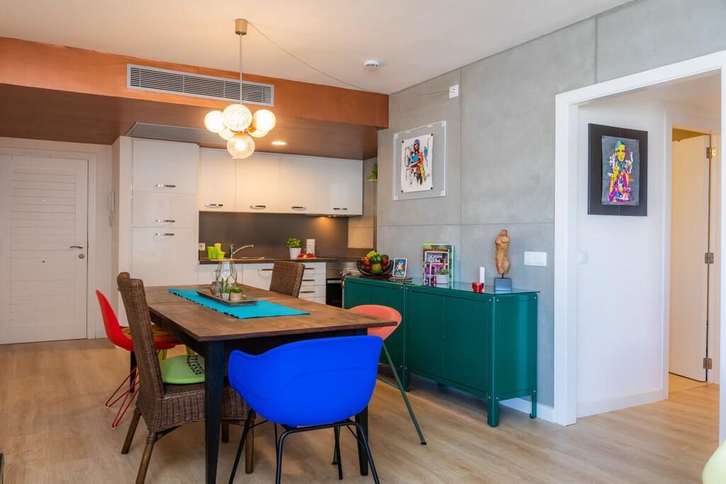 Live like with friends! Loft-style beach holiday apartment on the 6th floor with a majestic view of the sea primarily. Second, windy western balcony. The 84 m² apartment on the 6th floor (elevator) has 2 bedrooms, bathroom with shower, a large living/dining/kitchen area, a storage room and 2 balconies. The 11 m², covered balcony, which connects to the living area, looks east to the Bay of Cala Millor, but also captures the evening sun in the back. The 4 m², sunny and wind -protected western balcony, which connects to a bedroom, looks at the mountains. The bright apartment is stylish and creative and with great attention to detail according to the motto 'Heavy Metal meets Funky Colors'. Both bedrooms offer a 180 x 200cm double bed (separate spring mattresses) and the living room couch is pull -out (approx. 150 x 200 cm) - the apartment offers space for 5 people. The apartment also offers B