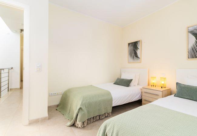 On the upper floor, you will find three additional bedrooms. Two of them are each equipped with two single beds (0.90 × 2.00 m) and share a bathroom with a bathtub. One of these rooms also has direct access to the balcony. The master bedroom is equipped with a spacious double bed (1.80 × 2.00 m), its own bathroom with a shower, a comfortable walk-in wardrobe with plenty of storage space, and access to a balcony shared with another bedroom. Additionally, on this floor, there is another bathroom with a bathtub available, which is shared by the two bedrooms with single beds. All bedrooms are equipped with air conditioning and electric radiators. Moreover, the bathrooms and living area also have radiators, ensuring a pleasant living climate throughout the year.