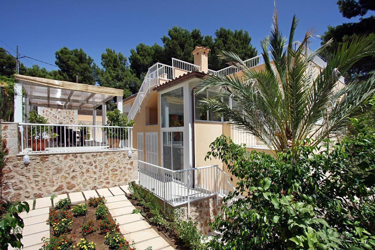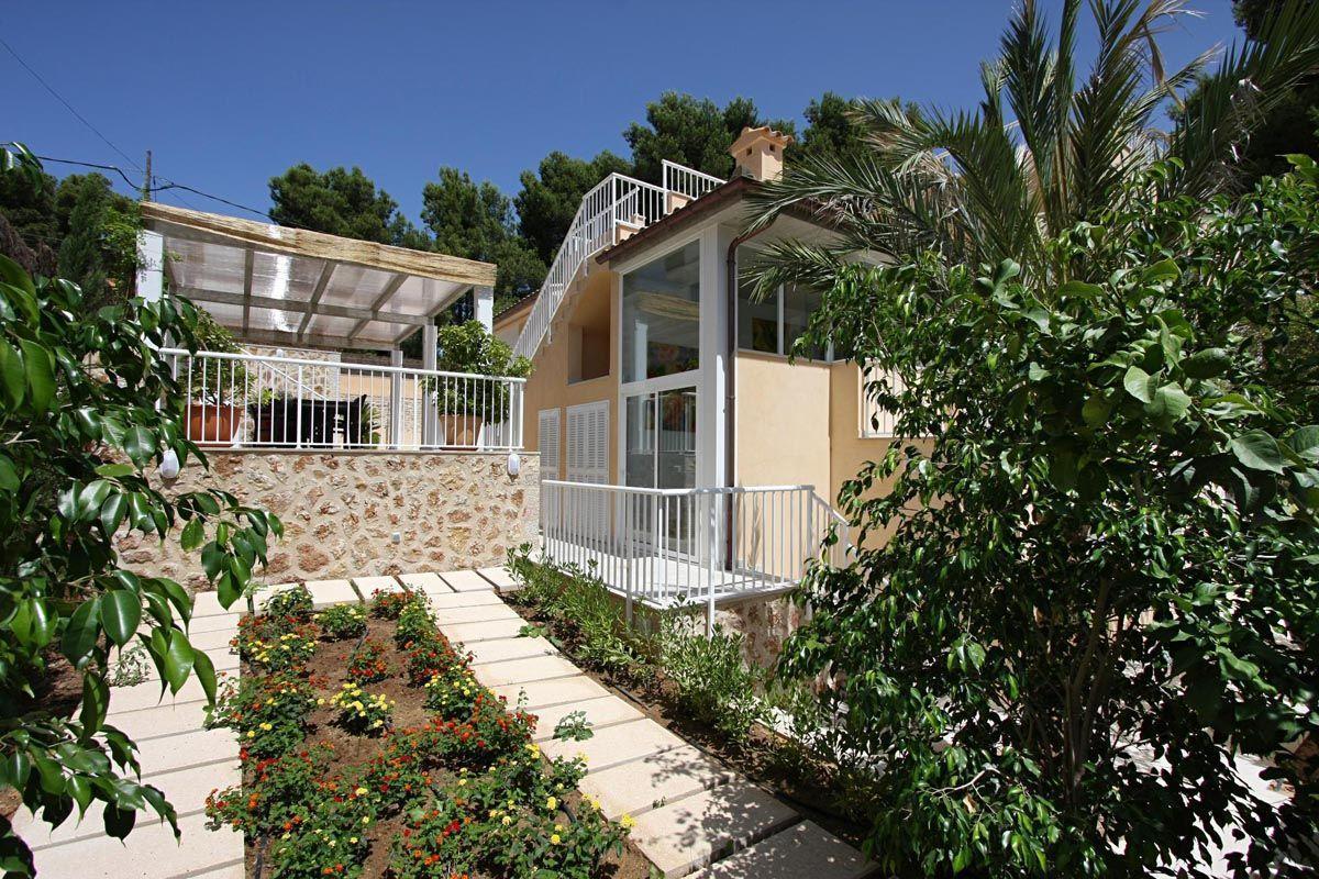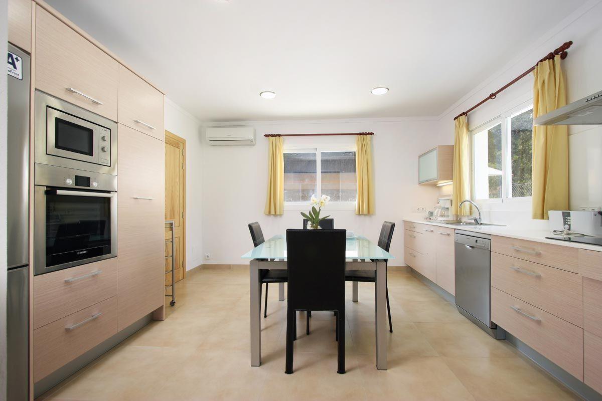 The property is nicely decorated and furnished. Stairs from the street give access to the property. The main entrance is under a small covered terrace and leads directly into a small hall which serves as a hallway. To the left of the hall are the dining room, the living room and the kitchen. The living room is certainly spacious and stands out for its large windows, which give it a great luminosity and beautiful views that reach as far as the sea. It is fully furnished with three sofas, plasma TV, satellite, DVD and air conditioning. The dining room is also spacious and bright. It has a beautiful dark wooden table and white leather chairs. The kitchen is modern and comfortable. It is fully equipped with ceramic hob, electric oven, extractor hood, microwave, dishwasher, fridge/freezer and even air conditioning. The kitchen also has an exit to the outside which leads directly to the pool area and terraces. To the right of the hallway are the four bedrooms as well as a guest toilet. Two of these bedrooms (one double and one twin) are located on the ground floor of the house. The other two bedrooms are also one double and one twin. Each of the four bedrooms has an en suite bathroom (one of them with a bathtub and the other three with a shower). It is worth noting that all the bedrooms have fitted wardrobes and air conditioning/heat pump, making Casa Medina an ideal choice for both the hotter summer months and the cooler autumn and spring months.