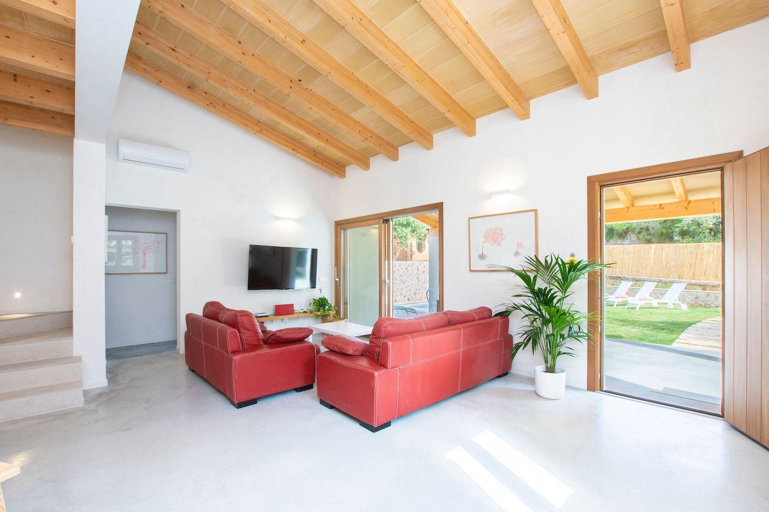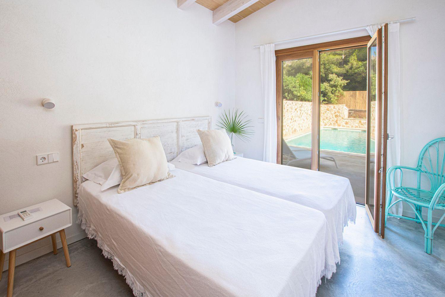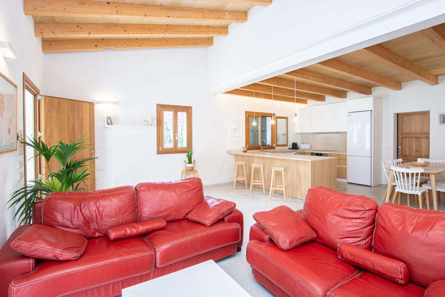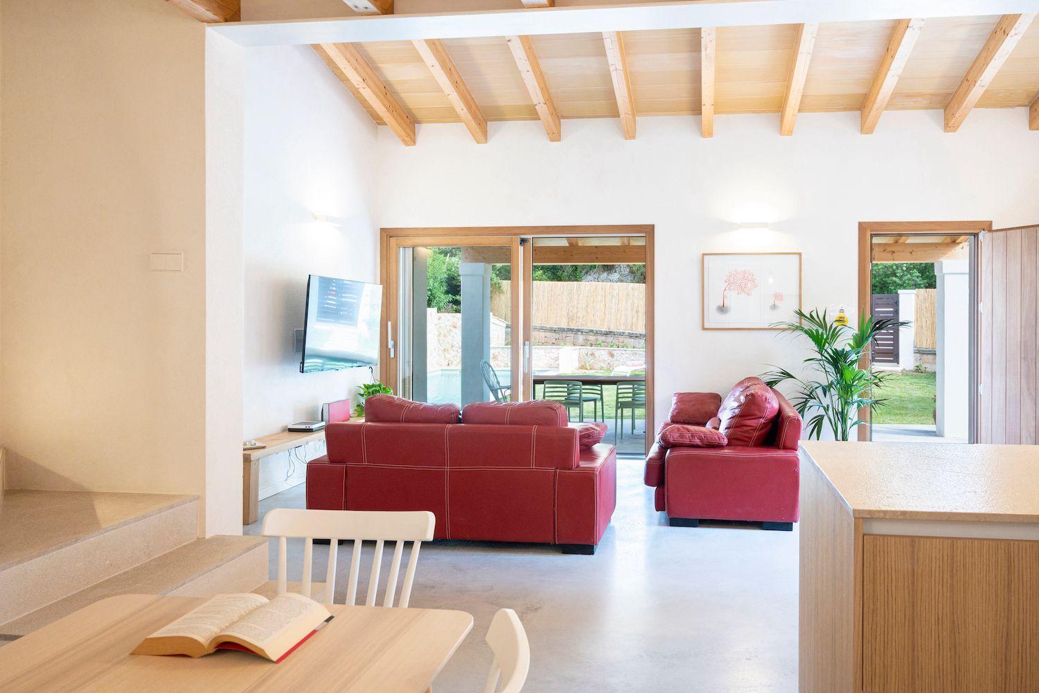 The house was renovated and completed in June 2022 using high quality materials and in compliance with new energy and environmental regulations. The interior is spacious and bright, with modern furnishings. All bedrooms are located on the ground floor (please note that there is a locked and inaccessible storage room on the upper floor). The living-dining room has a cosy sitting area with Smart TV and hot and cold air conditioning for pleasant evenings during the autumn or spring holidays or the hottest days of summer. The modern kitchen is equipped with appliances such as dishwasher and oven. There are three nice bedrooms, two bedrooms with single beds and another bedroom with a double bed and a bathroom en suite. There is another bathroom with shower. This is a perfect option for families who want to have their own private villa and pool but also have the beautiful bay of Cala Molins nearby, why not have it all?