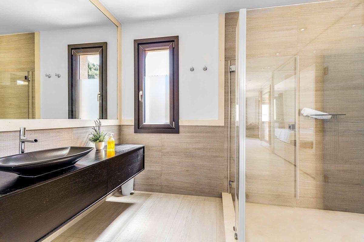 On the upper floor of the house there is an outdoor terrace with equally fabulous views, as well as two spacious and very modern bedrooms with fitted wardrobes and huge mirrored doors. One of the bedrooms has a double bed, while the other has twin beds. Each has an en-suite bathroom.
