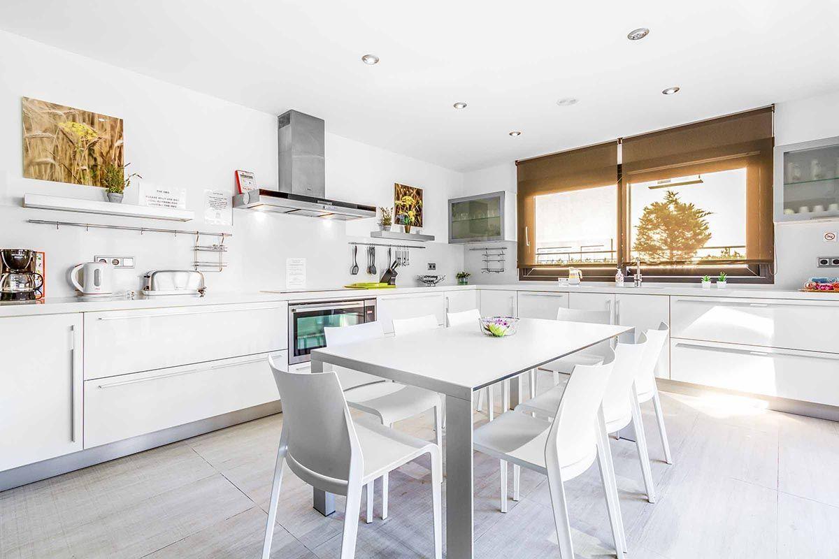 Next to the main entrance is a double bedroom with en-suite bathroom and direct access to the terraces. Separately, there is a modern and spacious kitchen, also with access to the terrace and pool area through sliding doors. The kitchen is fully equipped, including a double fridge-freezer, and a comfortable table with seating for 6 people.