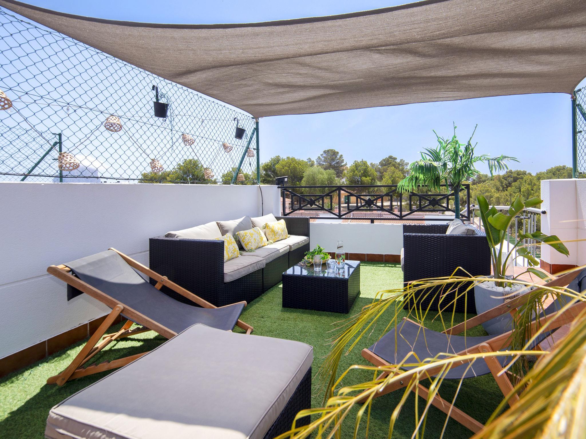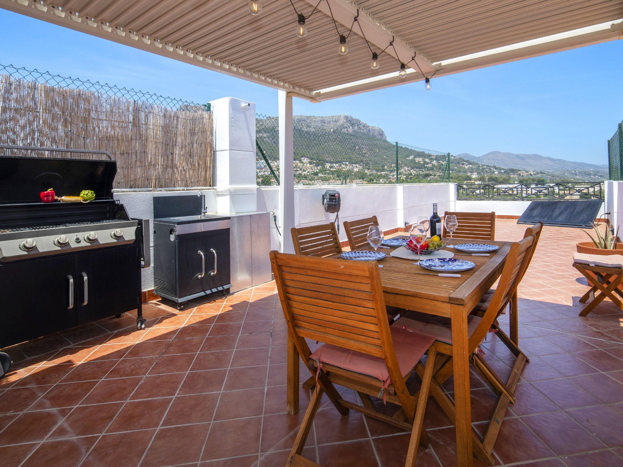 "Calpe Bay 3", 3-room apartment 85 m2 on 4th floor. Spacious and bright, comfortable furnishings: living/dining room with digital TV, international TV channels, air conditioning and forced-air heating. Exit to the balcony. 1 room with 1 french bed (160 cm, length 200 cm), bath/WC, air conditioning and forced-air heating. 1 room with 2 beds (80 cm, length 190 cm), air conditioning and forced-air heating. Open kitchen (4 ceramic glass hob hotplates, toaster, kettle, microwave, freezer, electric coffee machine). Shower/WC. Upper floor: (spiral staircase) pergola with dining nook. Exit to the terrace, pergola. Small terrace. Terrace furniture (portable). Distant view of the resort and the ocean. Facilities: washing machine, iron, hair dryer. Internet (WiFi, free). Parking space n Planta -1. N 78 (roofed, 1 car). VT-499900-A // Reg. Nr.: ESFCTU00000302900073388300000000000000000VT-499900-A2