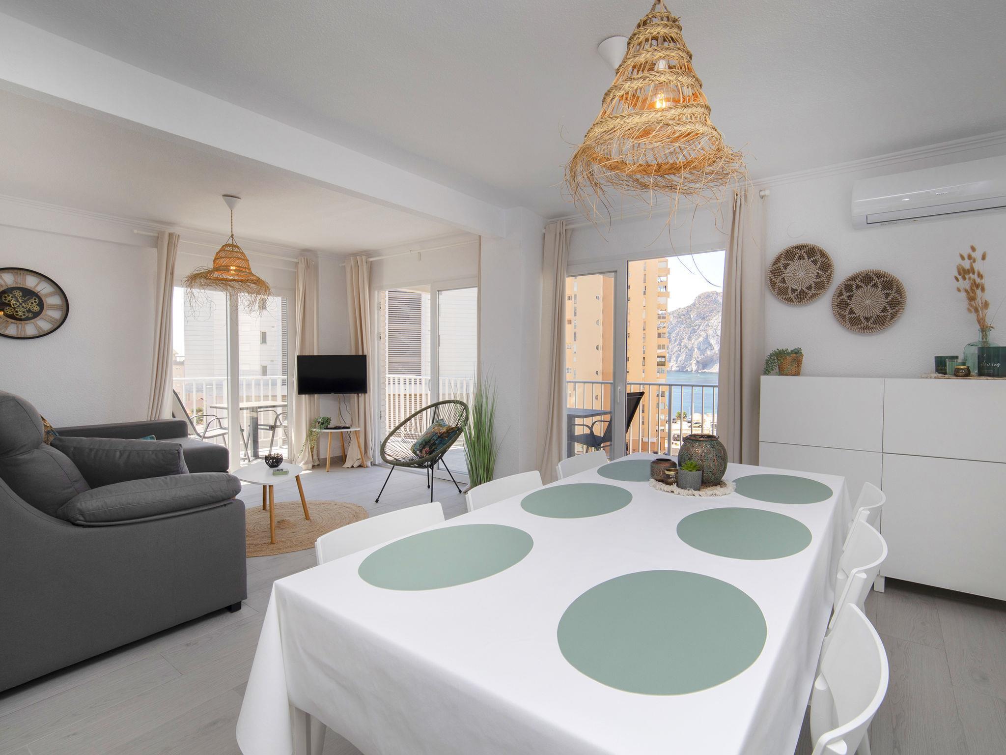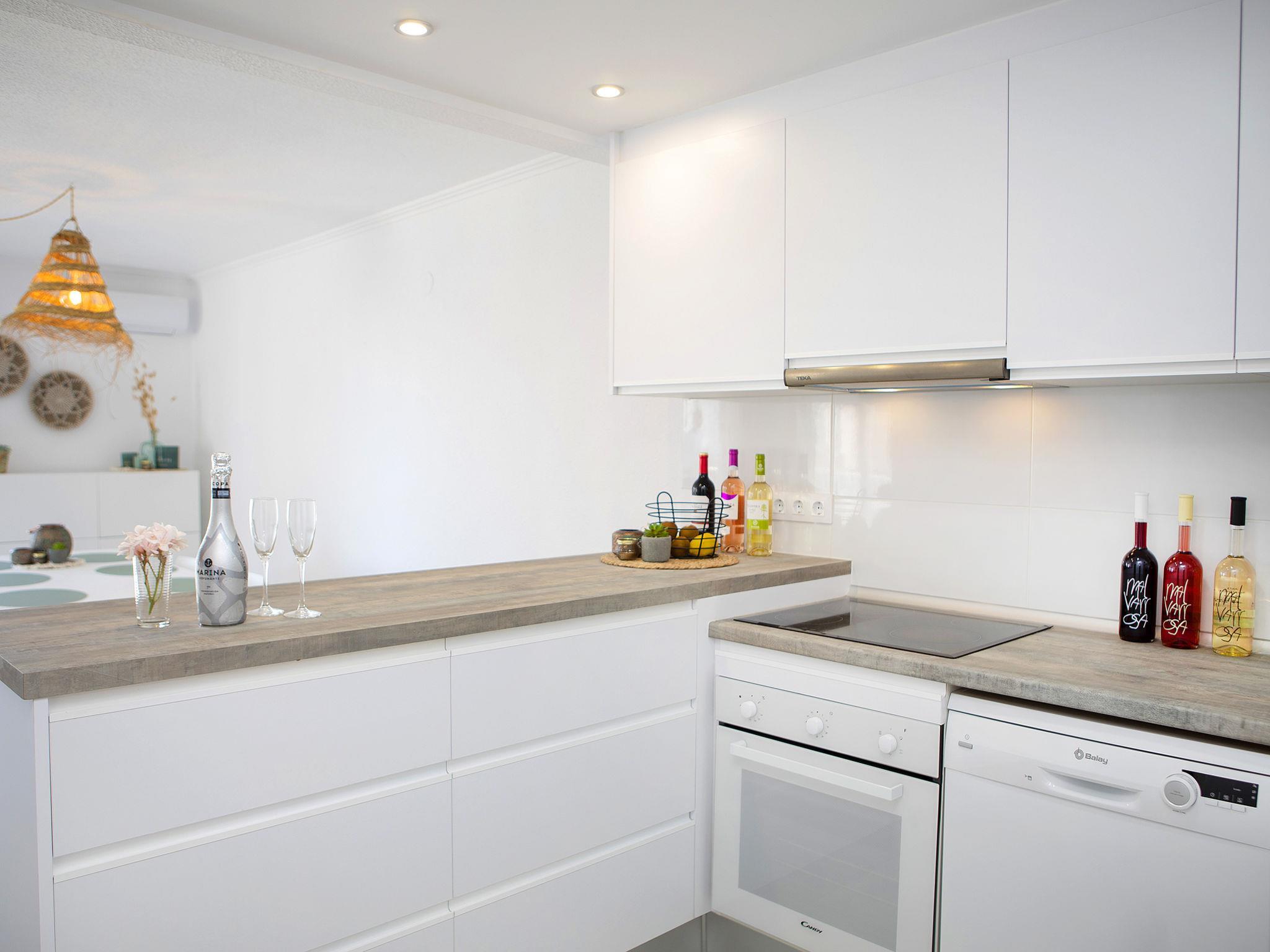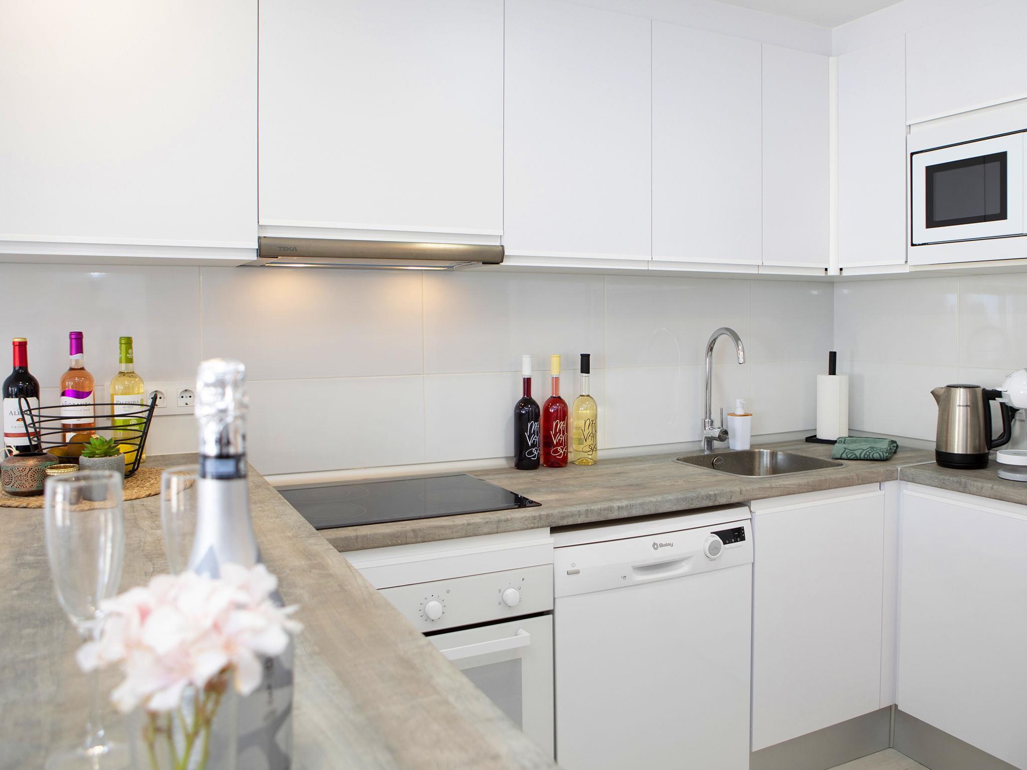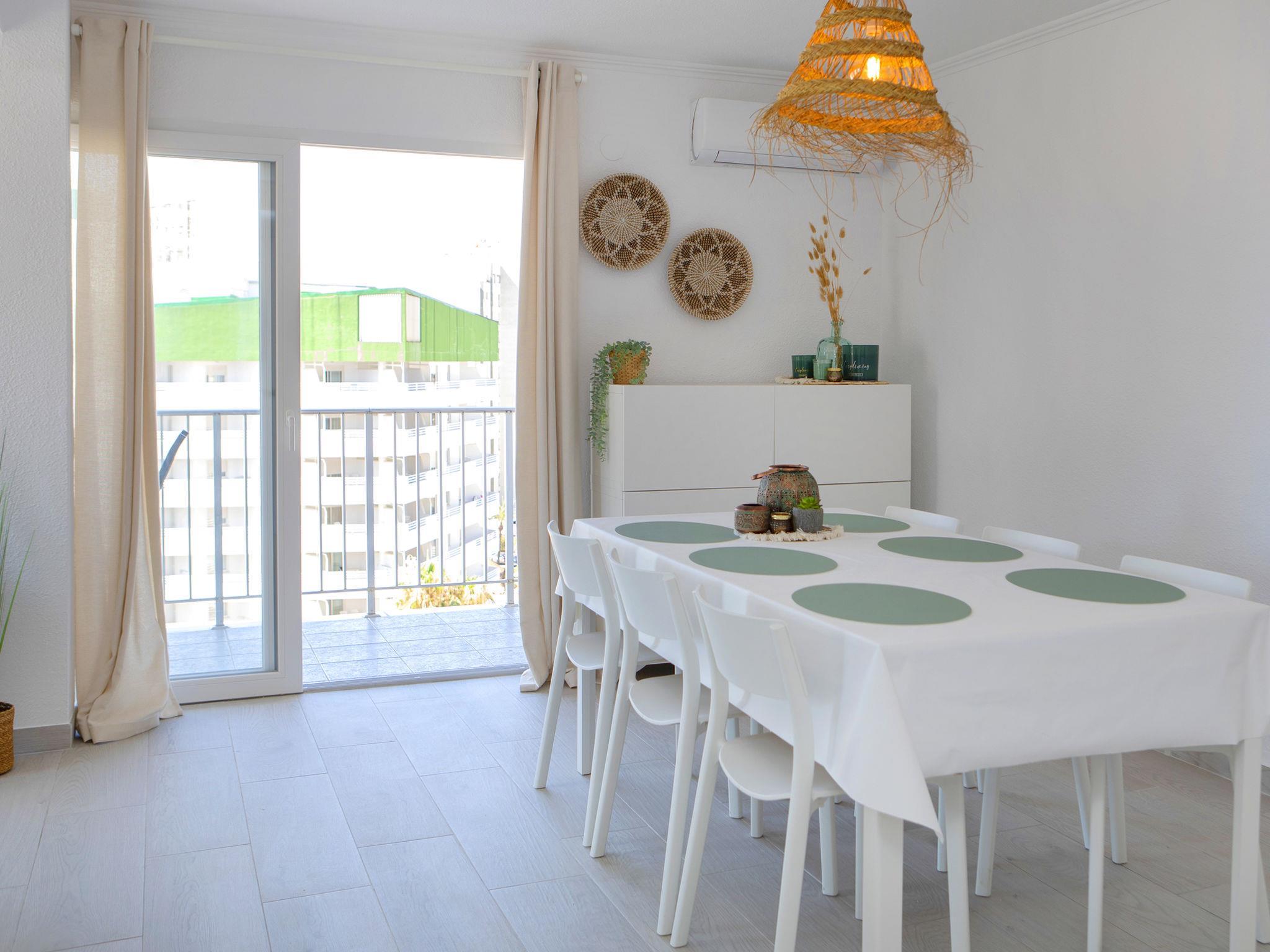 "Miramar 03", 3-room apartment on 8th floor. Spacious and bright, fully renovated in 2022, beautiful and modern furnishings: living/dining room with satellite TV, digital TV, air conditioning and forced-air heating. Exit to the terrace. 2 rooms, each room with 1 french bed (1 x 150 cm, length 190 cm). Open kitchen (oven, dishwasher, 4 ceramic glass hob hotplates, toaster, kettle, microwave, electric coffee machine). Shower/WC. Large terrace. Balcony furniture. View of the sea and the city. Facilities: washing machine, iron, hair dryer. Internet (WiFi, free). Suitable for families. VT-496051-A // Reg. Nr.: ESFCTU00000302900031873800000000000000000VT-496051-A2