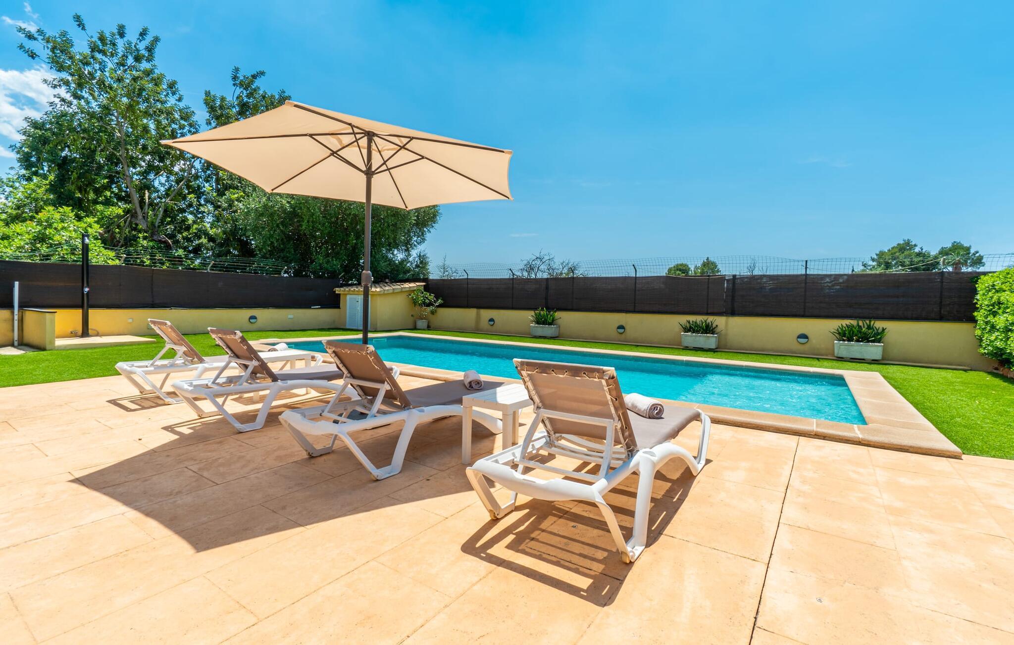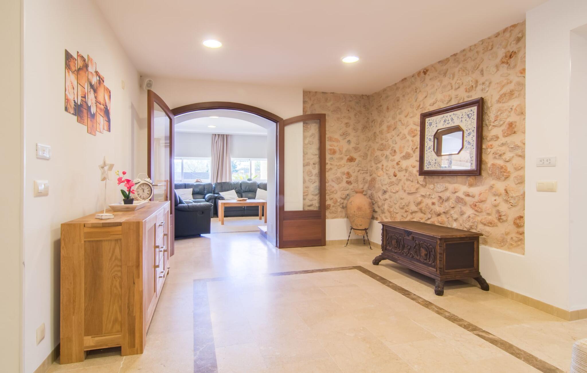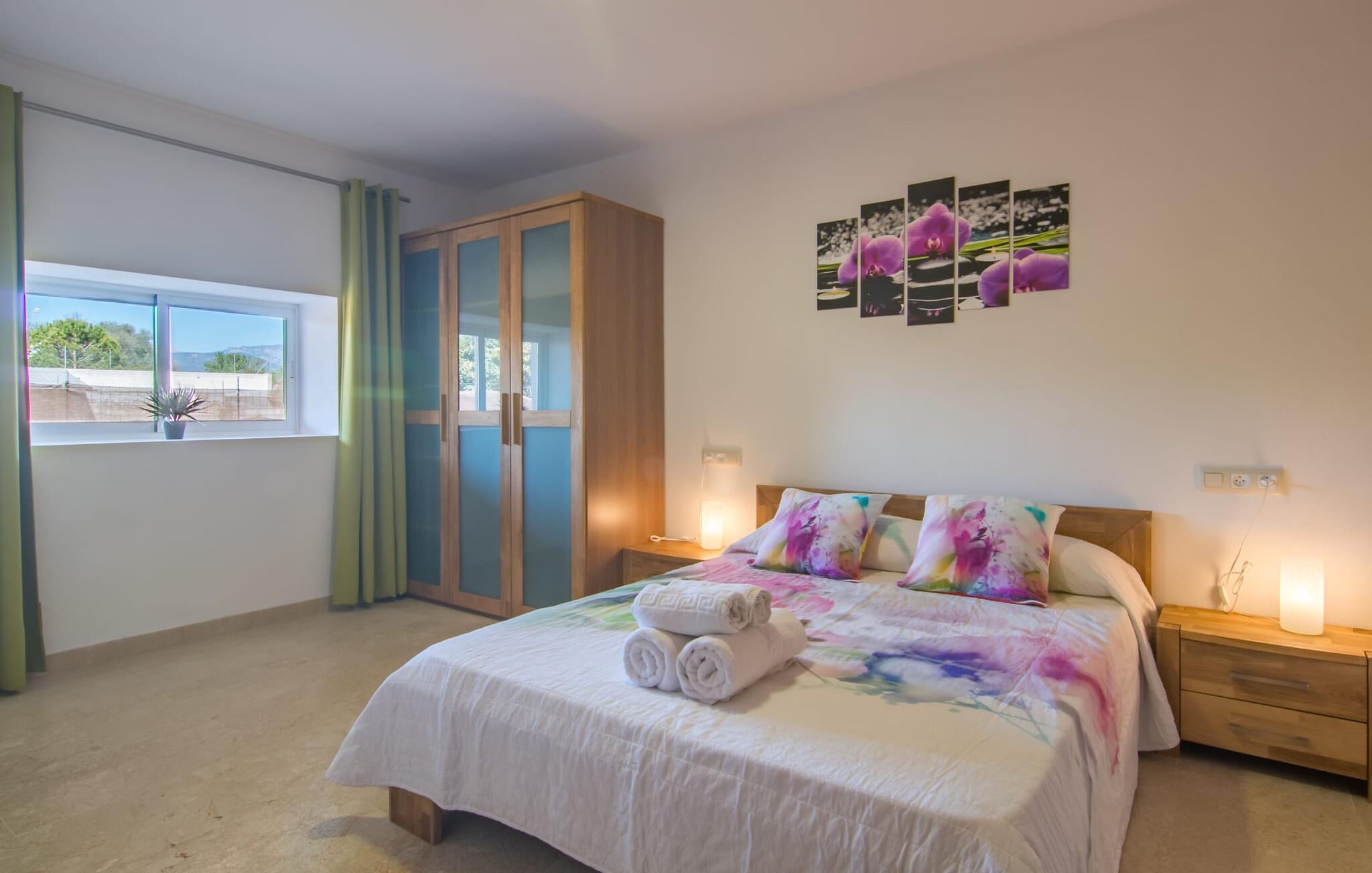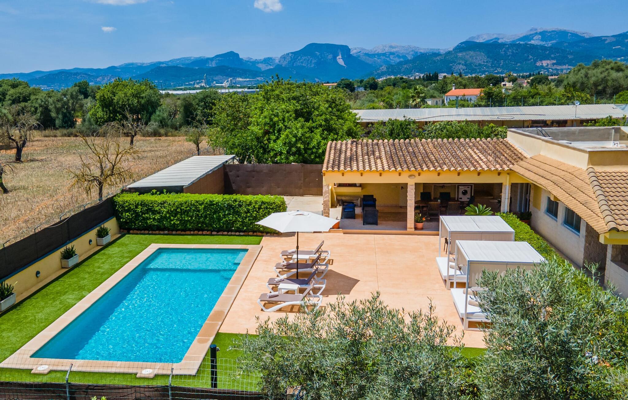 Die Villa „Can Just“ ist ein komfortables Feriendomizil im Grünen: Im Zentrum der Insel gelegen, nur etwa 4,6 km von Inca entfernt, überzeugt das gepflegte, ebenerdige Haus nicht nur mit einer tollen Inneneinrichtung, sondern auch mit verschiedenen überdachten Terrassenbereichen und einem großen Pool. In der ländlichen Umgebung mit den vielen weitläufigen Olivenhainen können Sie herrliche Spaziergänge unternehmen; Für einen Tag am Strand fährt man am besten die 28,9 km nach Alcúdia.