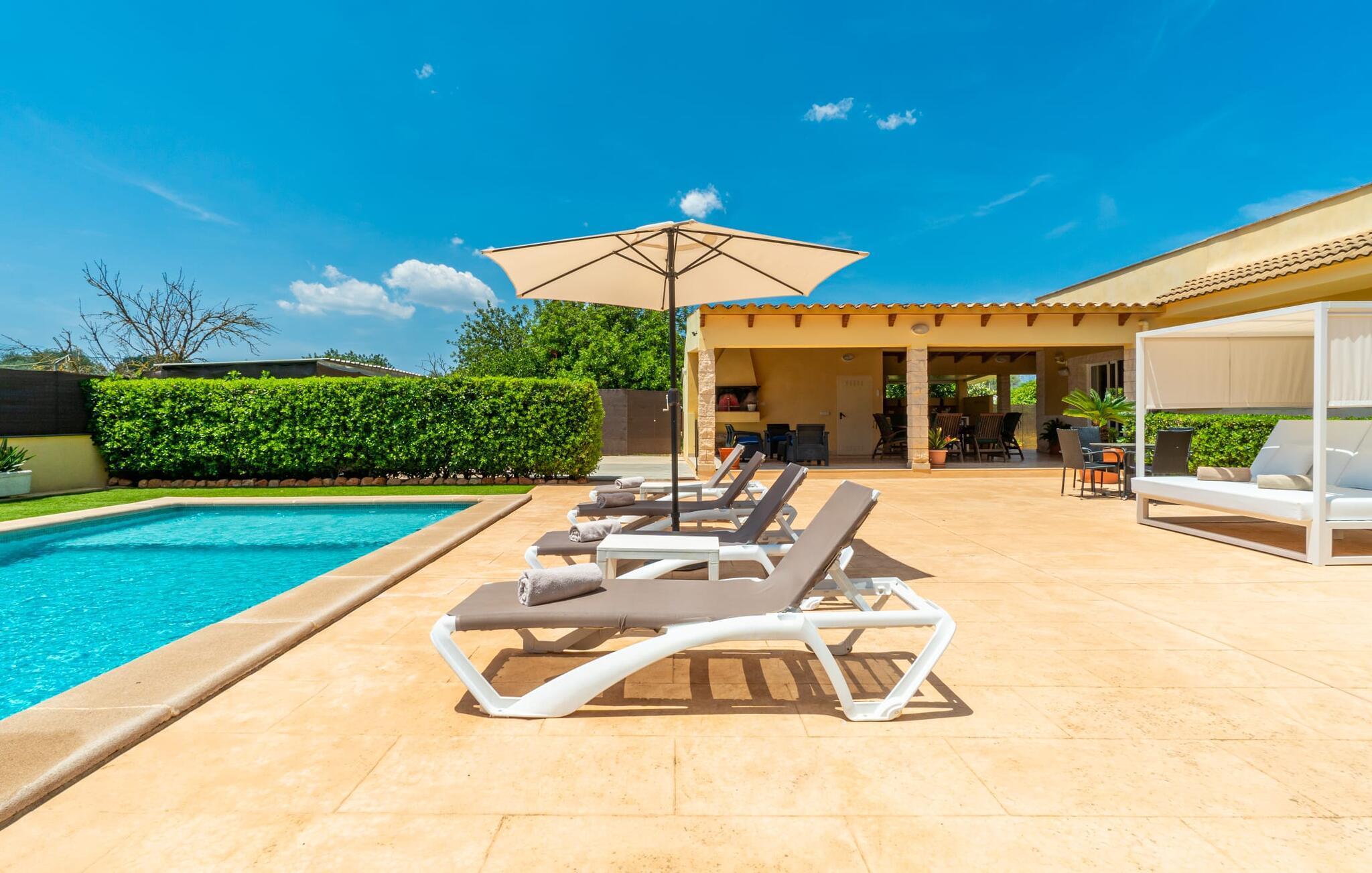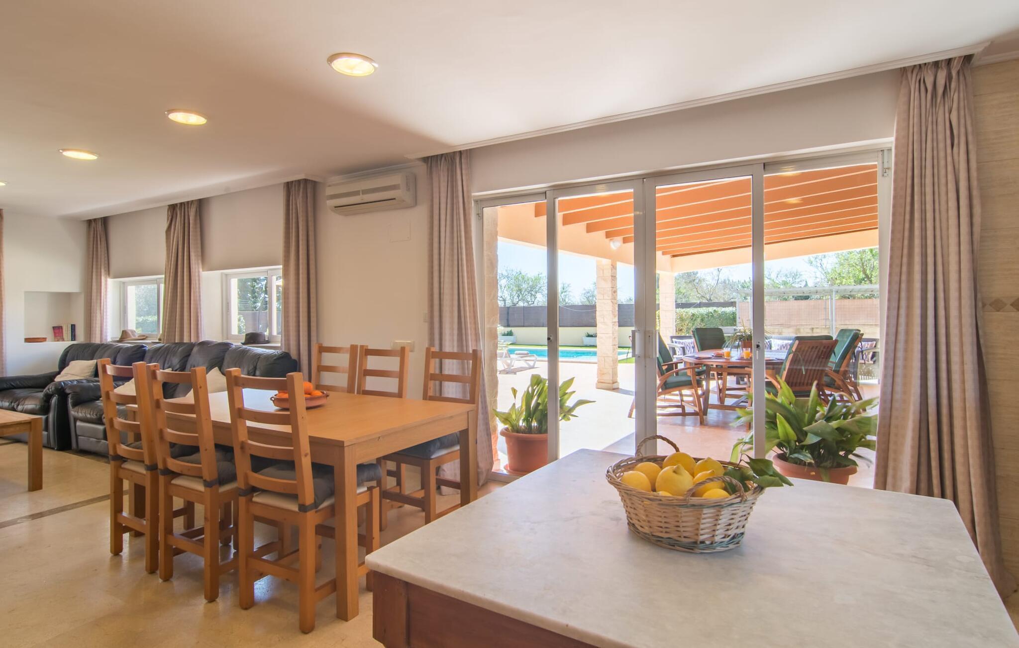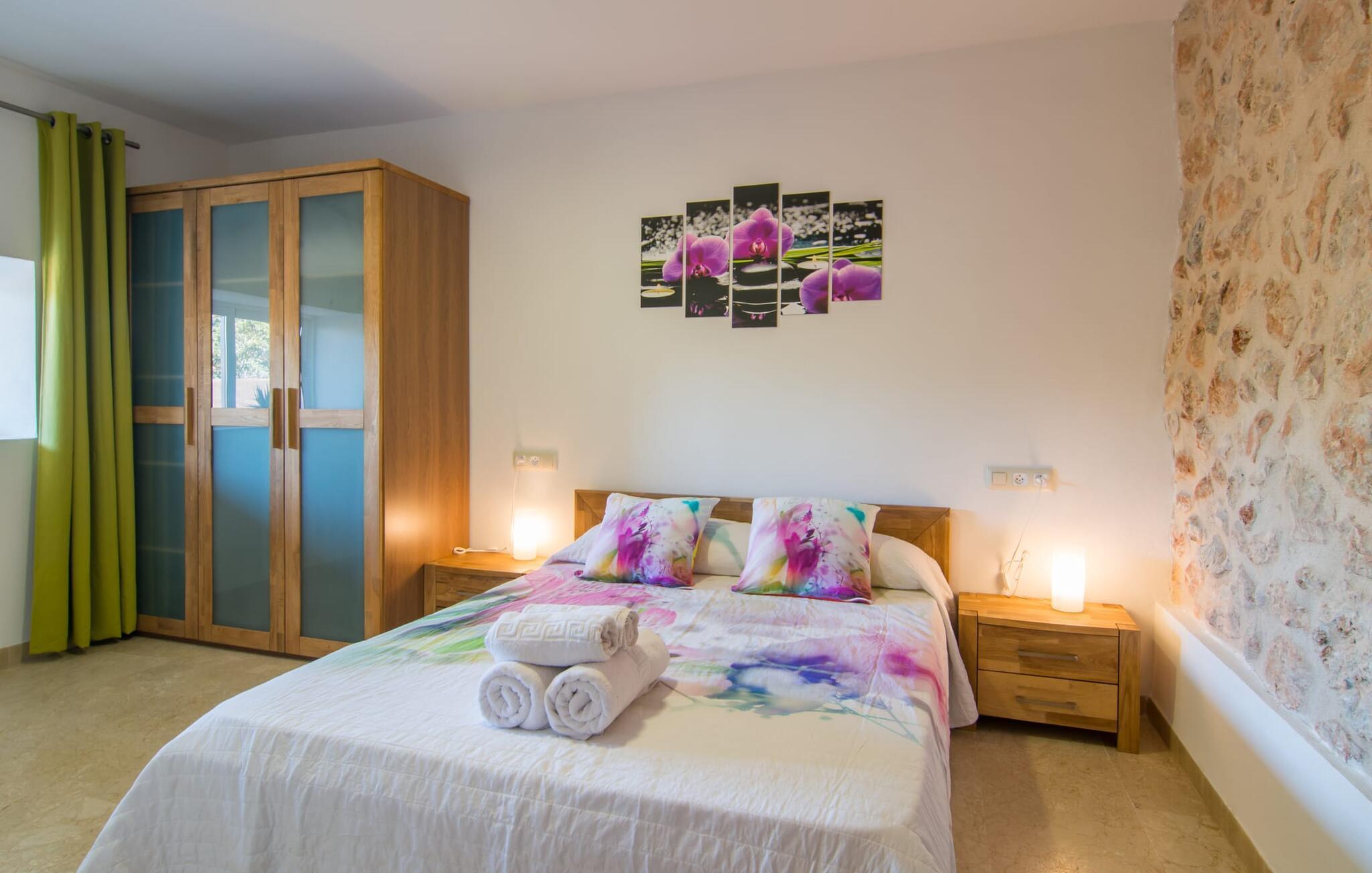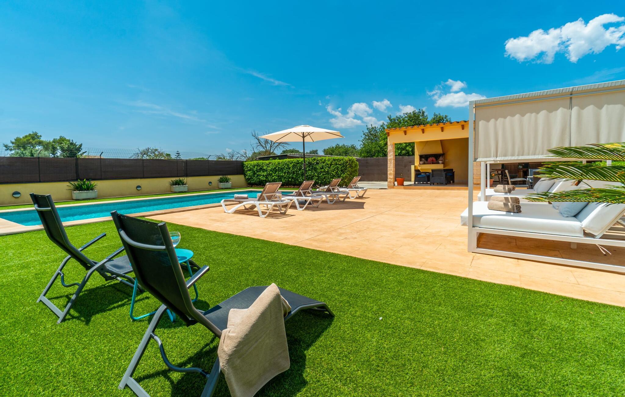 Die Villa „Can Just“ ist ein komfortables Feriendomizil im Grünen: Im Zentrum der Insel gelegen, nur etwa 4,6 km von Inca entfernt, überzeugt das gepflegte, ebenerdige Haus nicht nur mit einer tollen Inneneinrichtung, sondern auch mit verschiedenen überdachten Terrassenbereichen und einem großen Pool. In der ländlichen Umgebung mit den vielen weitläufigen Olivenhainen können Sie herrliche Spaziergänge unternehmen; Für einen Tag am Strand fährt man am besten die 28,9 km nach Alcúdia.