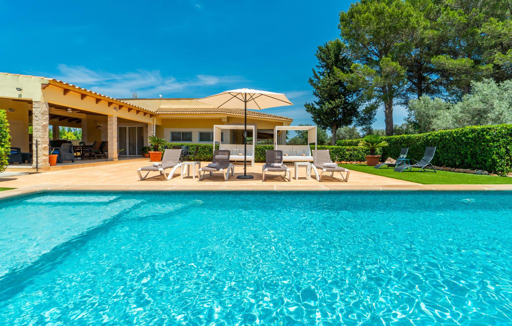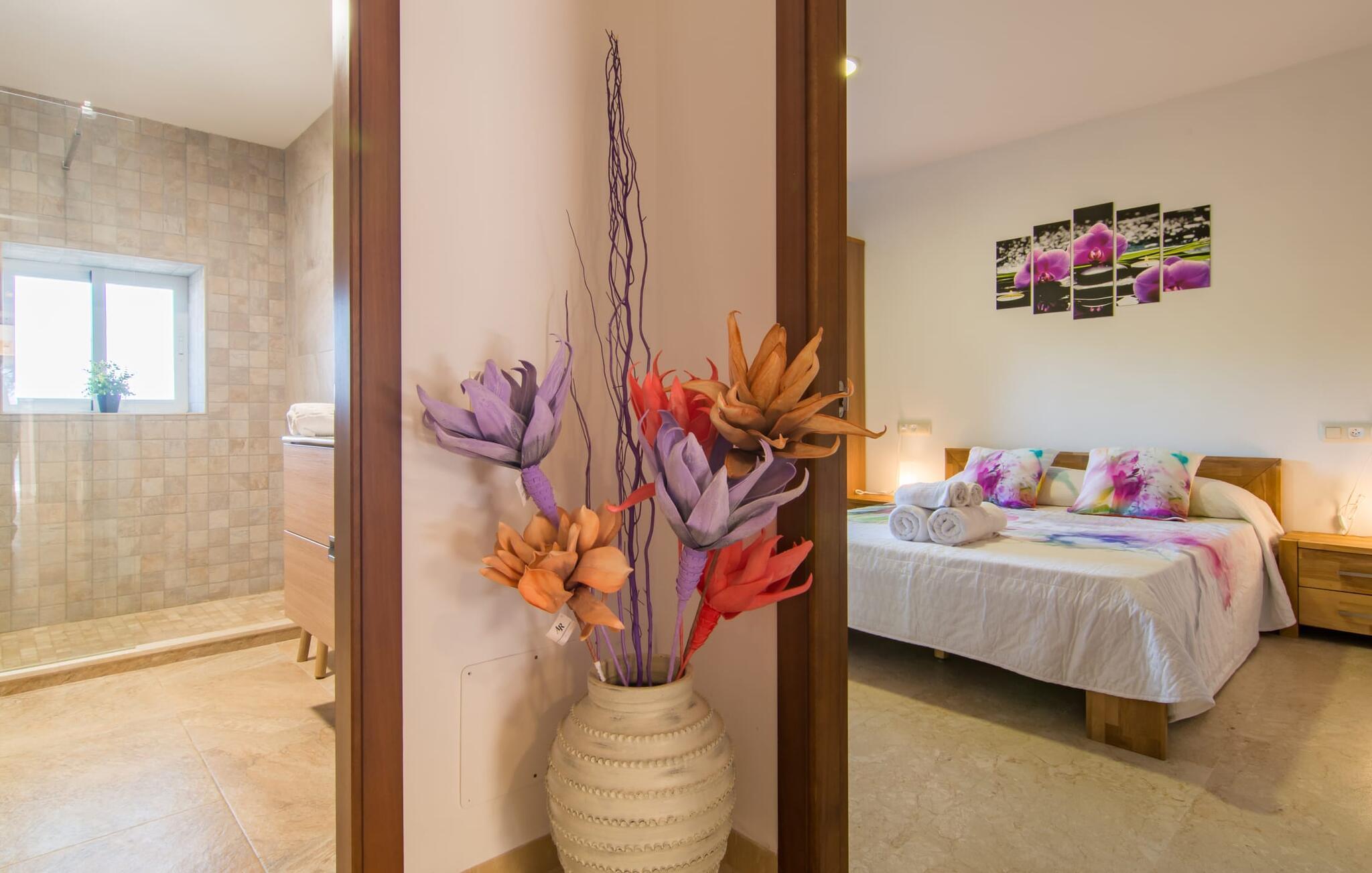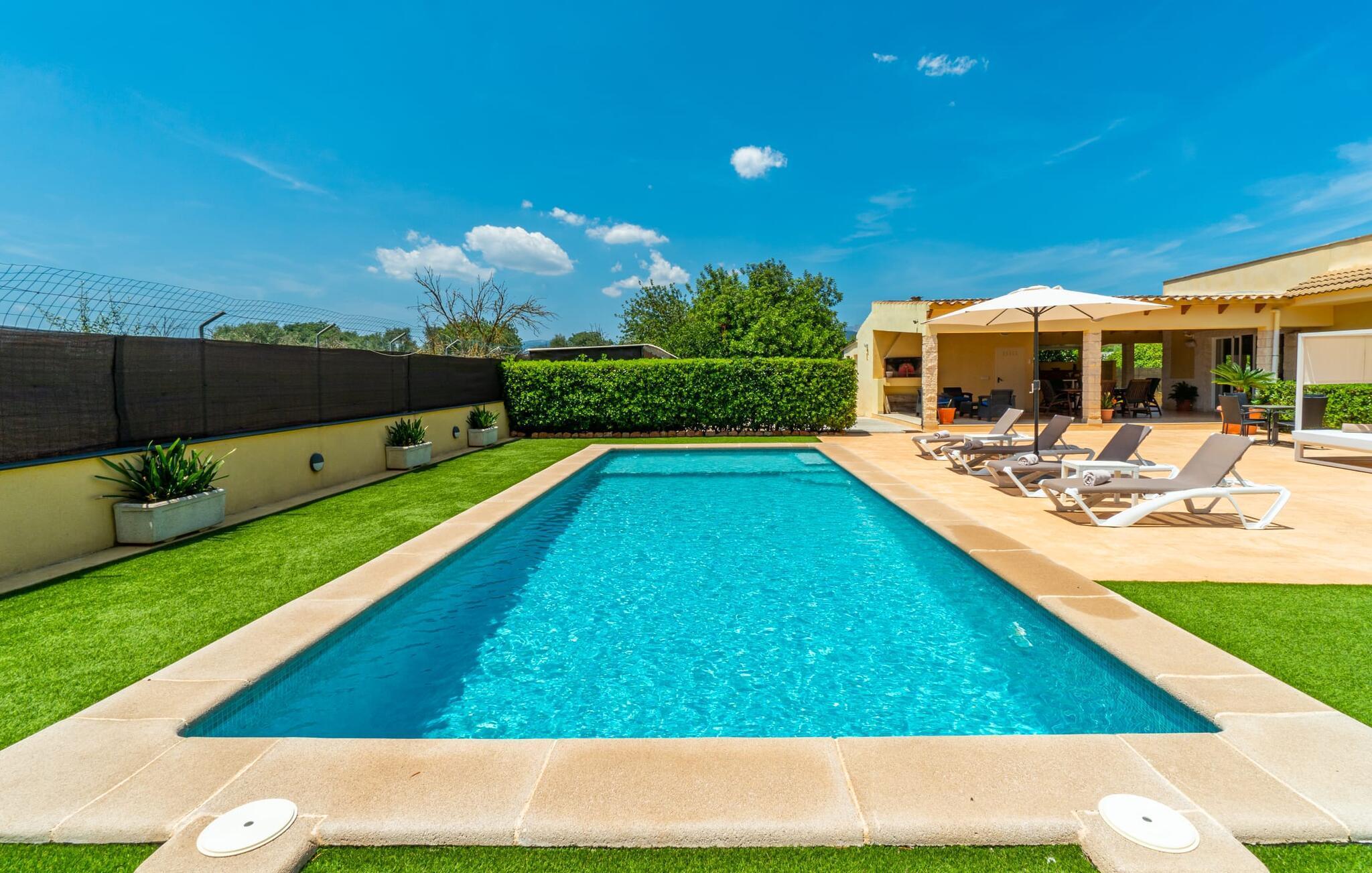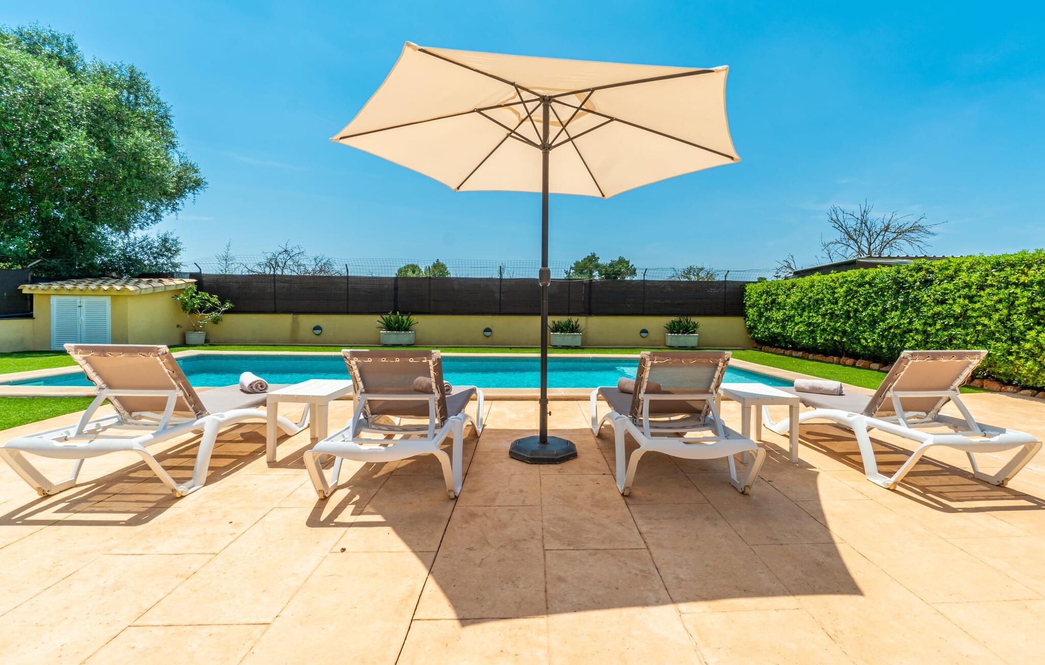 Die Villa „Can Just“ ist ein komfortables Feriendomizil im Grünen: Im Zentrum der Insel gelegen, nur etwa 4,6 km von Inca entfernt, überzeugt das gepflegte, ebenerdige Haus nicht nur mit einer tollen Inneneinrichtung, sondern auch mit verschiedenen überdachten Terrassenbereichen und einem großen Pool. In der ländlichen Umgebung mit den vielen weitläufigen Olivenhainen können Sie herrliche Spaziergänge unternehmen; Für einen Tag am Strand fährt man am besten die 28,9 km nach Alcúdia.