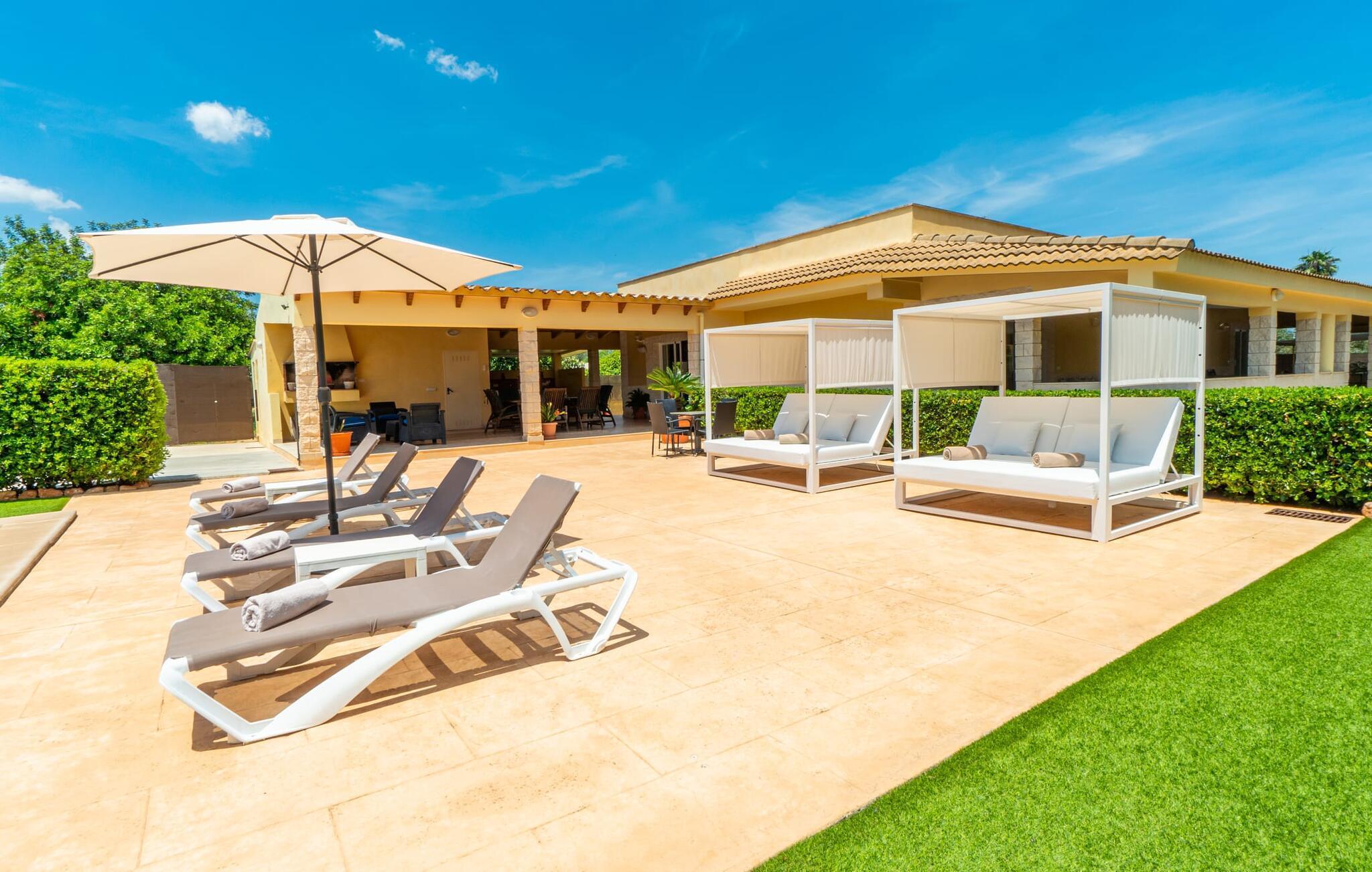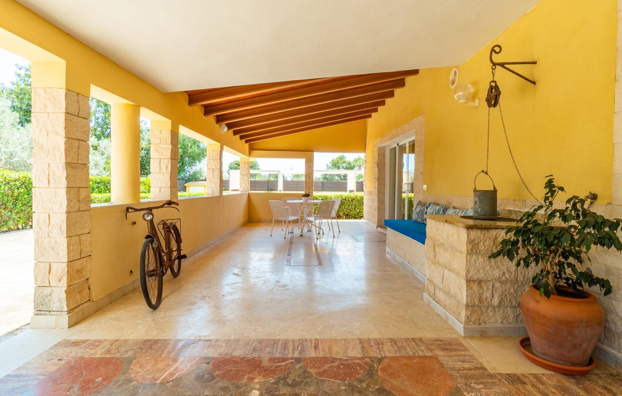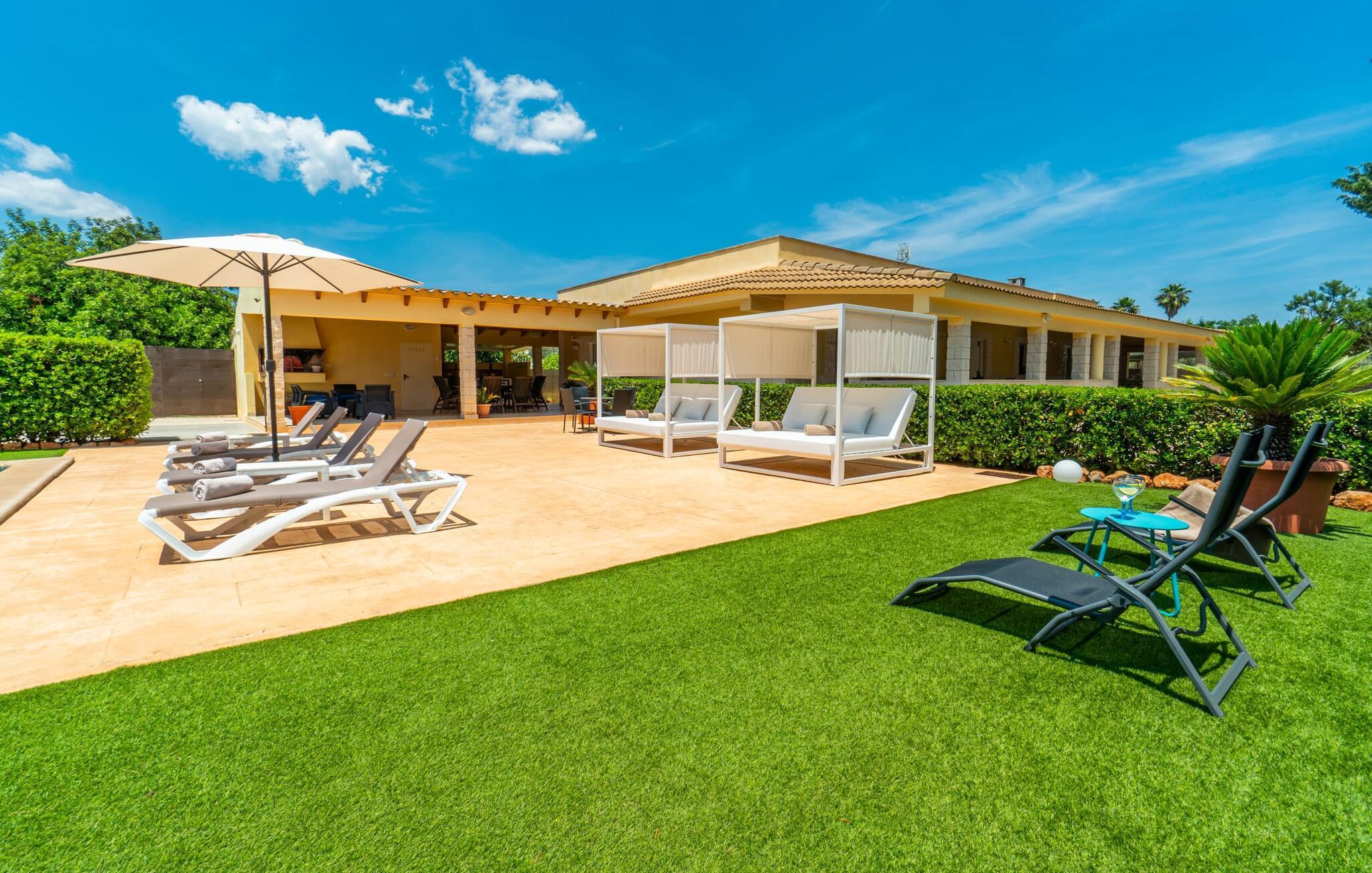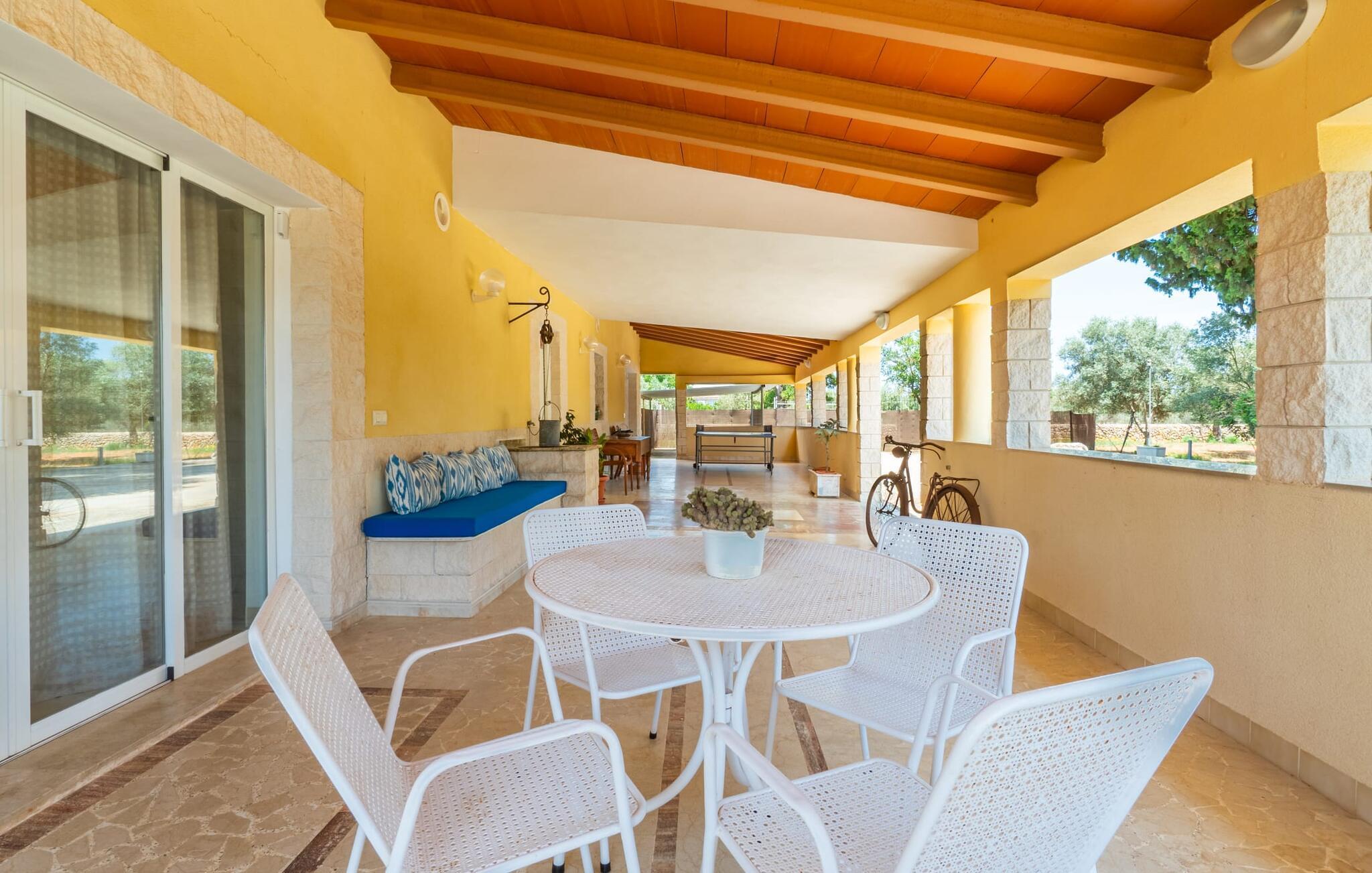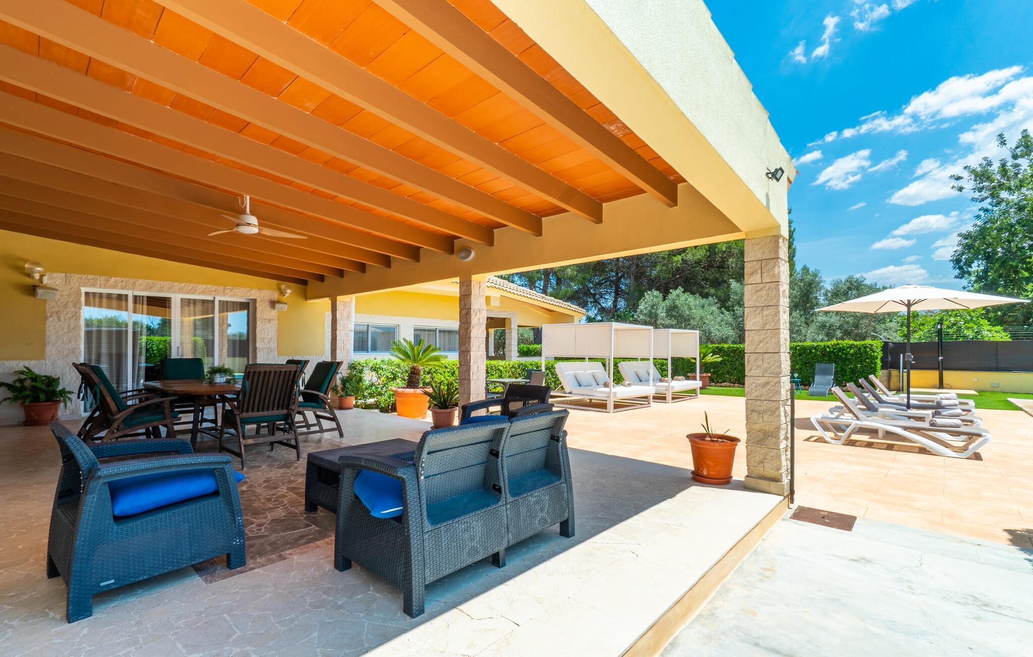 Die Villa „Can Just“ erstrahlt in sonnigem Gelb, kombiniert mit rustikalen Natursteinen, in der Nähe von Inca in der Mitte der Insel. Das neu erbaute, ebenerdige Haus verfügt über einen einladenden, gepflegten Außenbereich. In seiner Mitte befindet sich der große, rechteckige Pool mit Außendusche, umgeben von einer gepflasterten Sonnenterrasse und einem Kunstrasen mit vielen bequemen Liegen und einem schattenspendenden Sonnenschirm. Hier ist absolute Privatsphäre gewährleistet, außerdem gibt es viel Platz für Kinder zum Planschen und Erwachsene zum Schwimmen. Besonders schön sind die überdachten Terrassenflächen rund um das Haus. Mit der Außenküche und dem Außenbad können Sie Ihr Urlaubsleben fast vollständig ins Freie verlegen. Sitz- und Entspannungsmöglichkeiten gibt es reichlich: von gemütlichen Outdoor-Loungemöbeln über eine hübsche Steinbank mit bequemen Kissen bis hin zum großen Esstisch mit passenden Stühlen. Und wenn Sie die Herausforderung suchen, können Sie am hauseigenen Tisch eine Partie Tischtennis gegen Ihre Mitreisenden spielen.