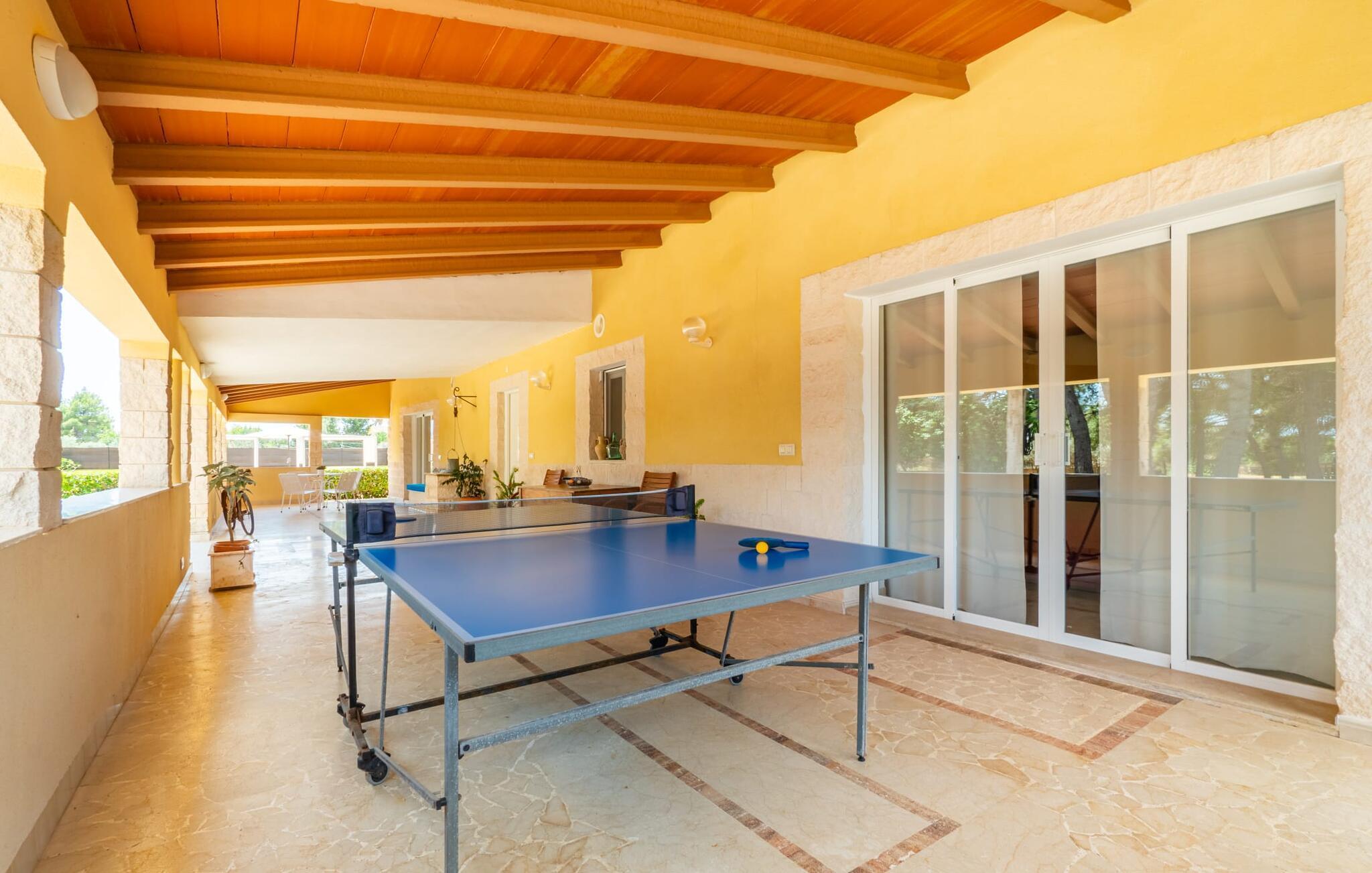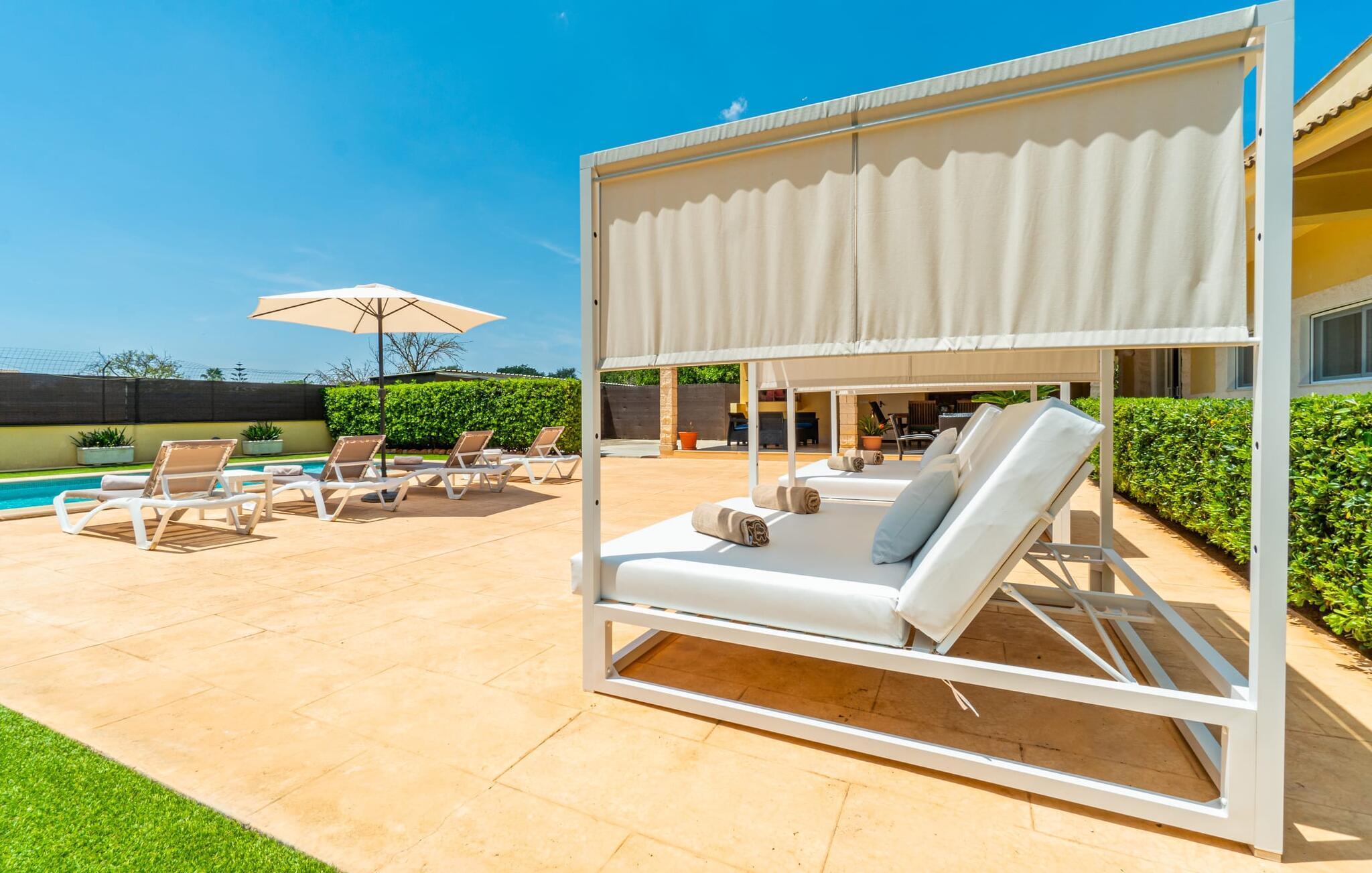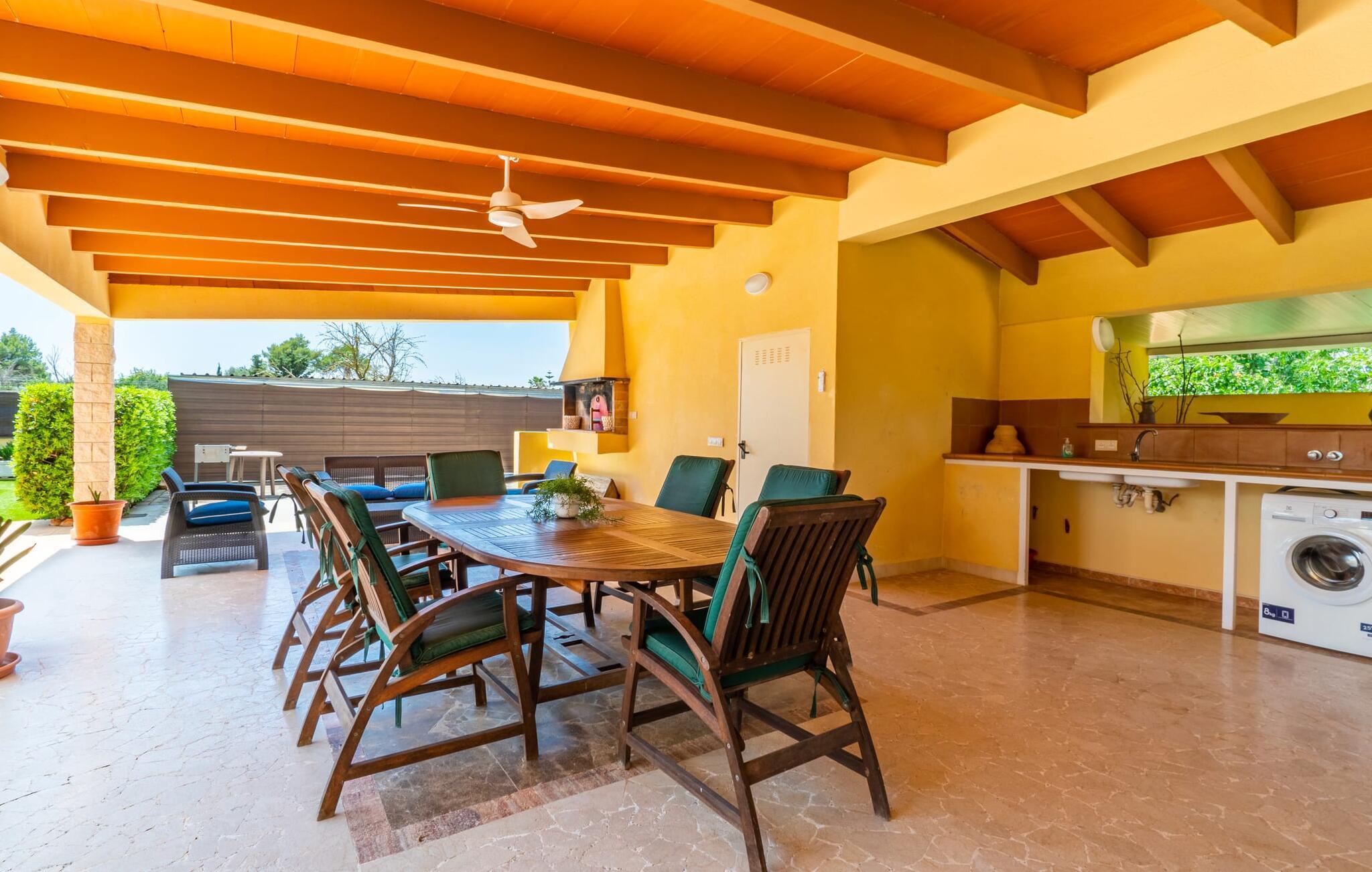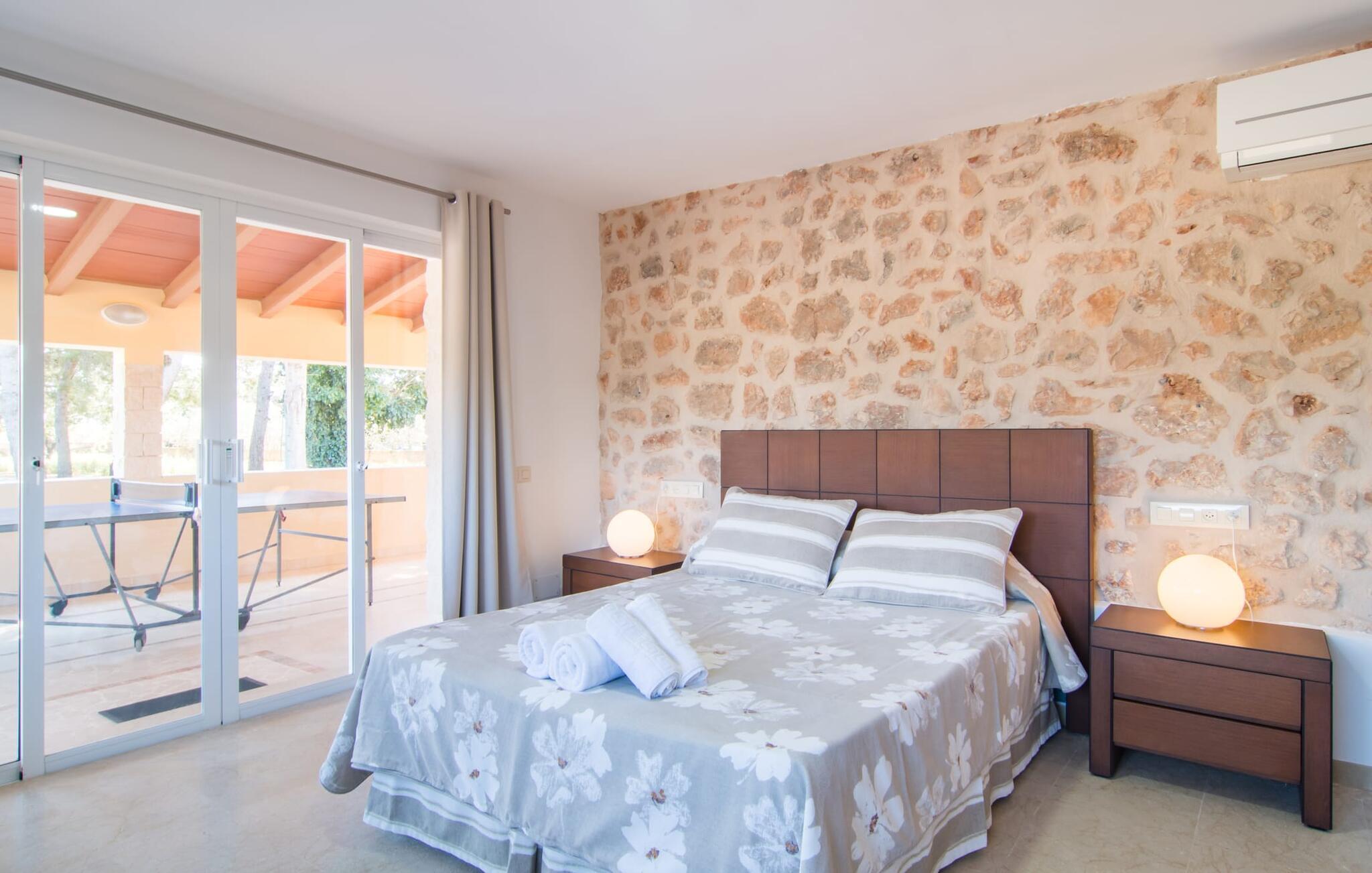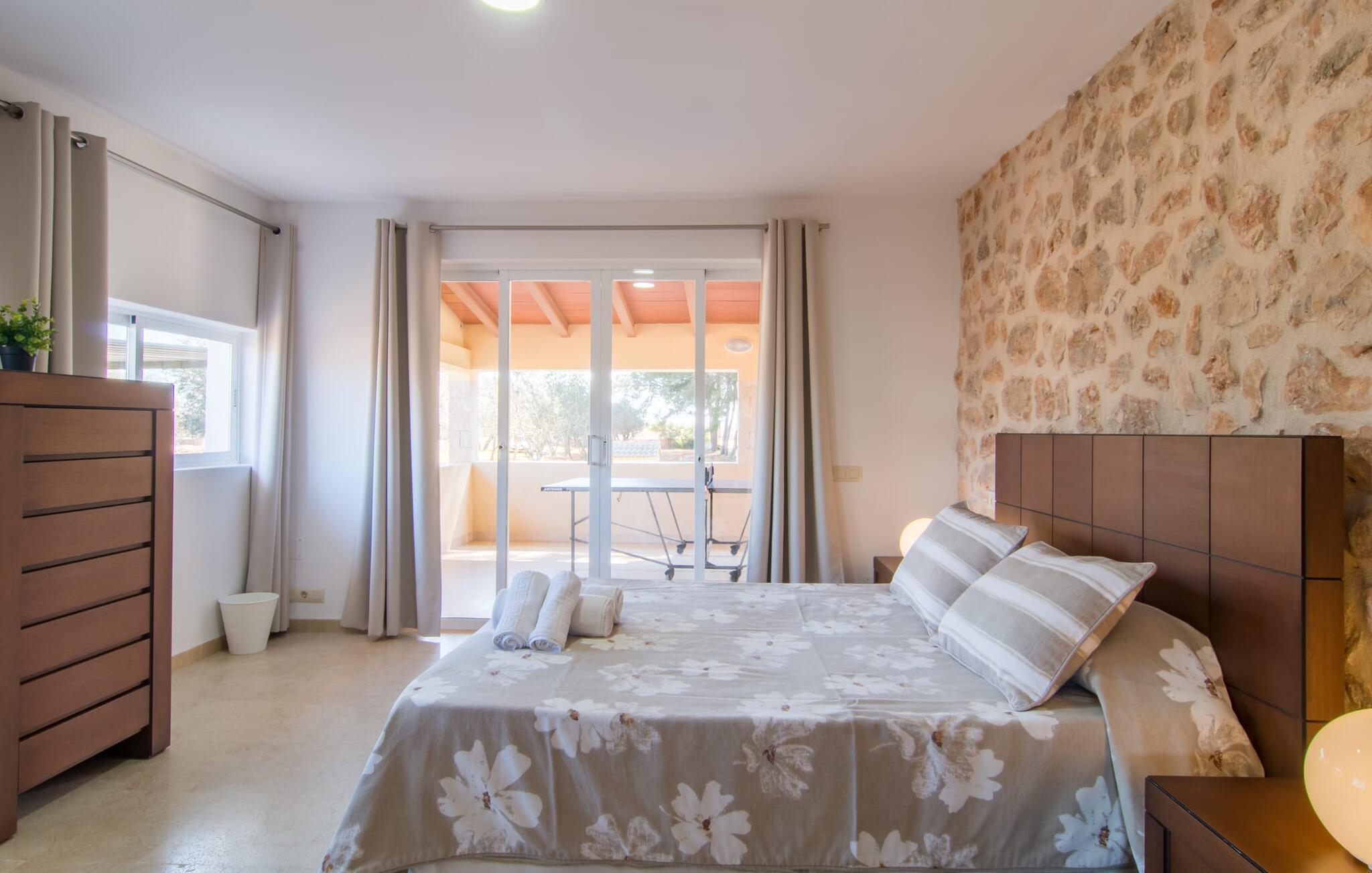 Die Villa „Can Just“ erstrahlt in sonnigem Gelb, kombiniert mit rustikalen Natursteinen, in der Nähe von Inca in der Mitte der Insel. Das neu erbaute, ebenerdige Haus verfügt über einen einladenden, gepflegten Außenbereich. In seiner Mitte befindet sich der große, rechteckige Pool mit Außendusche, umgeben von einer gepflasterten Sonnenterrasse und einem Kunstrasen mit vielen bequemen Liegen und einem schattenspendenden Sonnenschirm. Hier ist absolute Privatsphäre gewährleistet, außerdem gibt es viel Platz für Kinder zum Planschen und Erwachsene zum Schwimmen. Besonders schön sind die überdachten Terrassenflächen rund um das Haus. Mit der Außenküche und dem Außenbad können Sie Ihr Urlaubsleben fast vollständig ins Freie verlegen. Sitz- und Entspannungsmöglichkeiten gibt es reichlich: von gemütlichen Outdoor-Loungemöbeln über eine hübsche Steinbank mit bequemen Kissen bis hin zum großen Esstisch mit passenden Stühlen. Und wenn Sie die Herausforderung suchen, können Sie am hauseigenen Tisch eine Partie Tischtennis gegen Ihre Mitreisenden spielen.